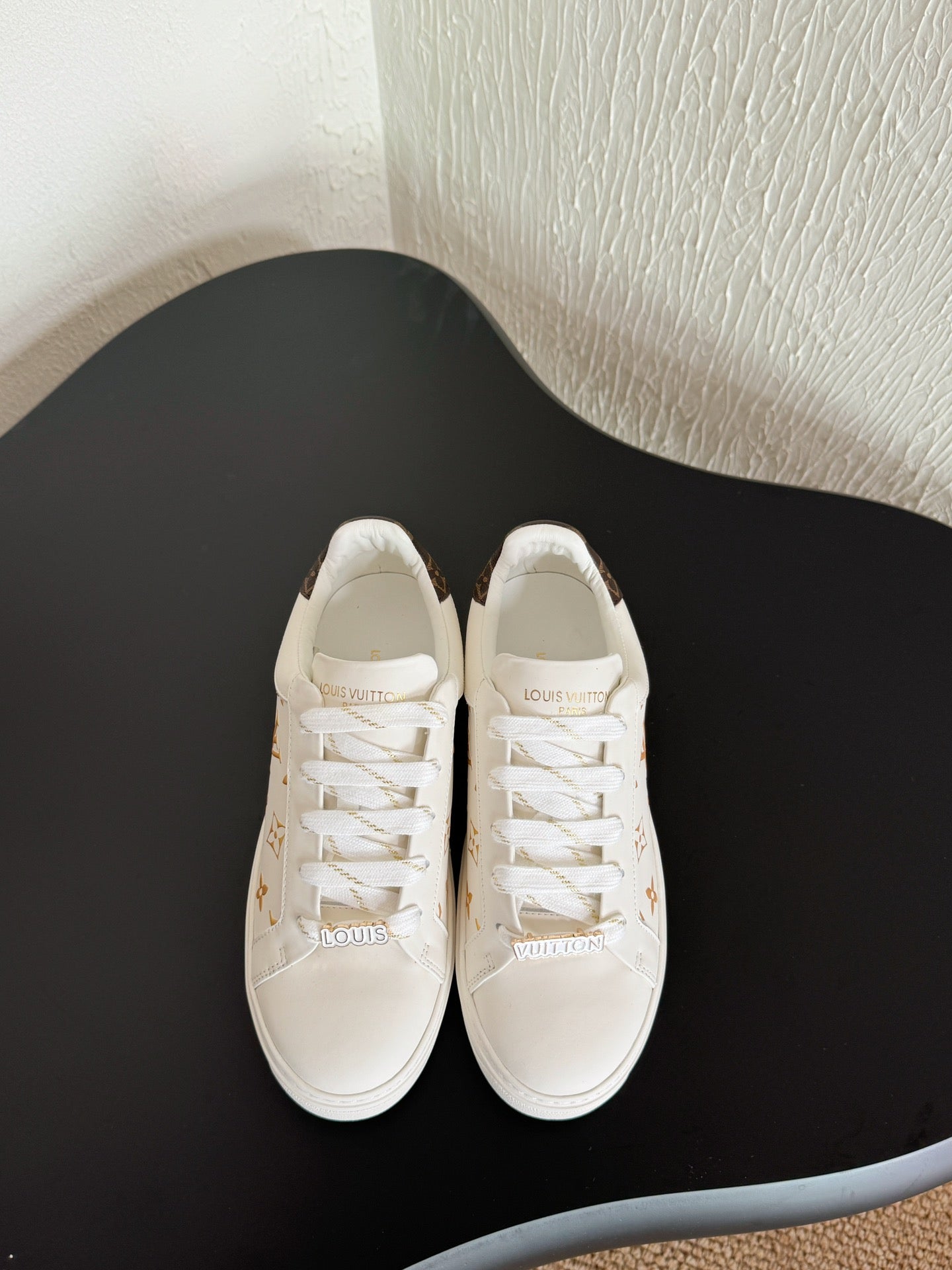 LV Sneakers Time Out White Shoes Gold Monogram Calfskin