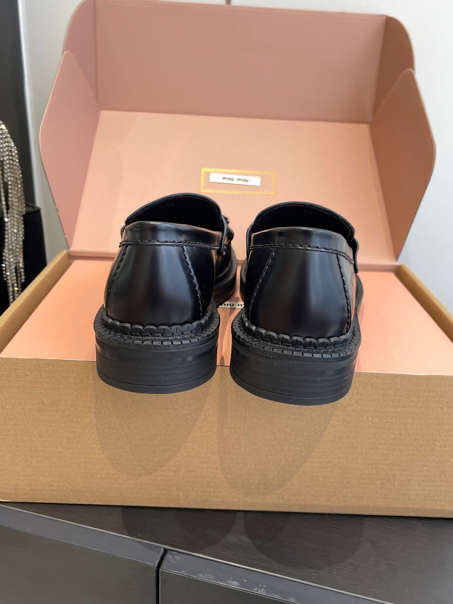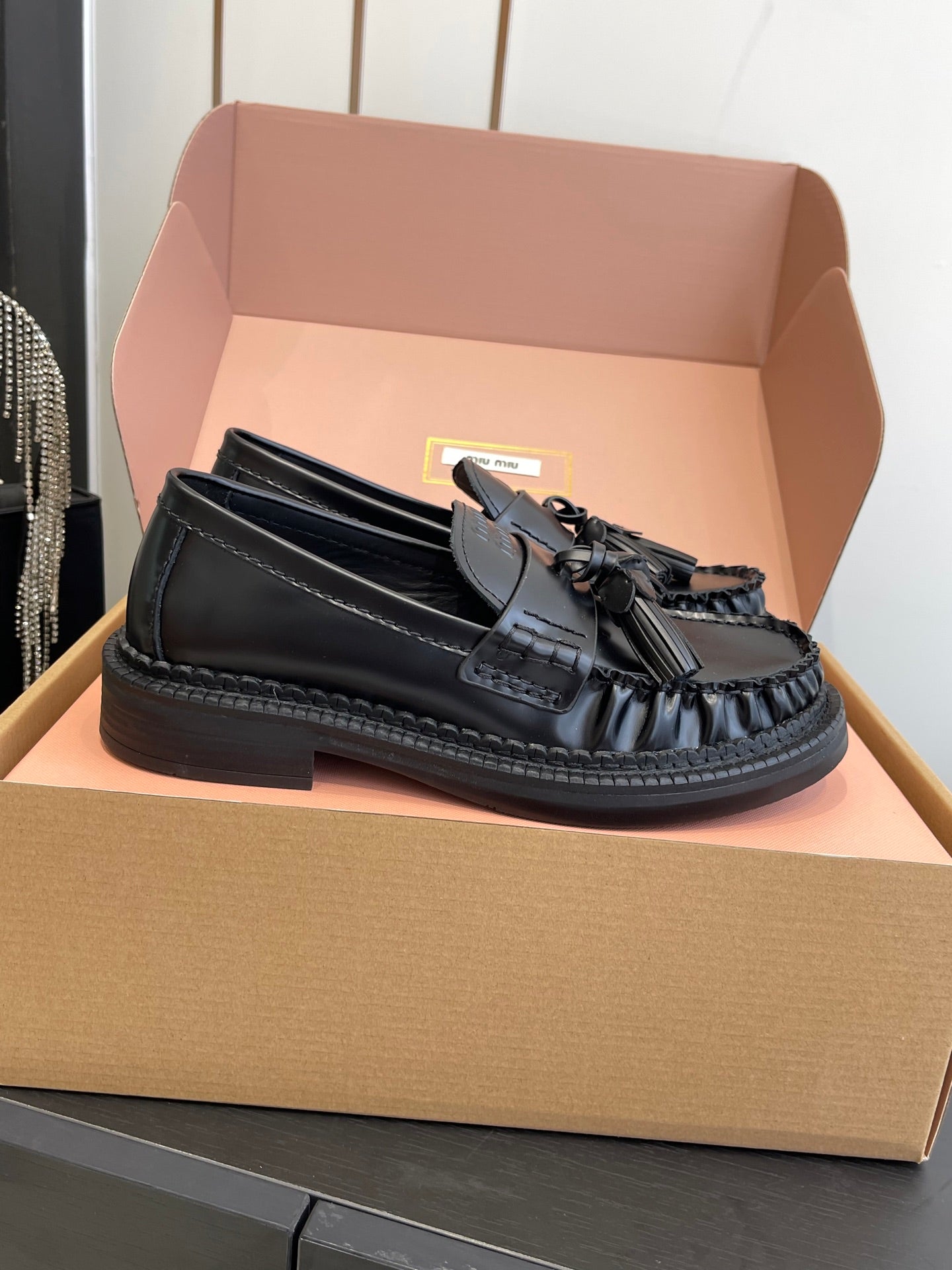 Miu Tassel Loafers Black Polished Leather 490950