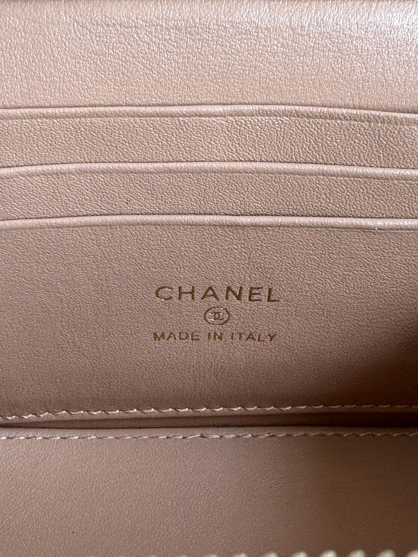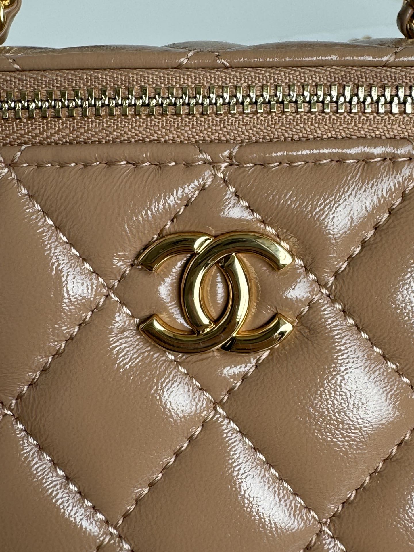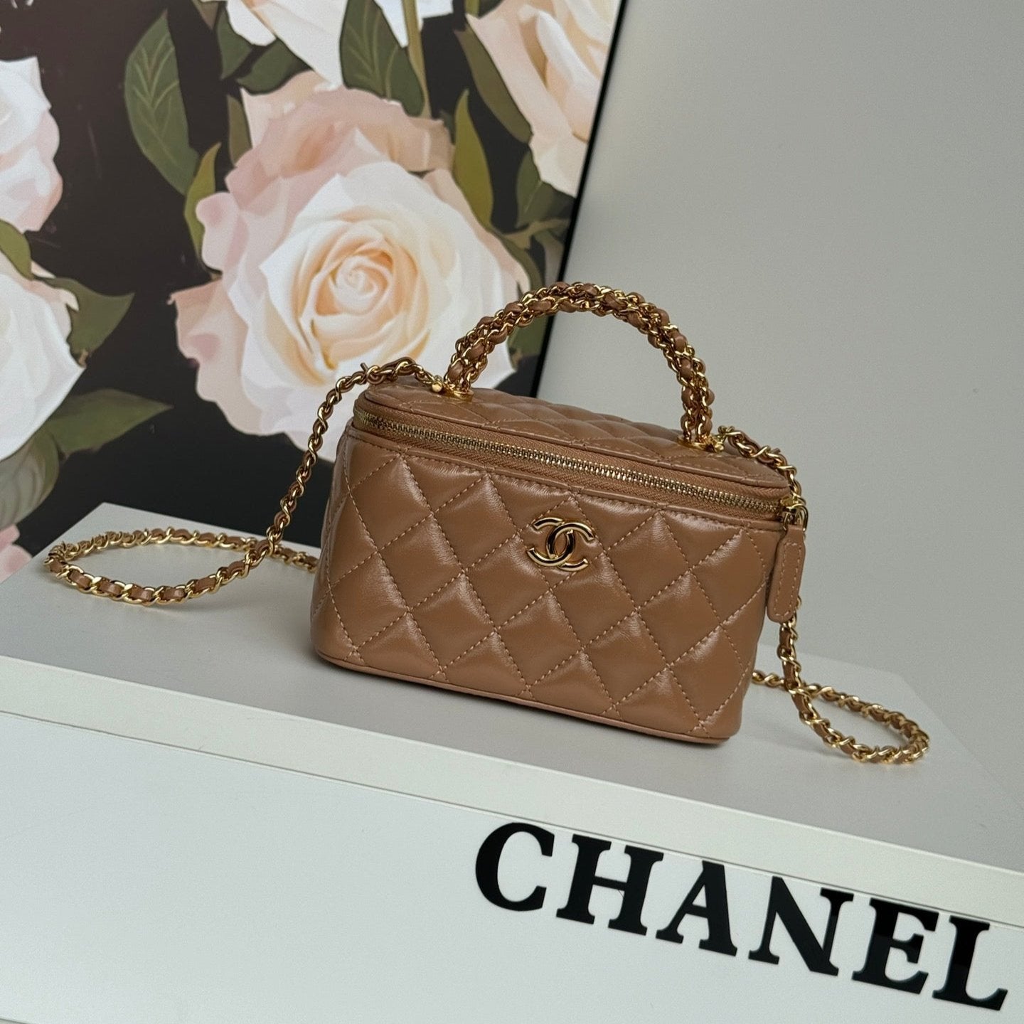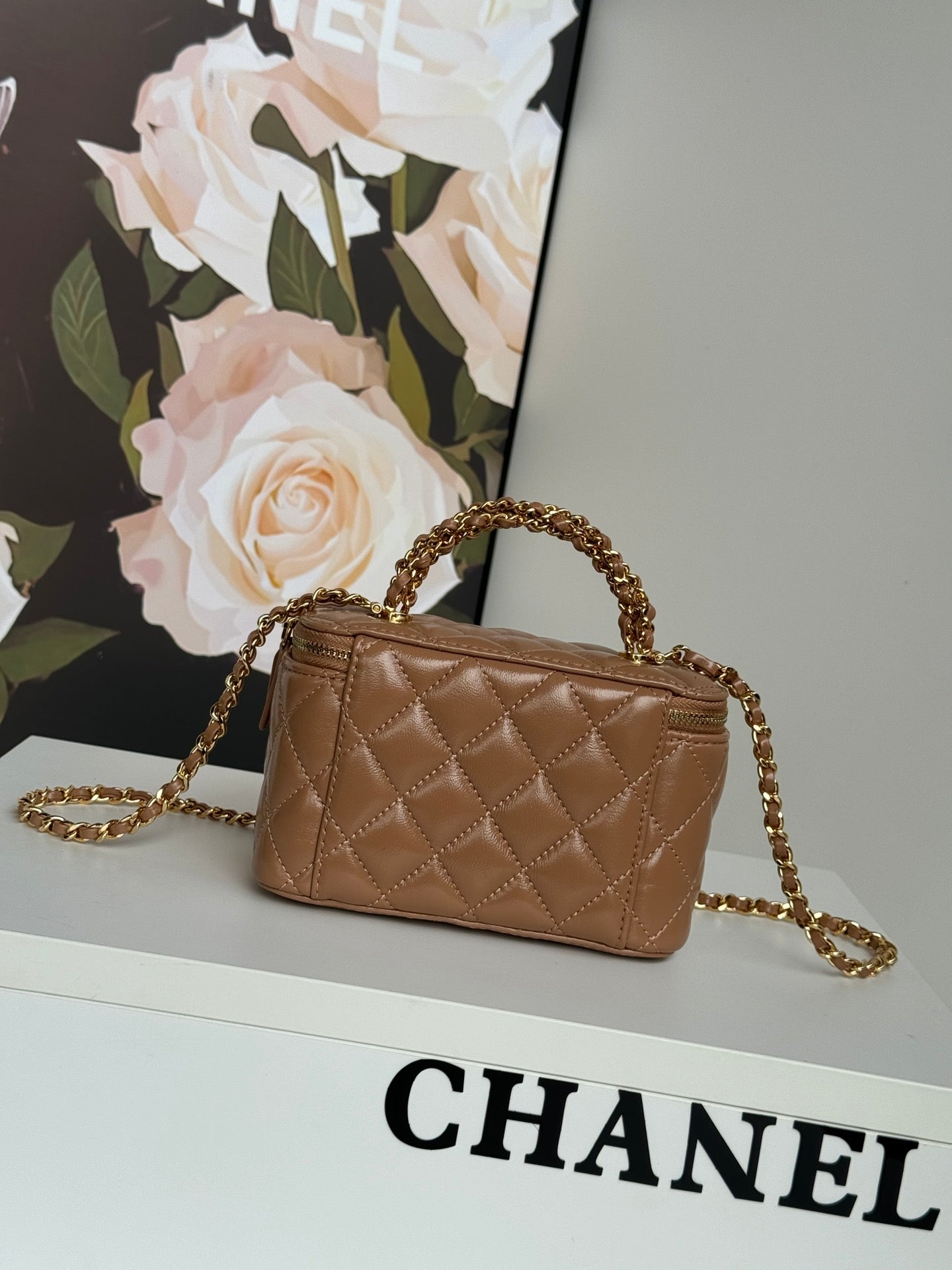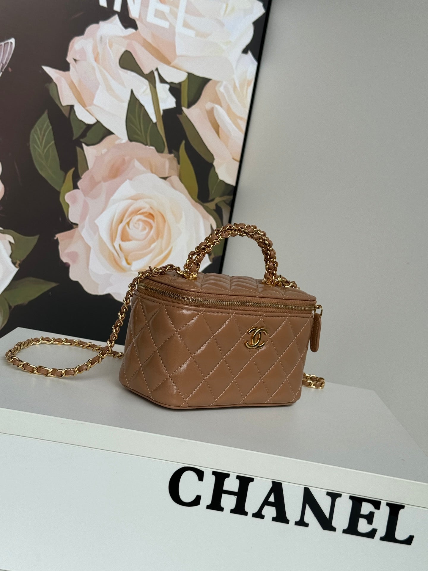 SMALL VANITY CASE 17 WITH HANDLE IN RUSSET BROWN CALFSKIN GOLD METAL CHAIN