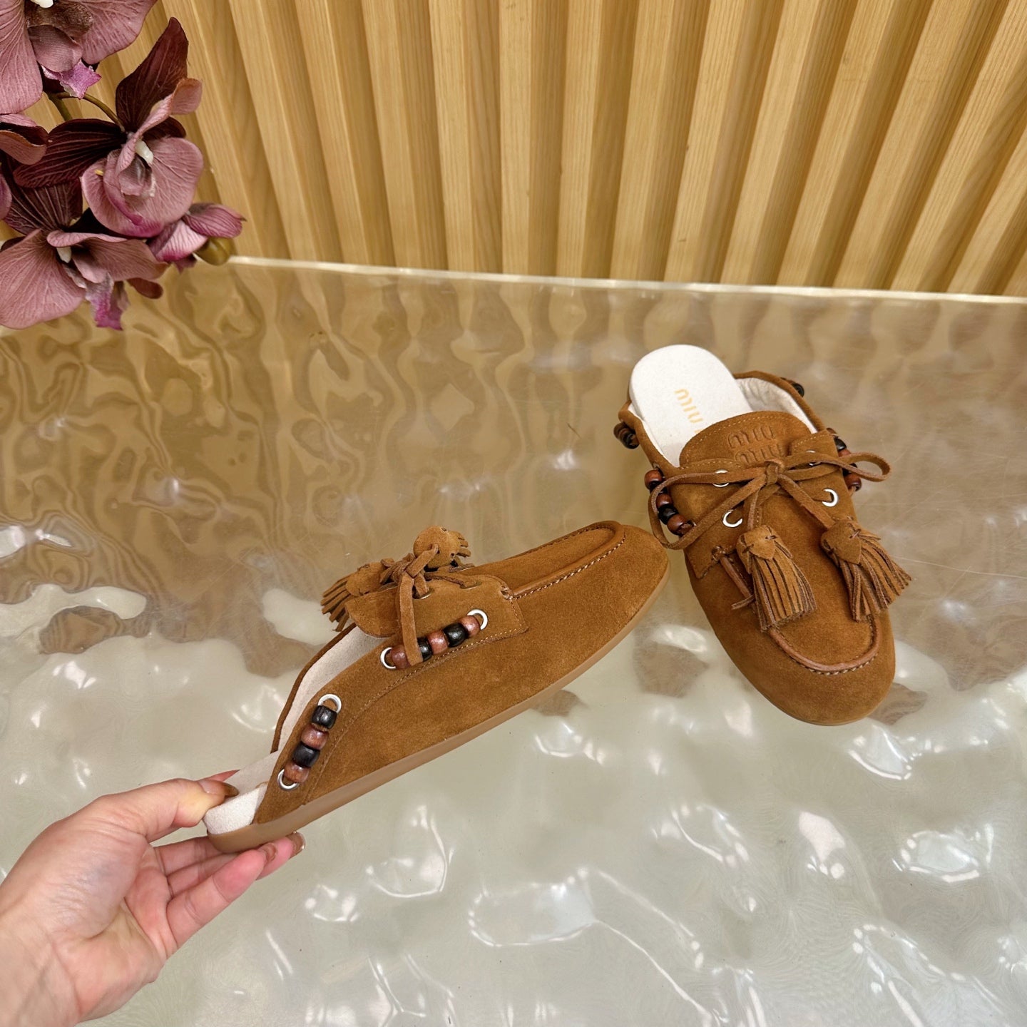 Miu Laces Eyelet Flat Half Slipper Beige Suede 498161