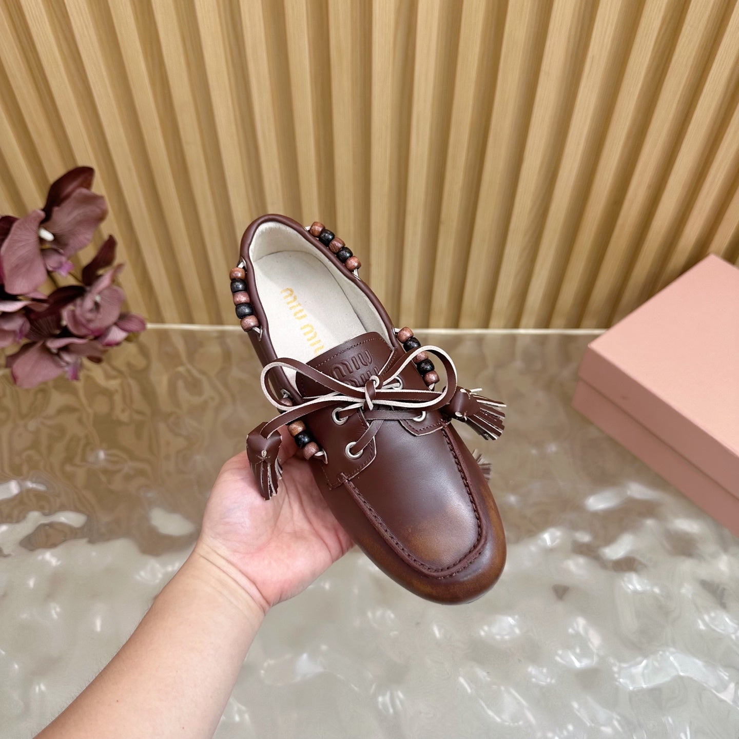 Miu Laces Eyelet Flat Loafer Deep Reddish Brown Sheepskin 498169