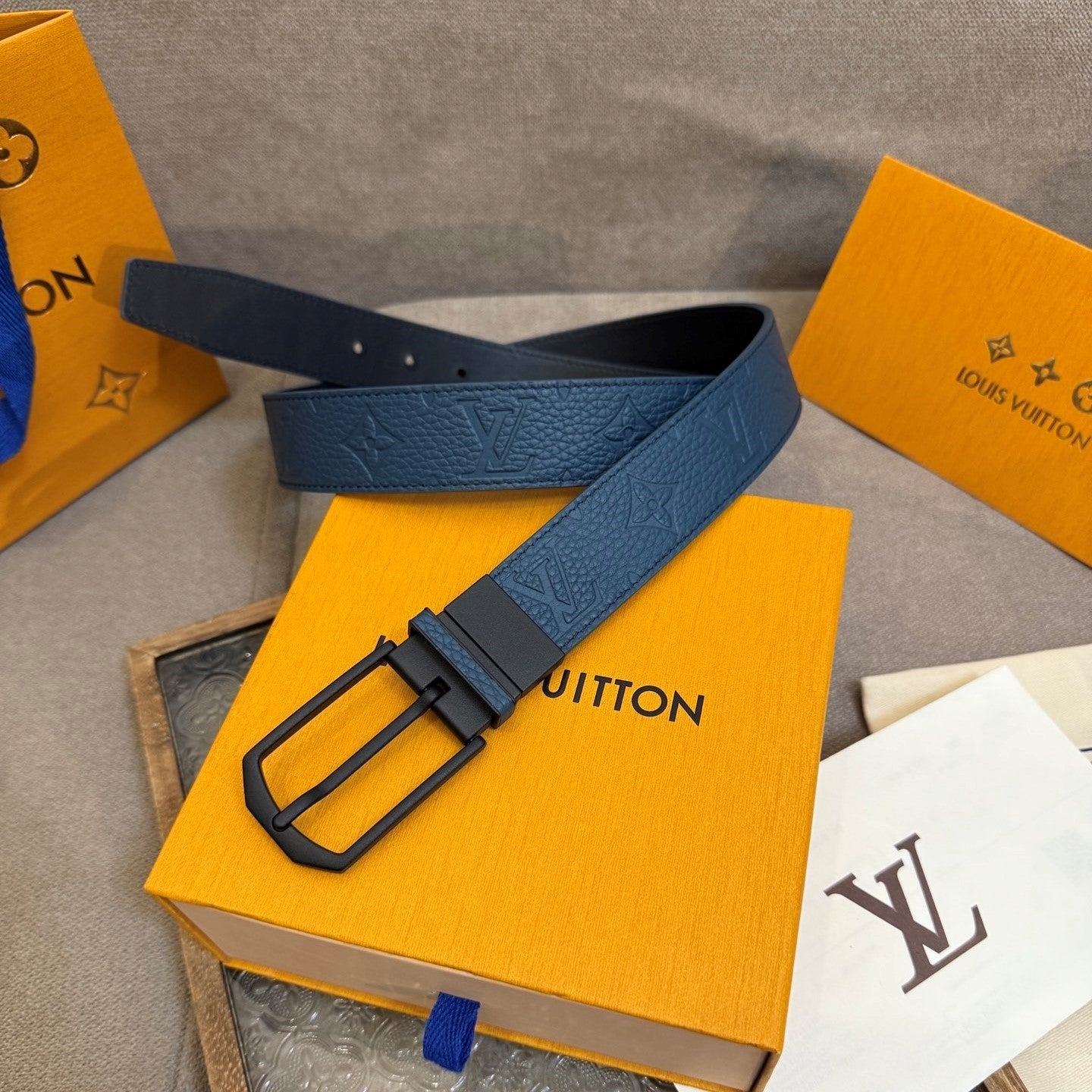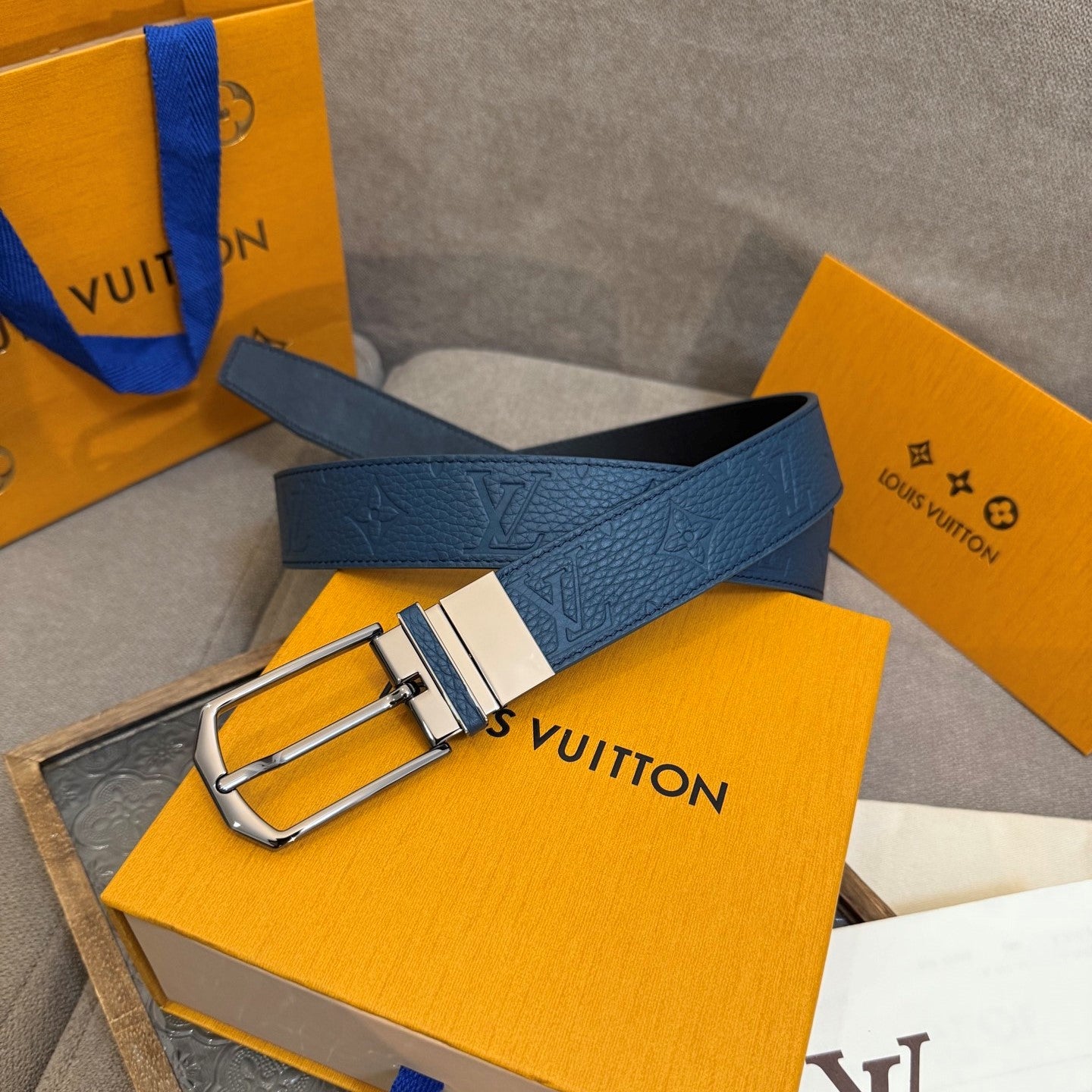 LV Slender Men Belt 35mm Deep Blue Embossed Monogram Leather Light GHW