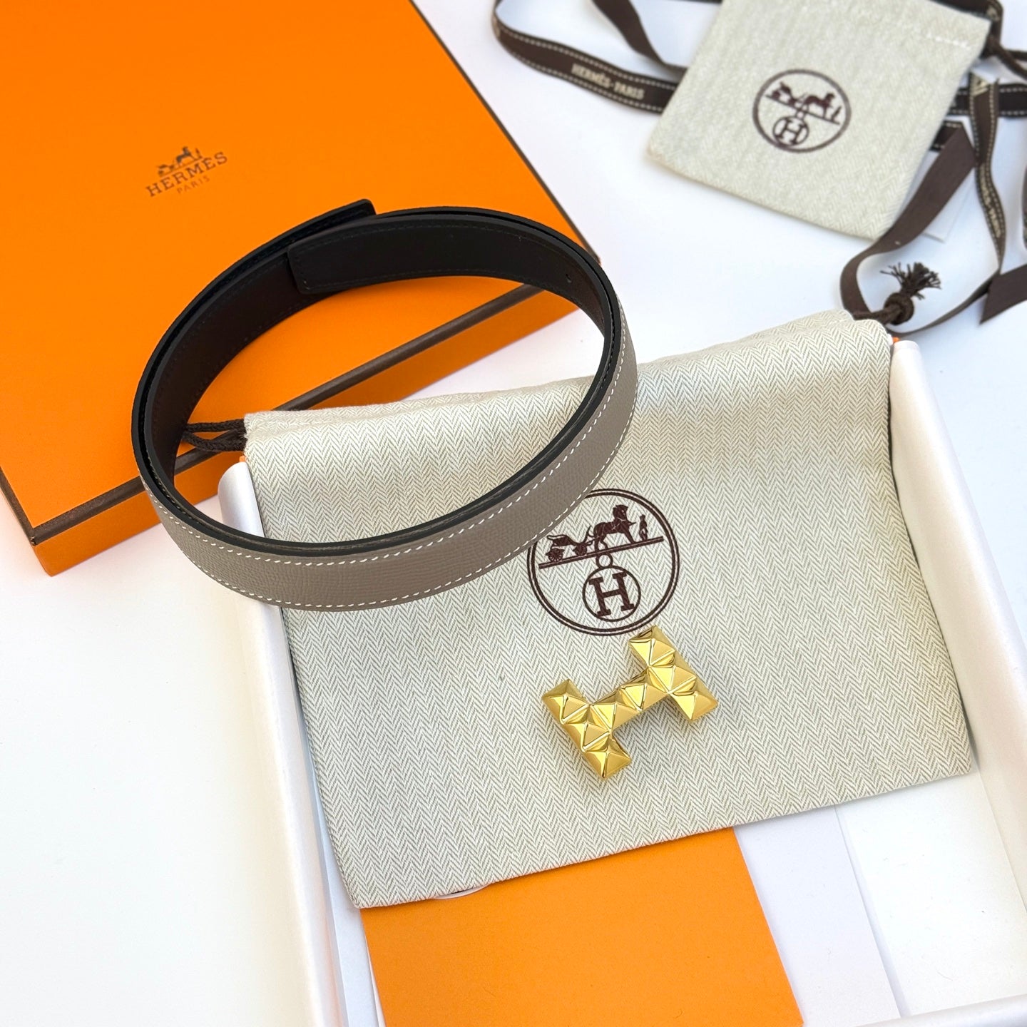 HM Silver Buckle H Belt 38mm Etoupe Calfskin 187184