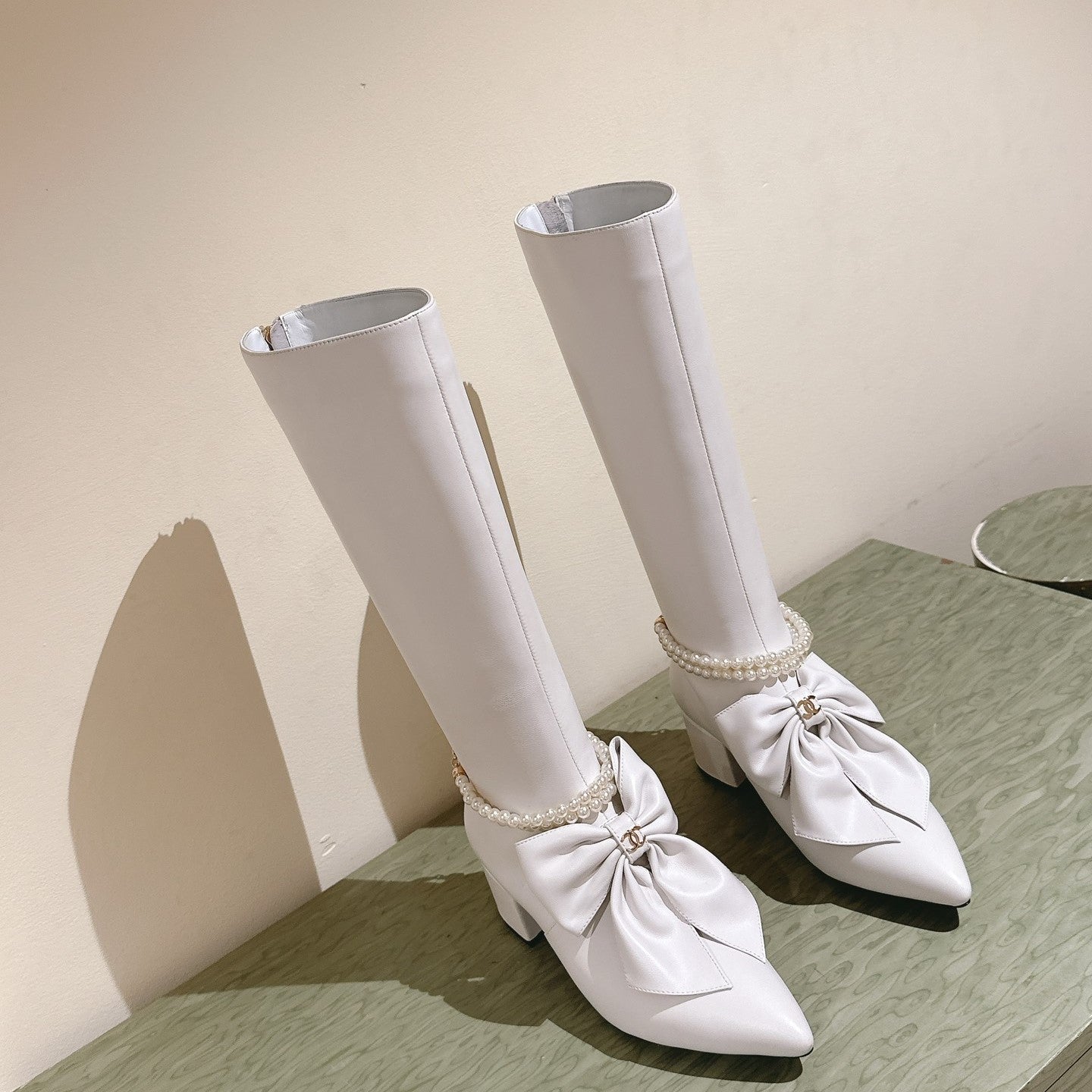 CC 24A Pearl Bow Knee-High Boots 65mm White Sheepskin 447464