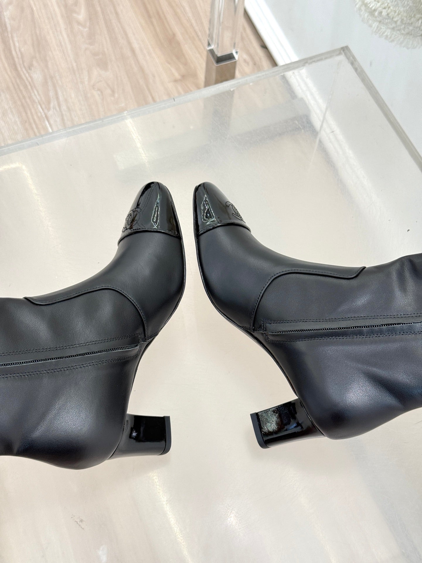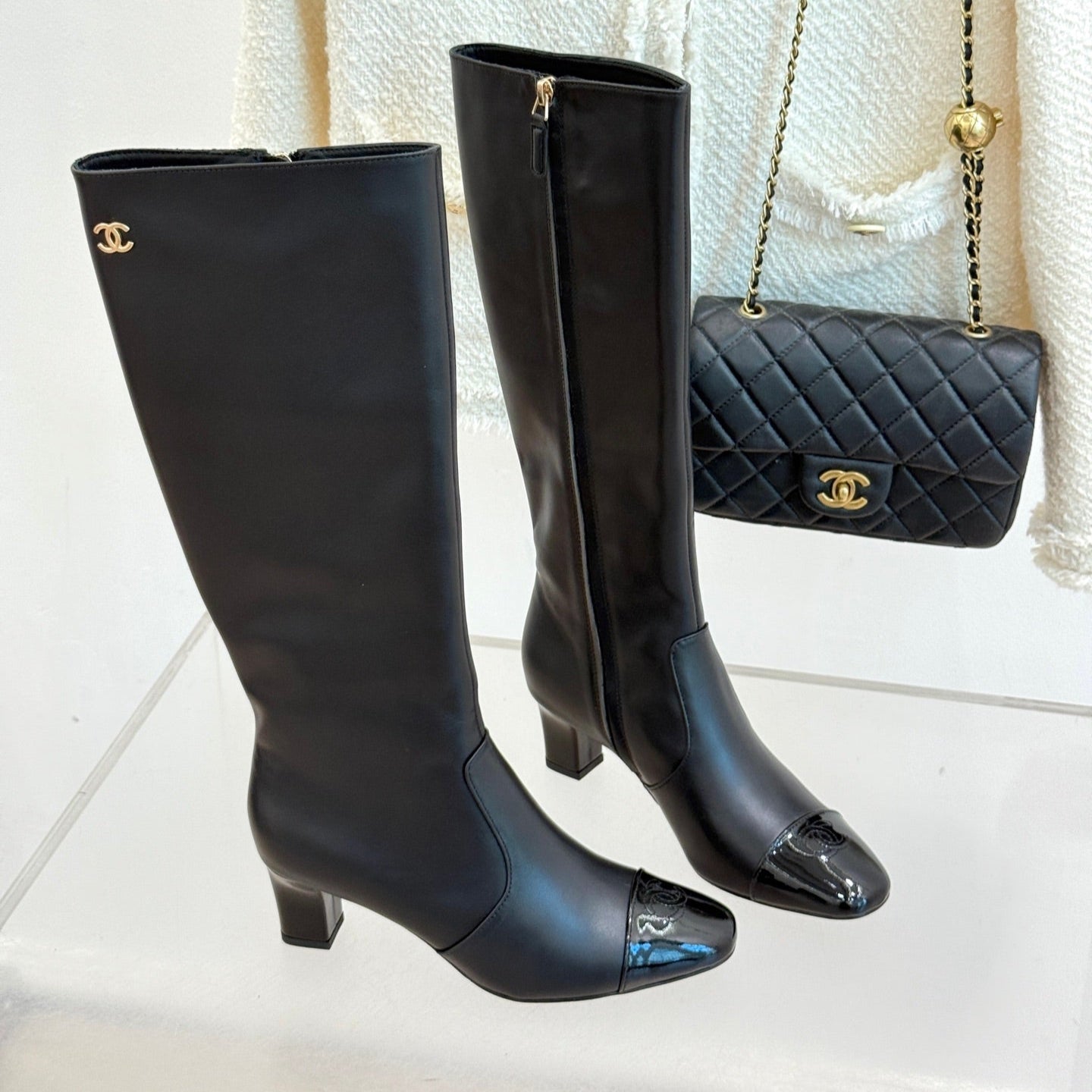 Chanel Double C Colorblock Heel Long Boot Black Sheepskin 465419
