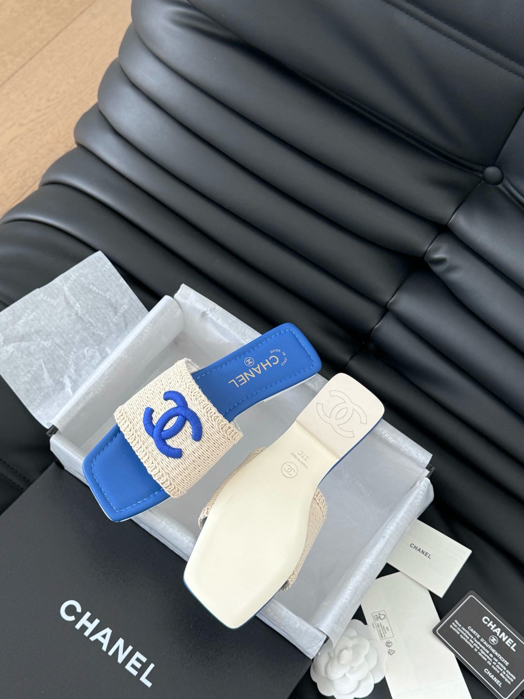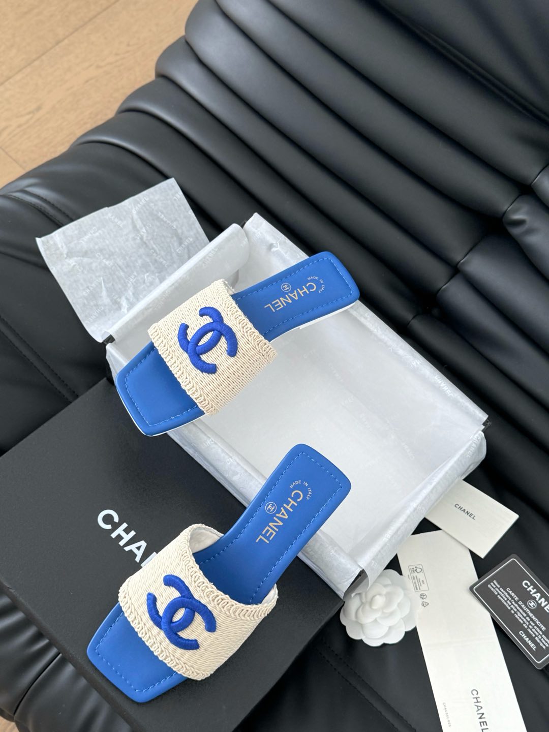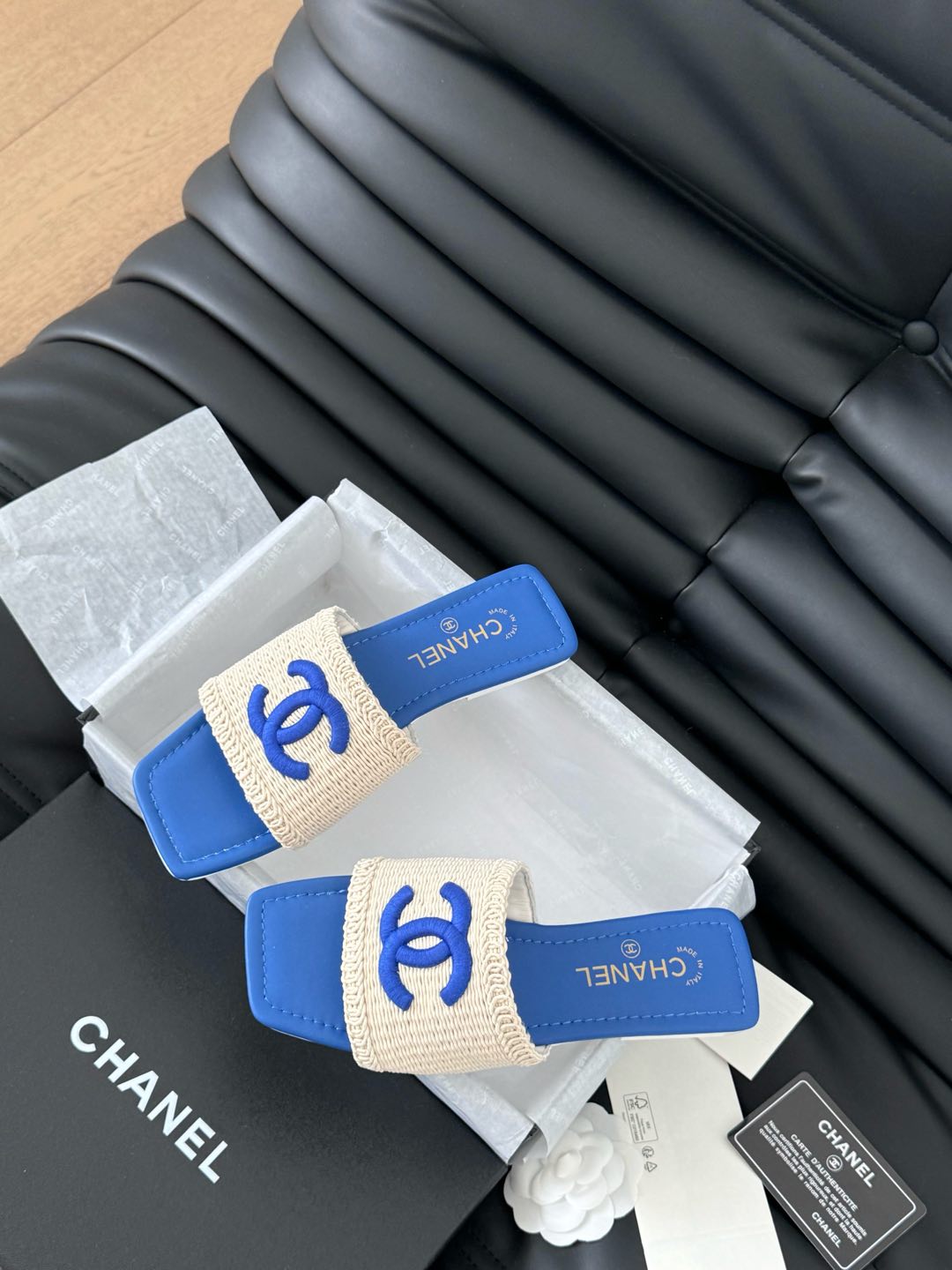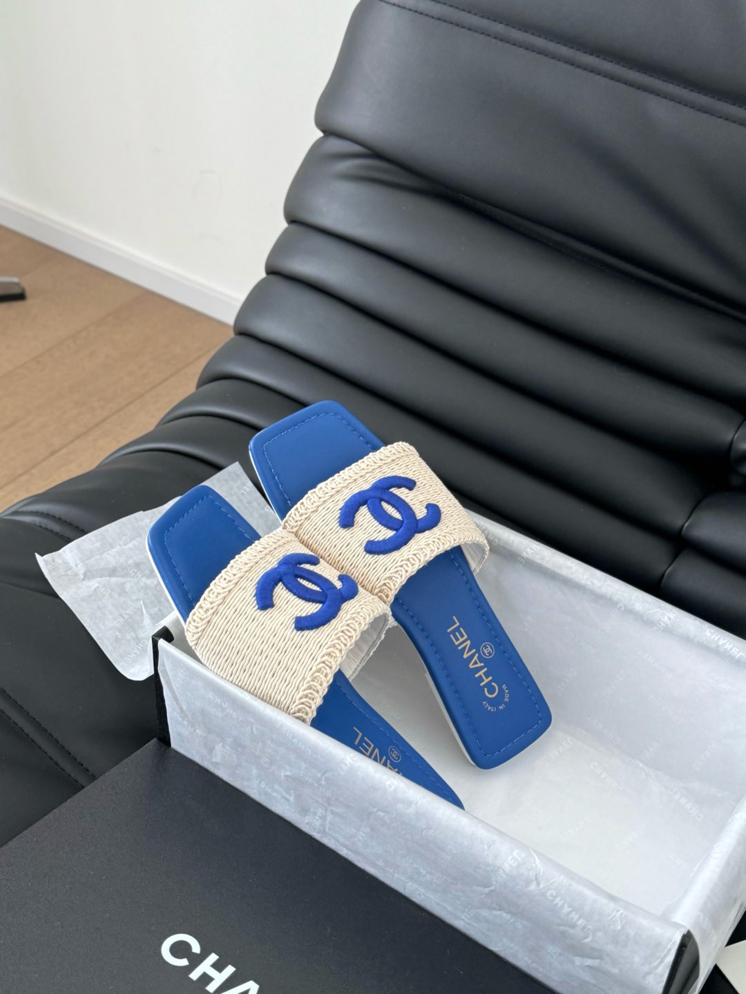 WOVEN SLIDE IN RAFFIA AND CERULEAN BLUE LAMBSKIN