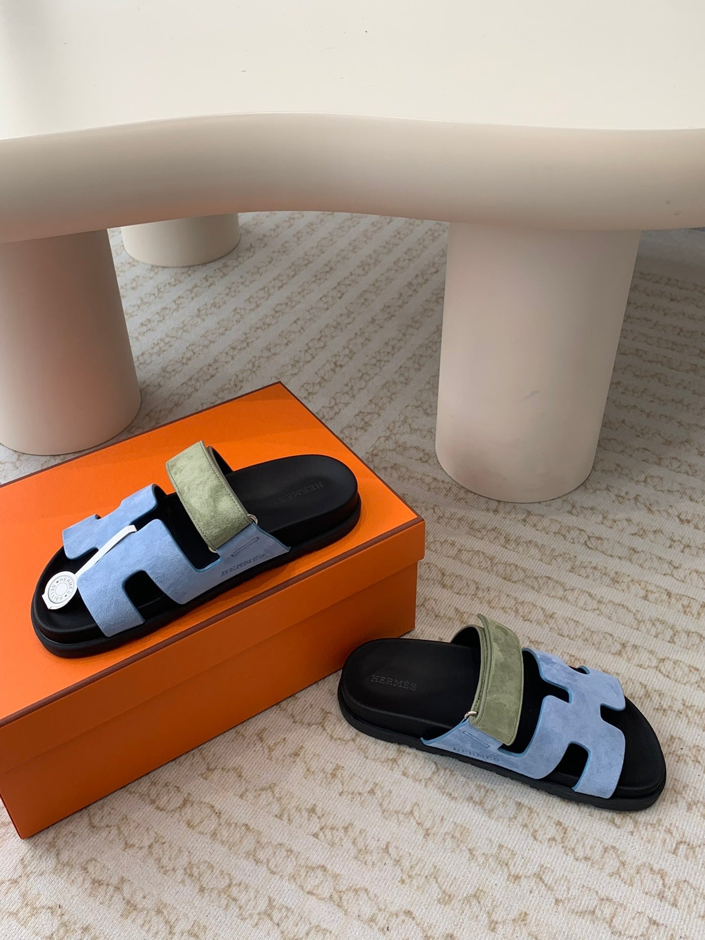 chypre sandal turquoise blue suede calfskin white thread embroidered