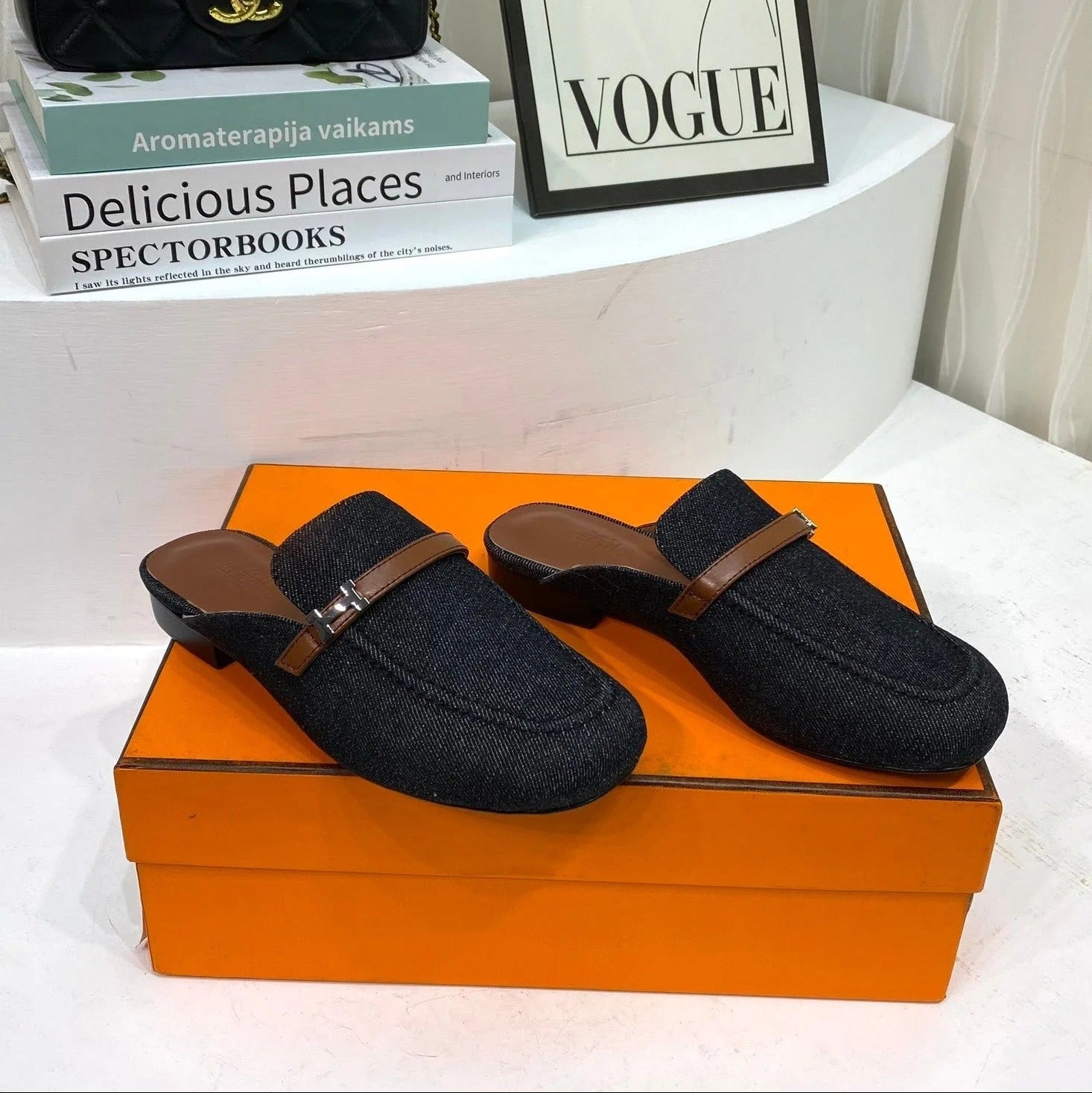 IENA MULE LAPIS CANVAS AND CARAMEL CALFSKIN