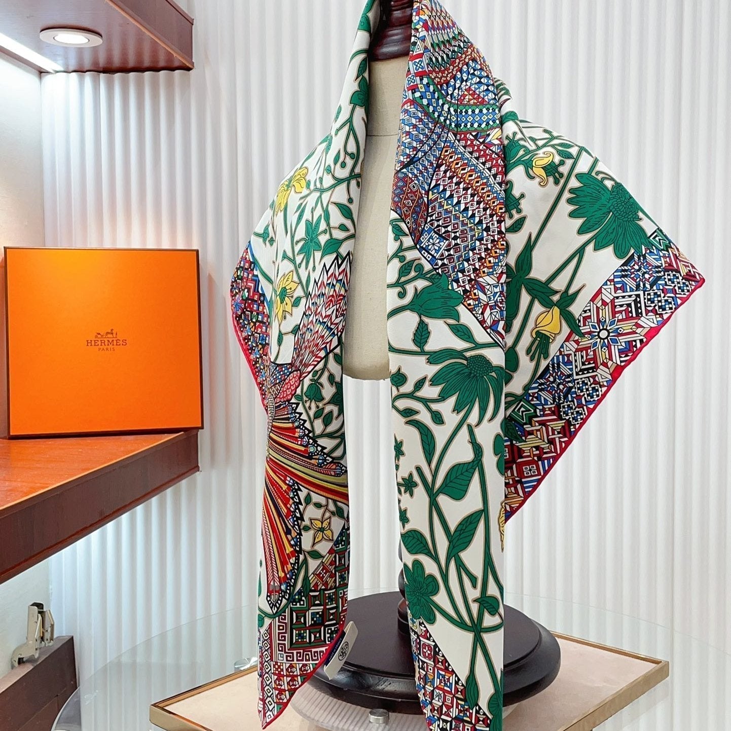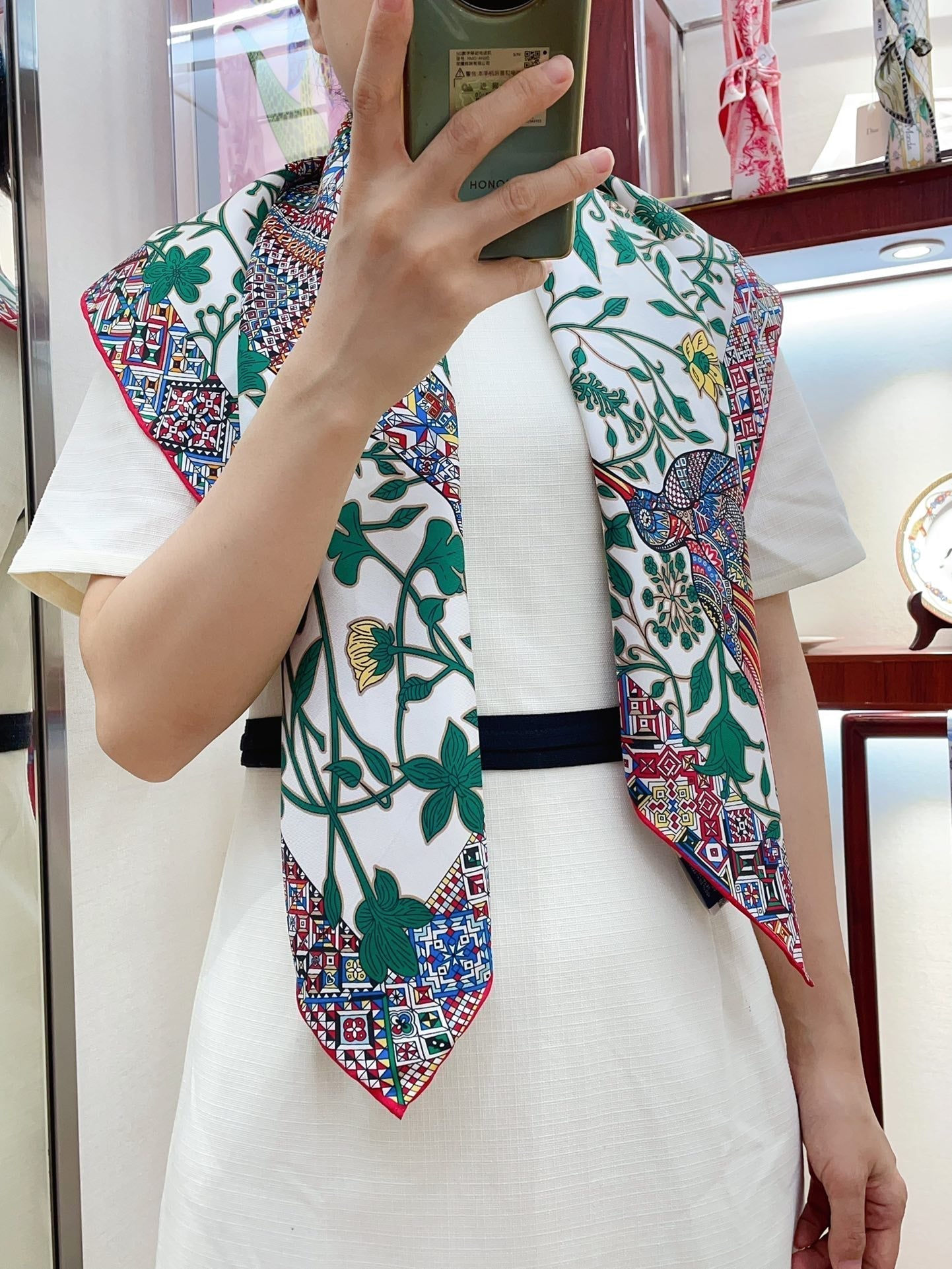 Le Jaguar Et Le Colibri Shawl 90 CM In Green Colorful Silk Twill 274208