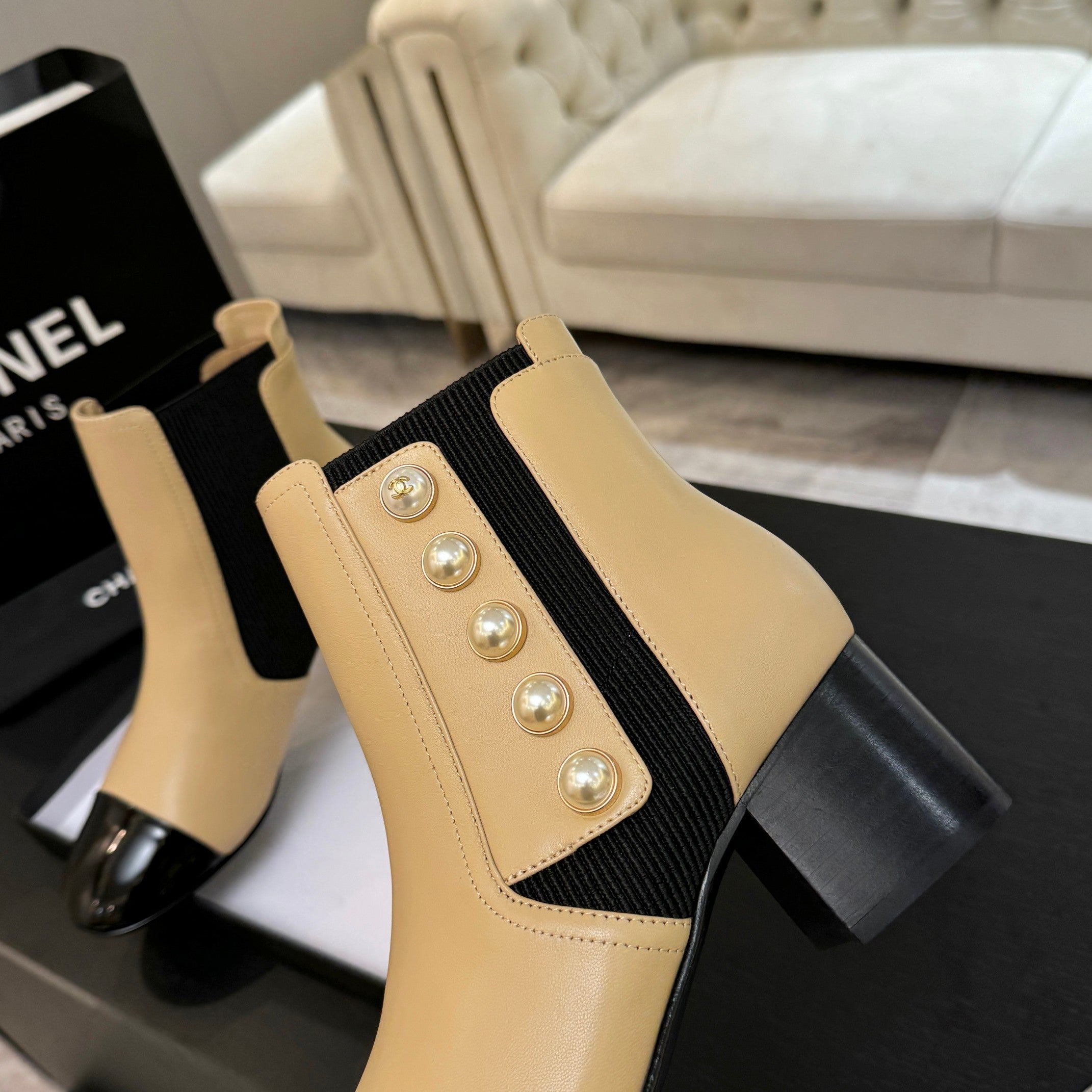 CC Ankle Boots 50mm With Chain Strap Beige Calfskin 529291
