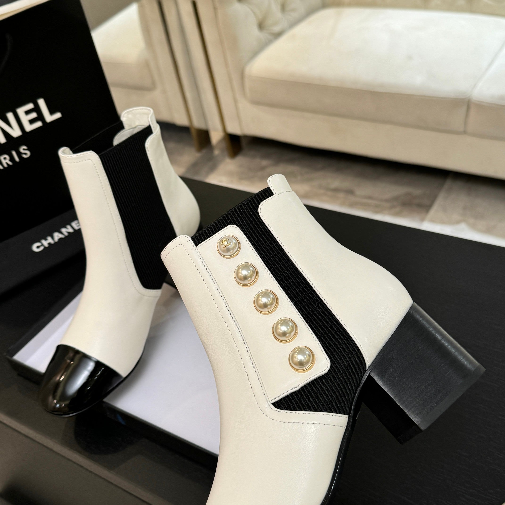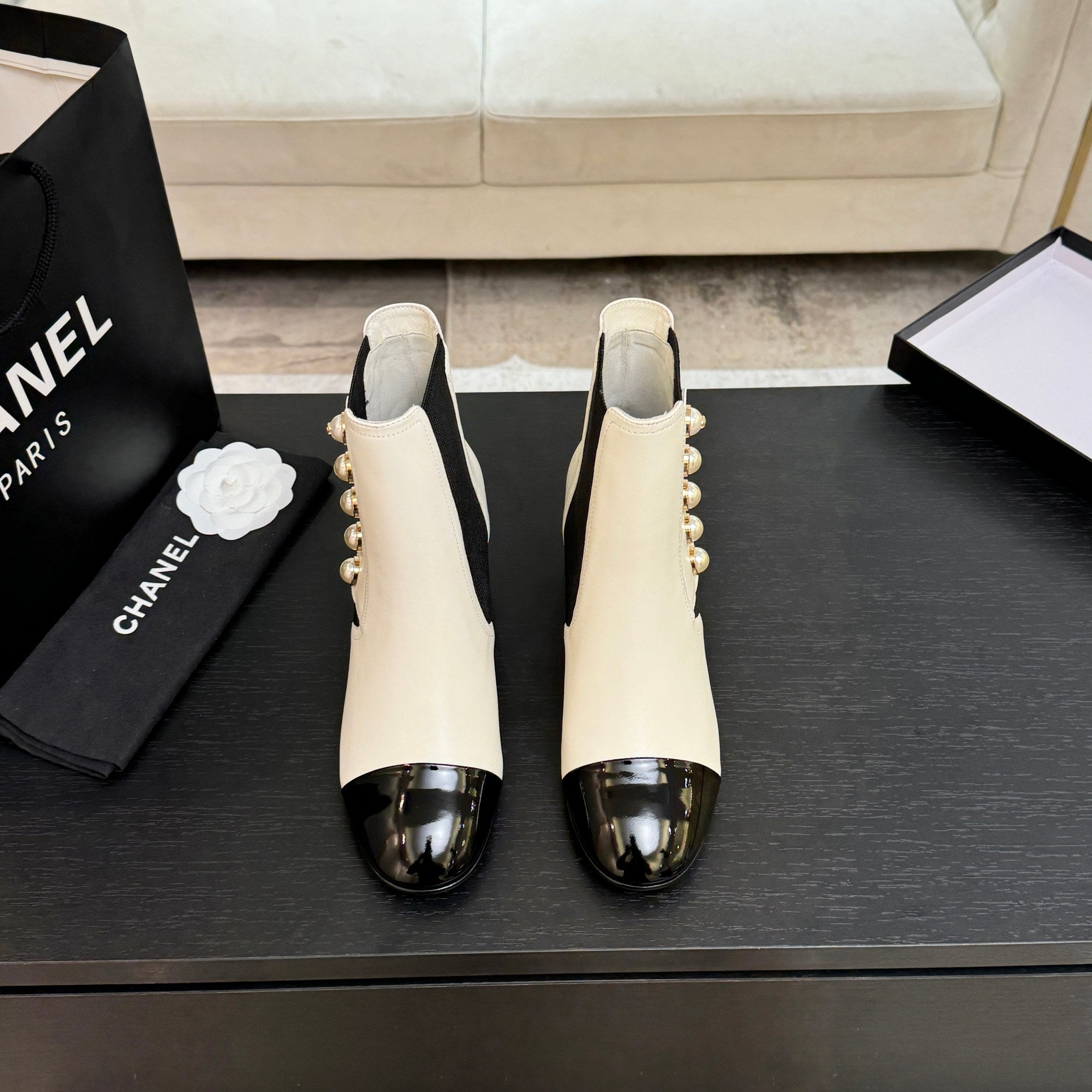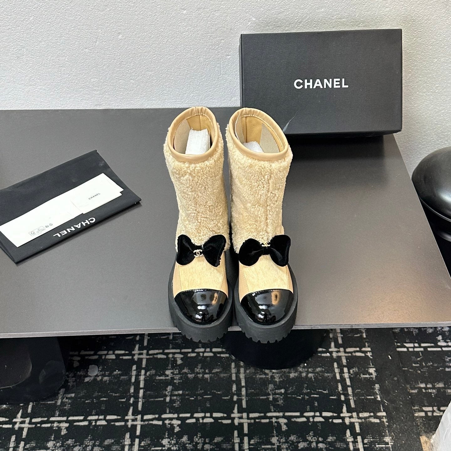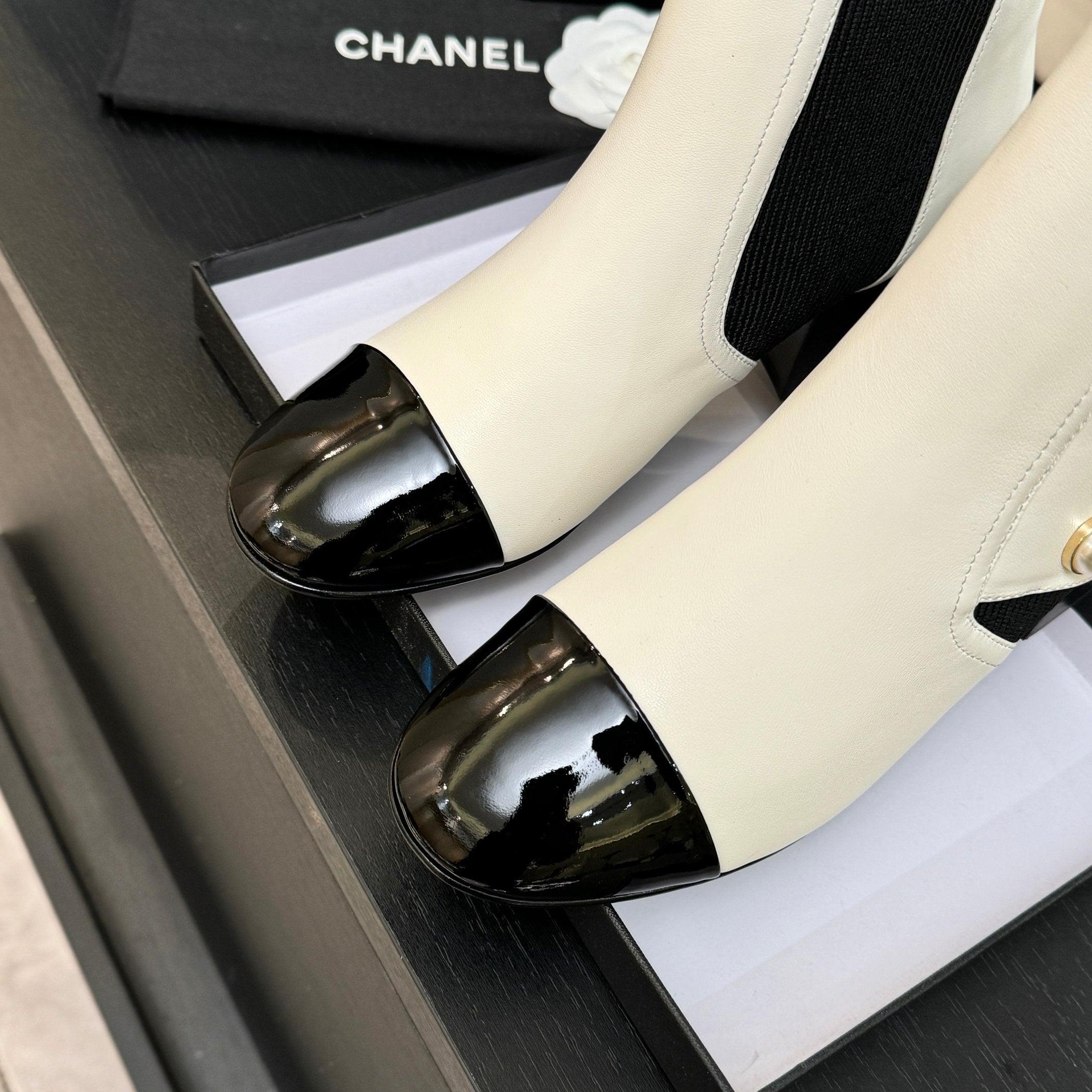 CC Coco Neige 2025/26 Low-cut Boots Black White Shearling Lambskin Patent Leather 529341