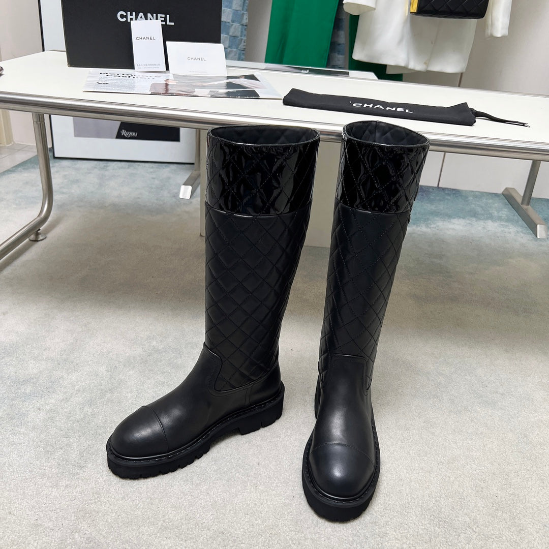 CC Classic Knee High Boots Quited Black Sheepskin Patent Leather 529337
