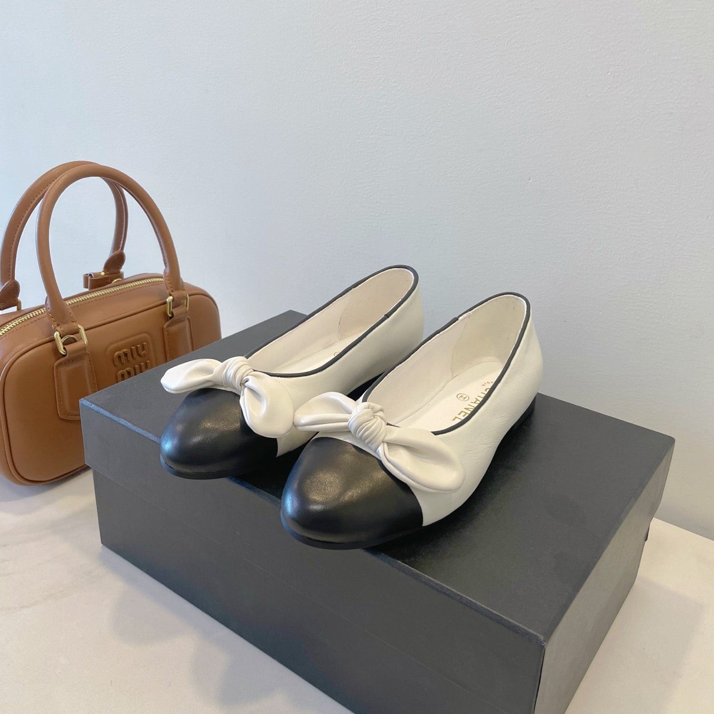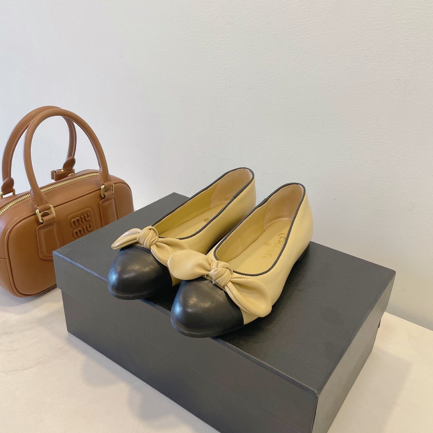 CC 25SS Bow Flat Shoes Black Beige Sheepskin Frabic 530676