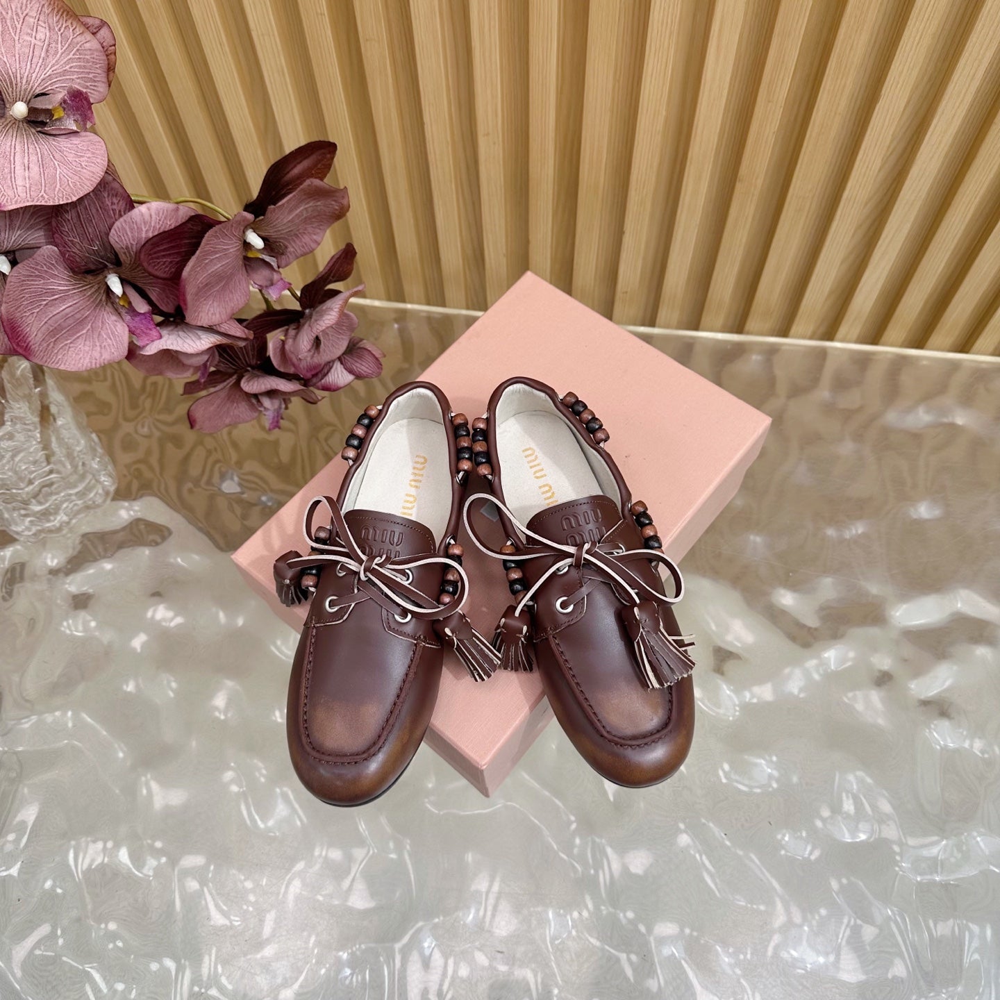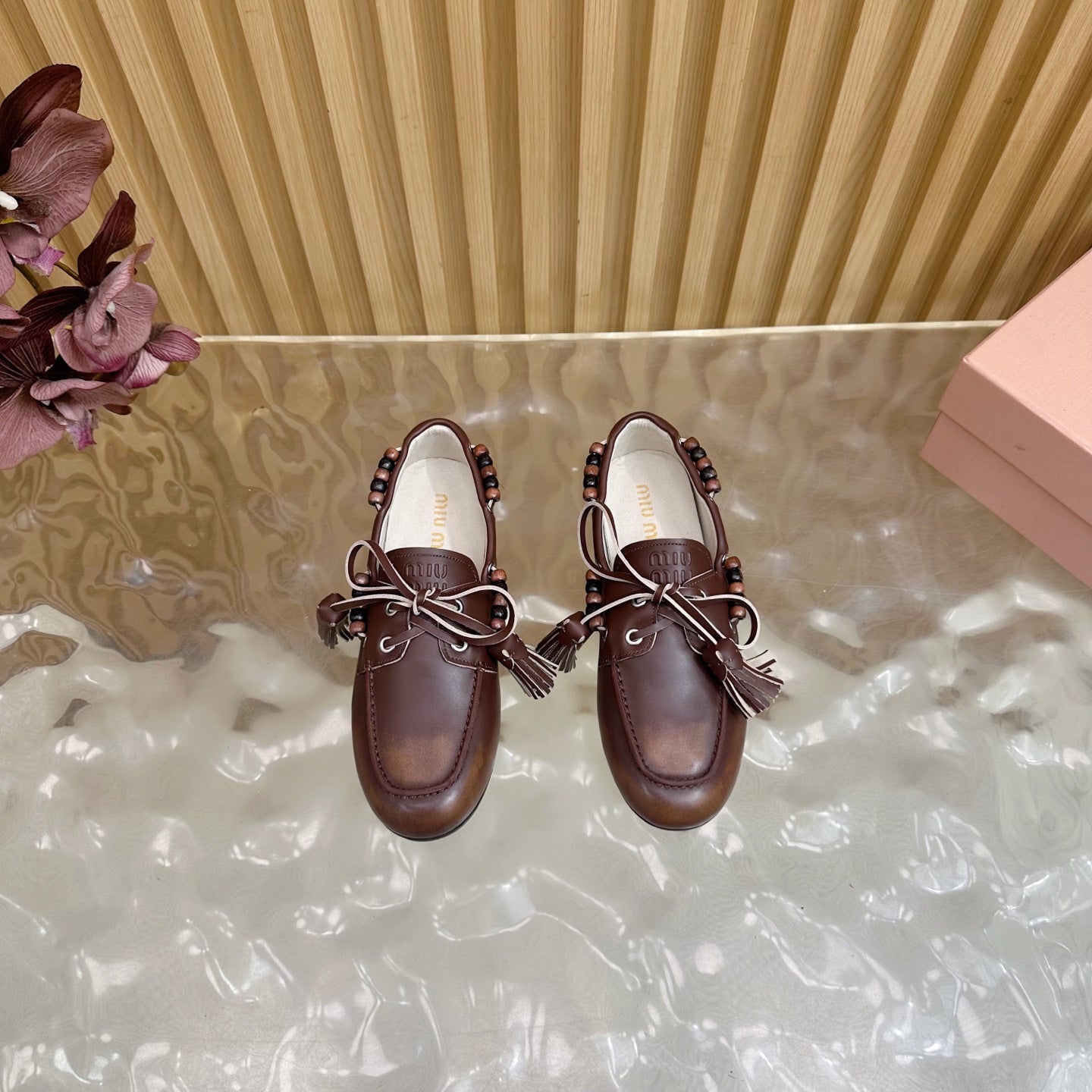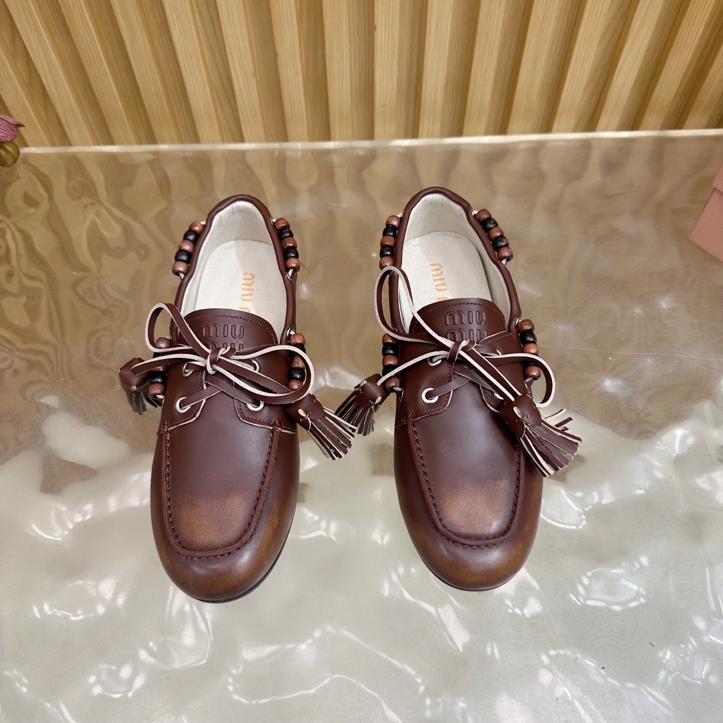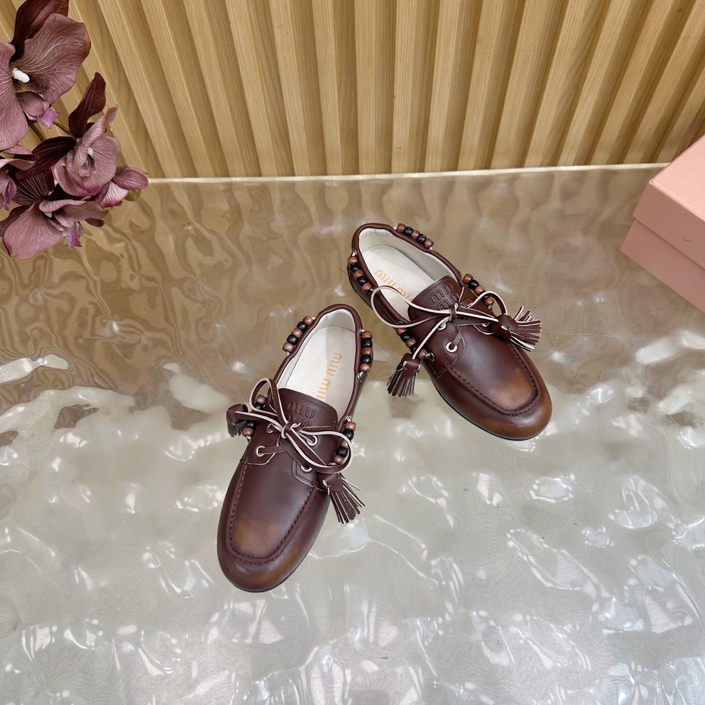 Miu Laces Eyelet Flat Loafer Deep Reddish Brown Sheepskin 498169