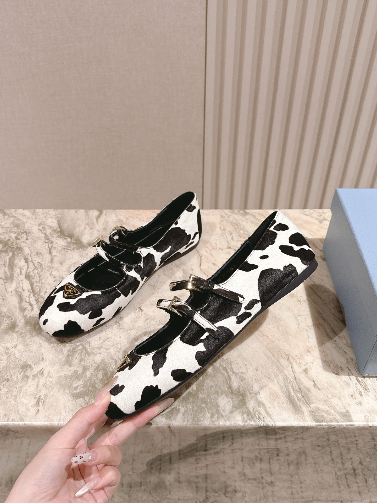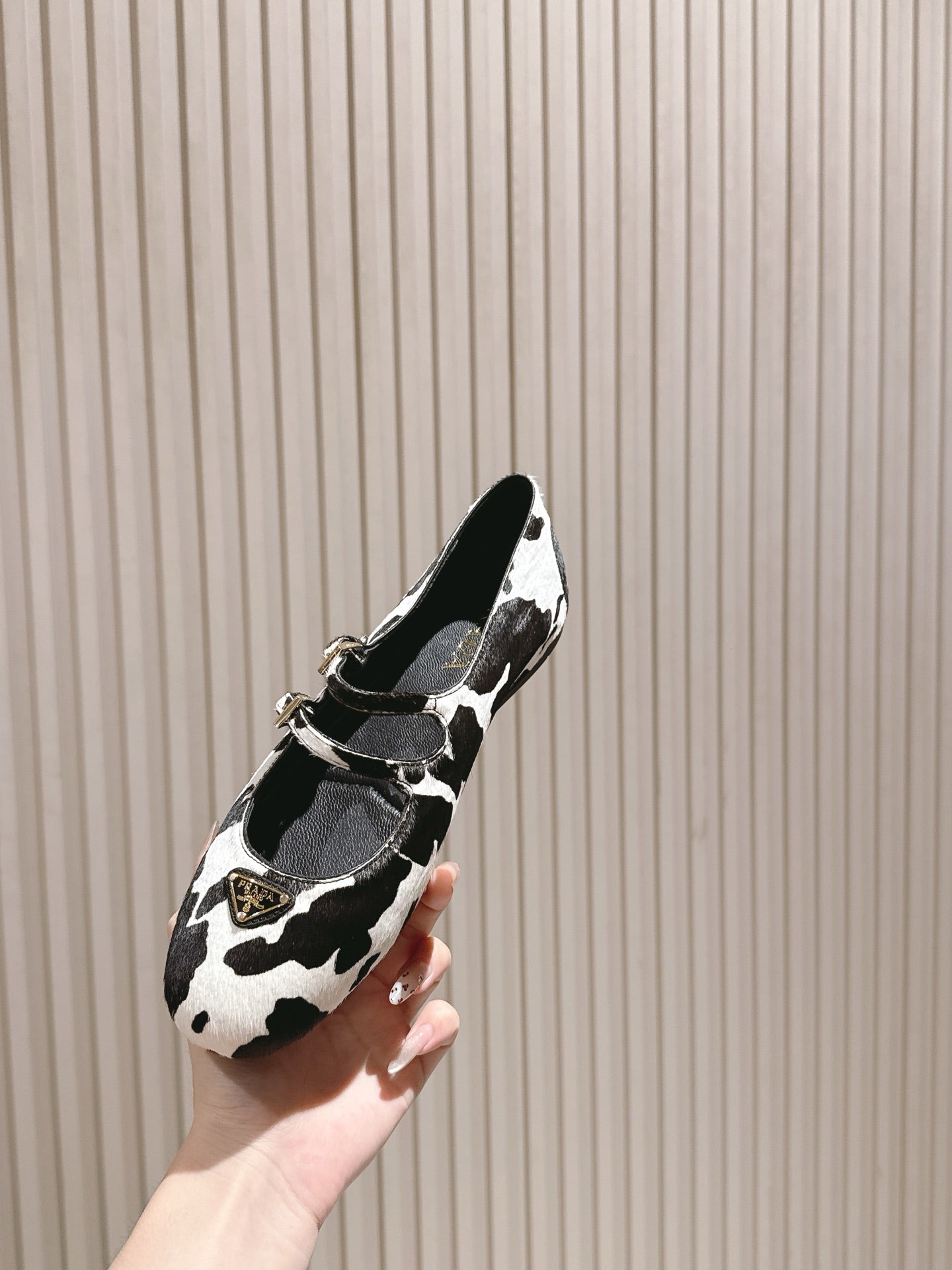 PRA 25s Ballet Flats with Small Buckle Black White Cow Printed Calf-hair 449703