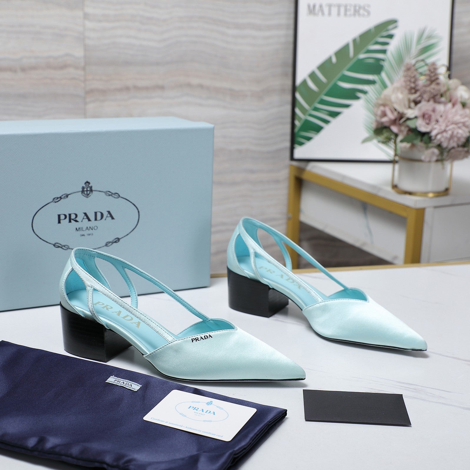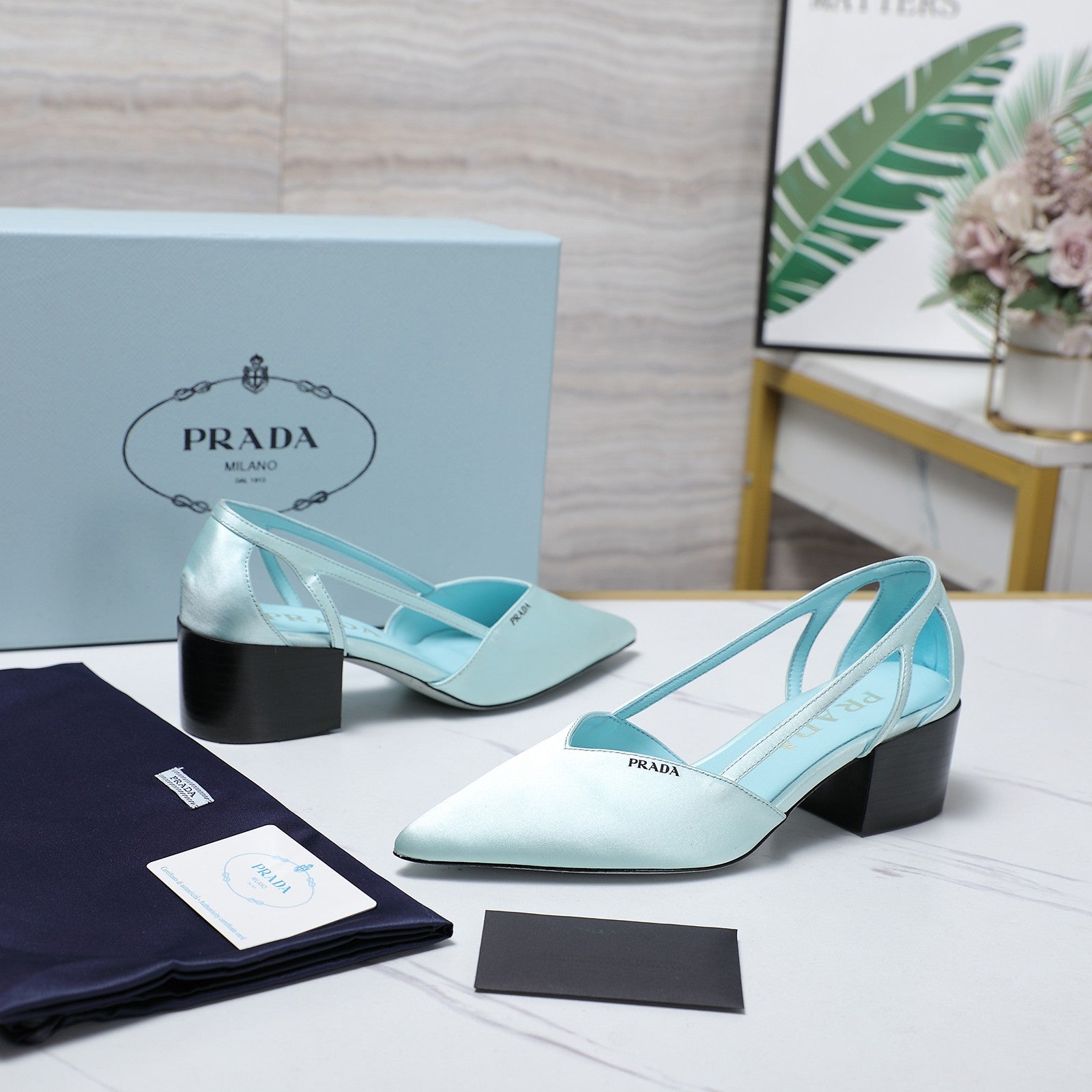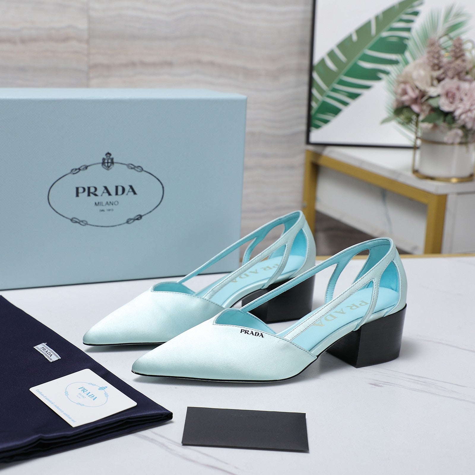 Prada Cutout Satin Pointy-Toe Pump 50mm Blue Satin 456273