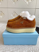 Prada Mid-Top Sneakers Caramel Suede White Shearing 564157