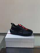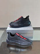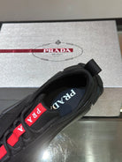 Material: Cowhide Upper with Breathable Mesh Panels, Soft and Comfortable, Breathable Tongue Decorated with PRADA Brand Letter Logo, Rubber Thick Sole with Red Tag Tongue Echo