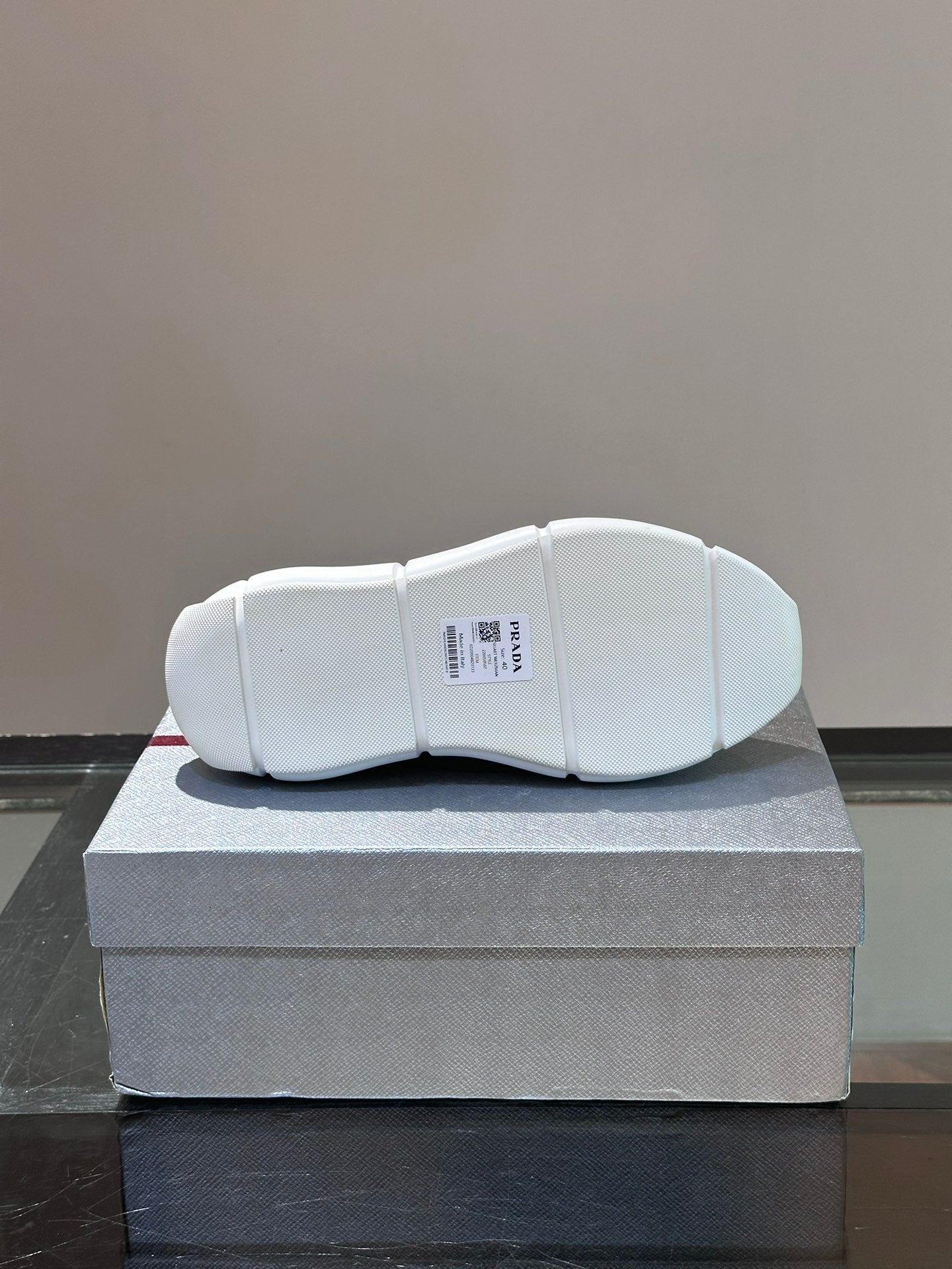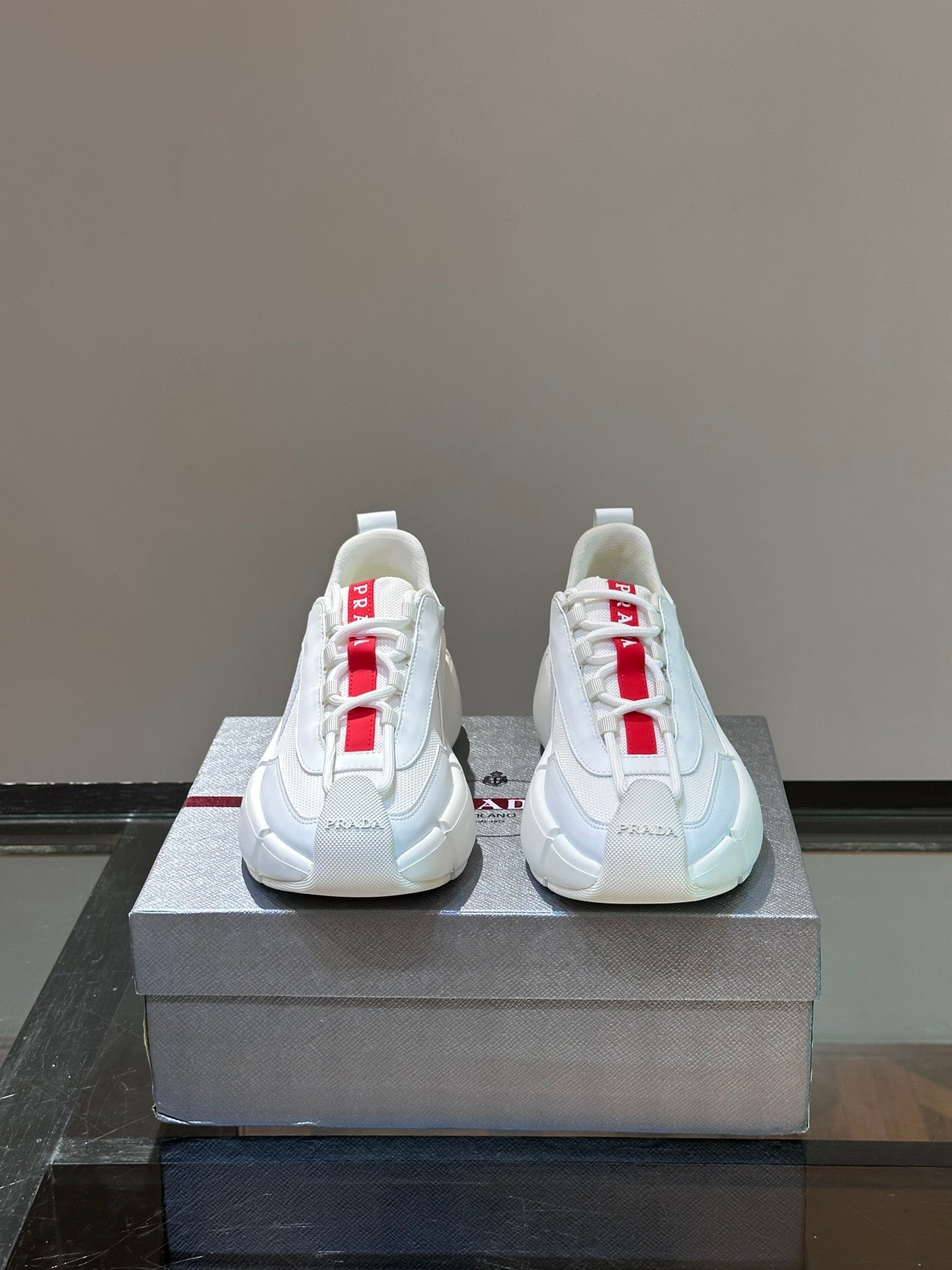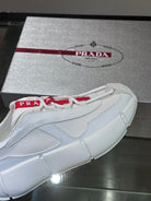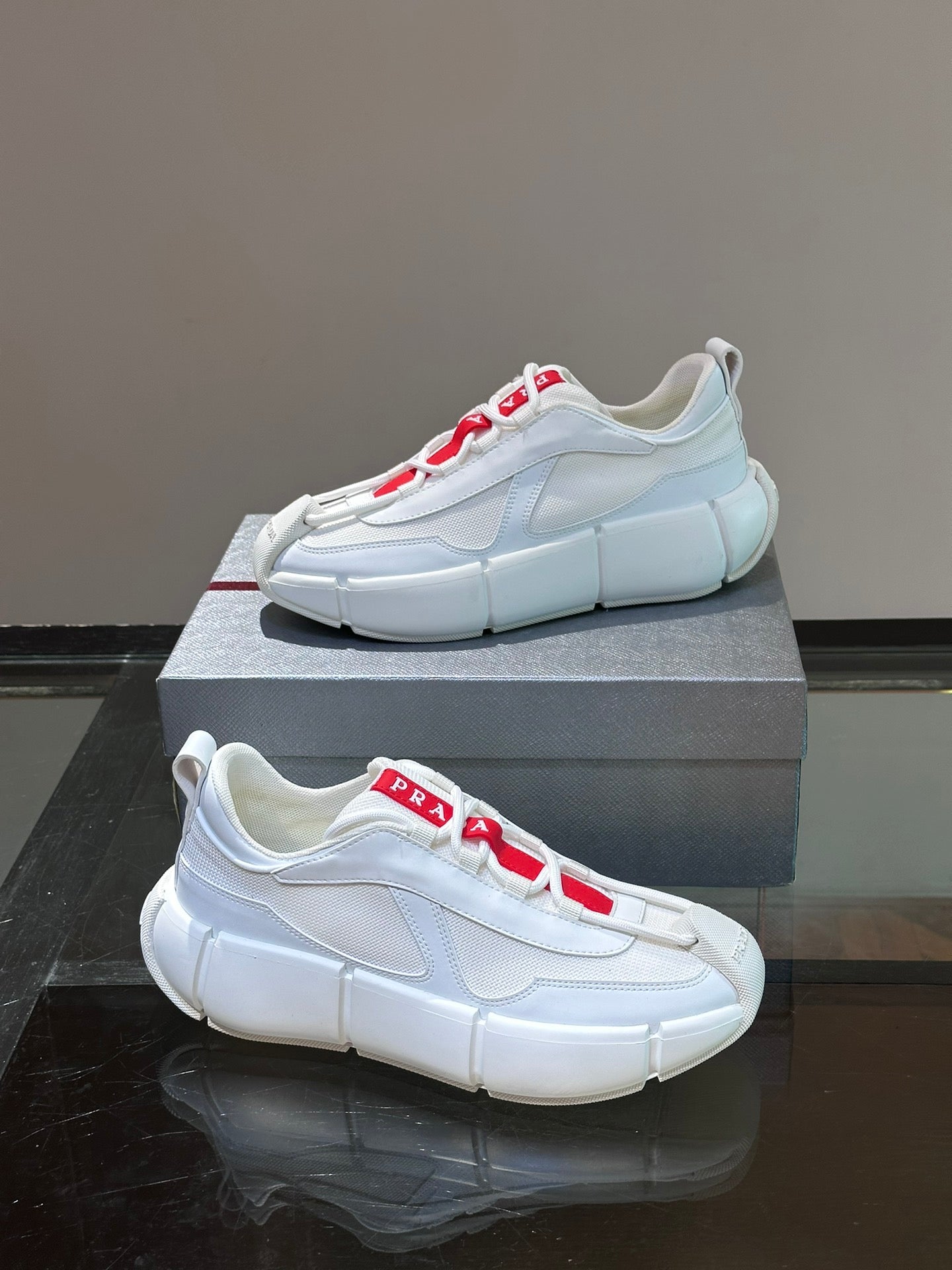 • Material: Cowhide Upper with Breathable Mesh Panels, Soft and Comfortable, Breathable Tongue Decorated with PRADA Brand Letter Logo, Rubber Thick Sole with Red Tag Tongue Echo