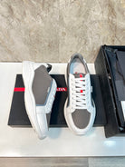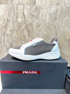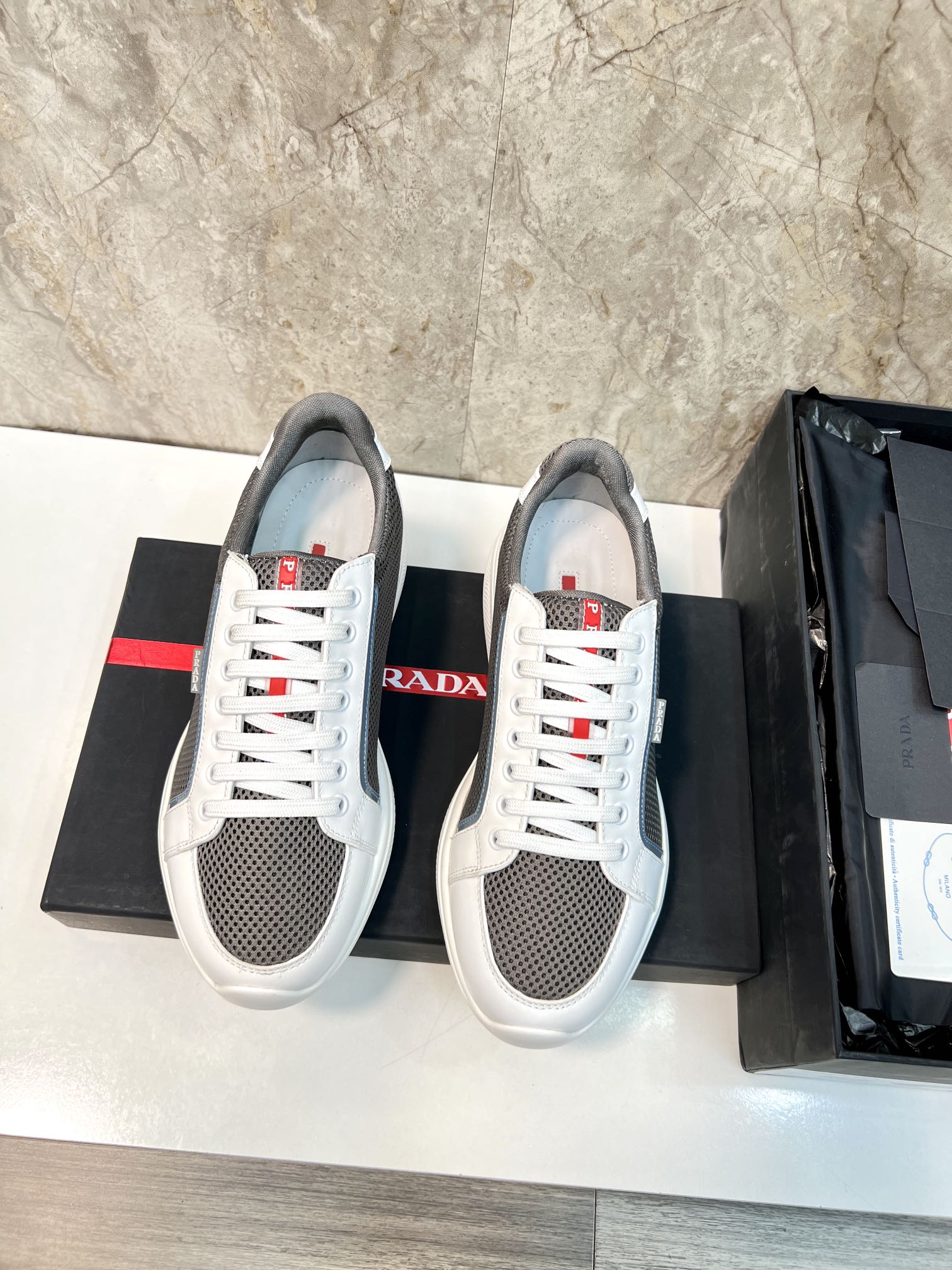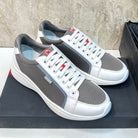 PRA SNEAKER WHITE CALFSKIN AND WOOD BROWN MESH FABRIC