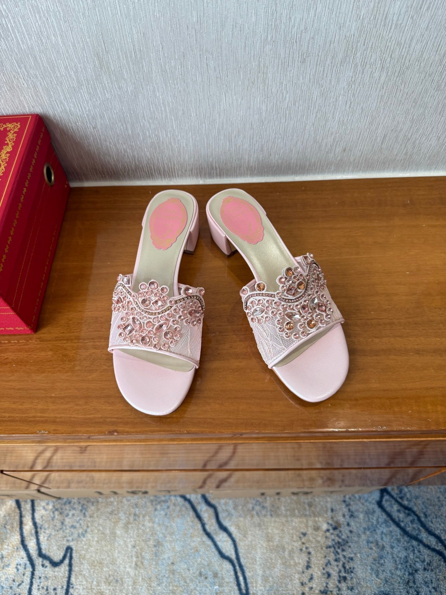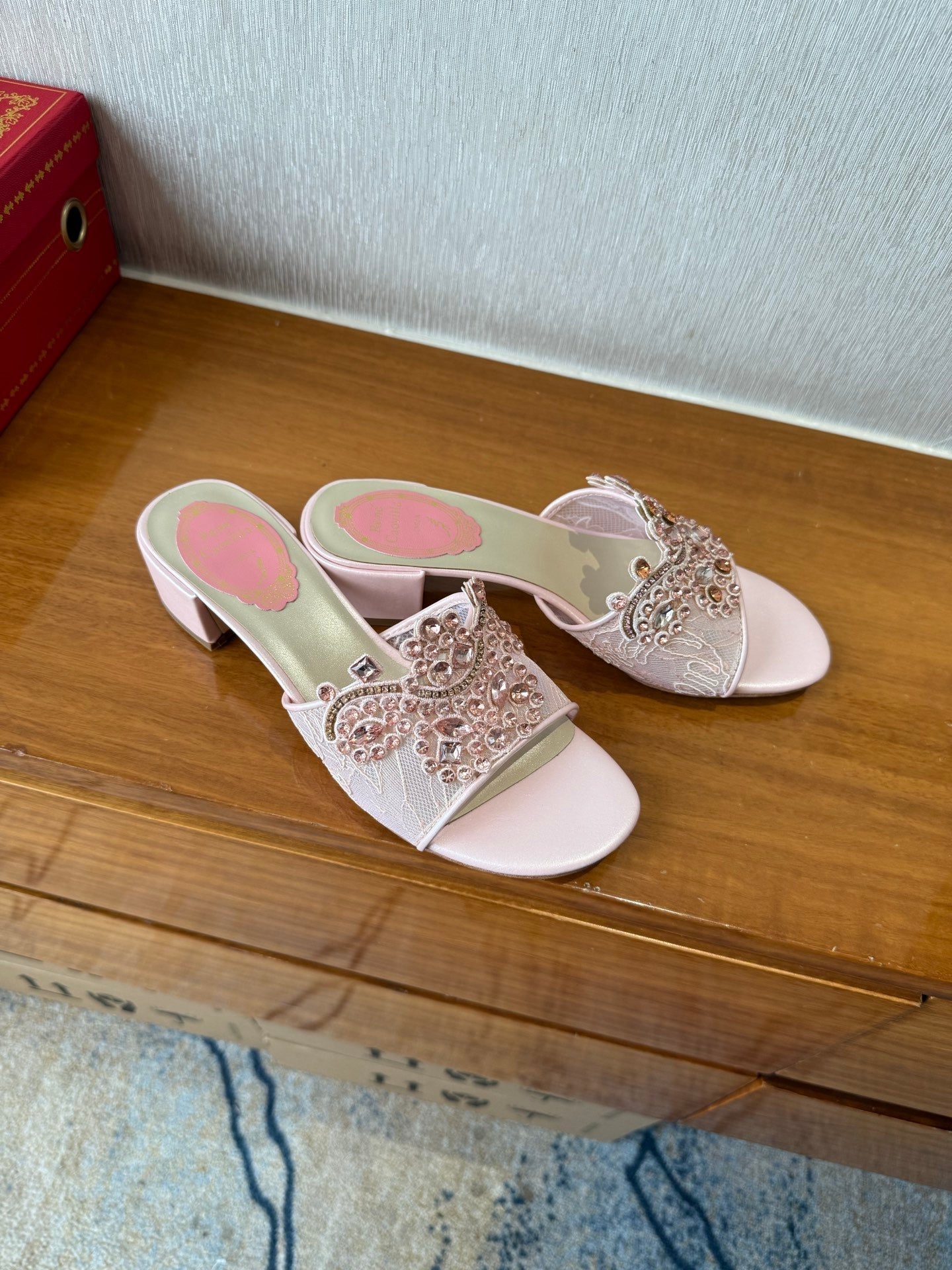 RC 25C Flower-Studded Diamond High-Heeled Sandals Pink Sheepskin 174913