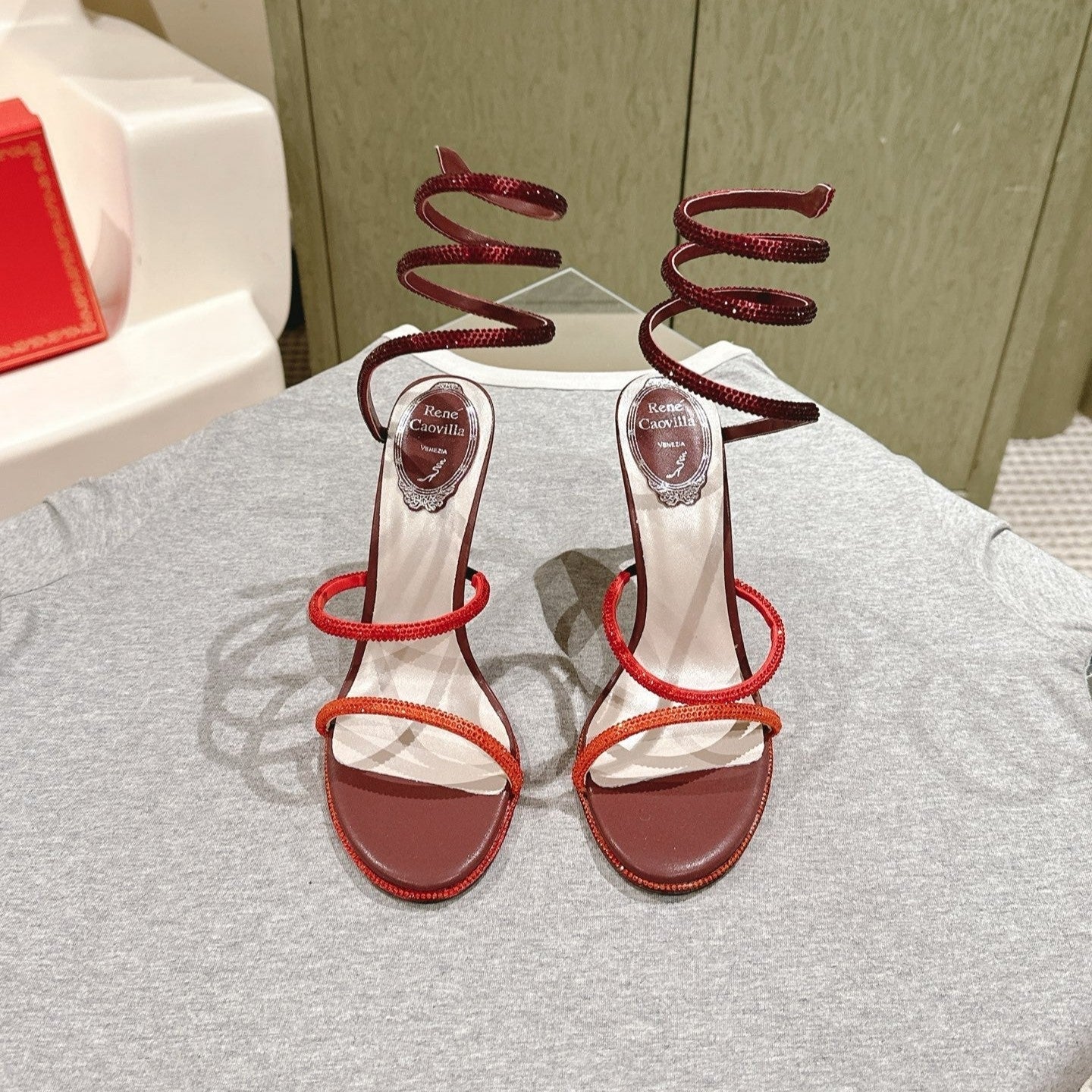 RC 25 Snake-Shaped High-Heeled Sandals Dark Red Silk Rhinestones 268061