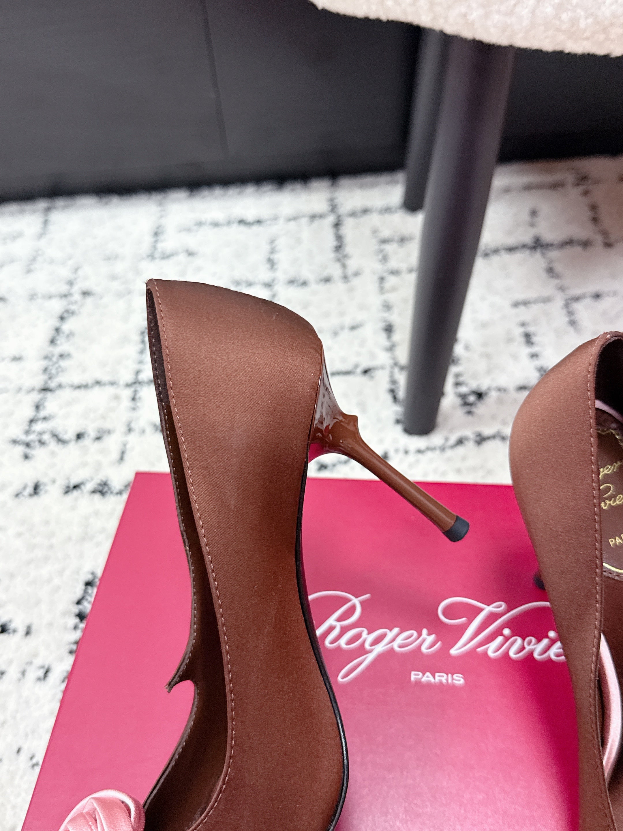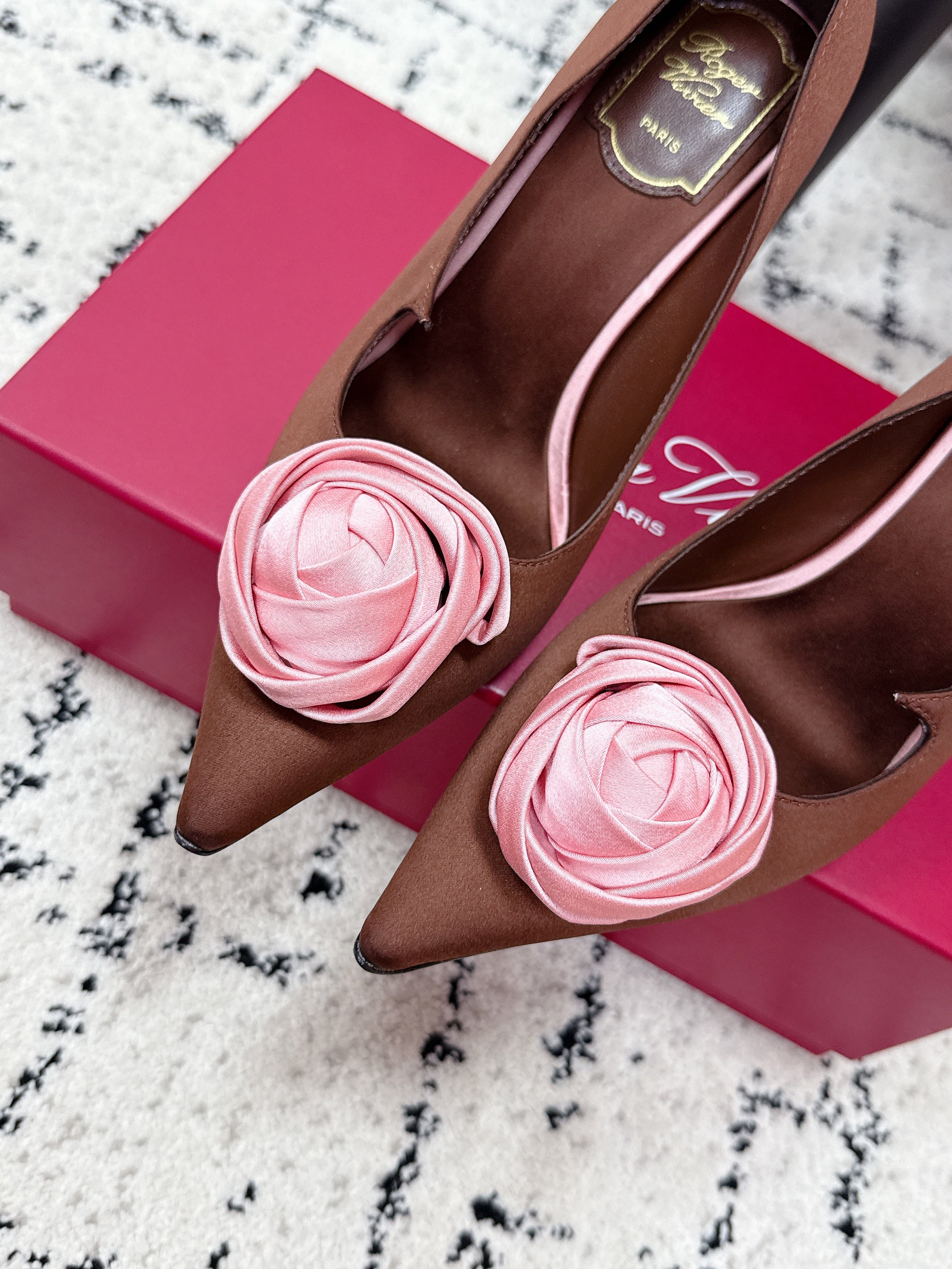 RV Rose Vivier Flower Pumps 10cm Pink Brown Satin 617292