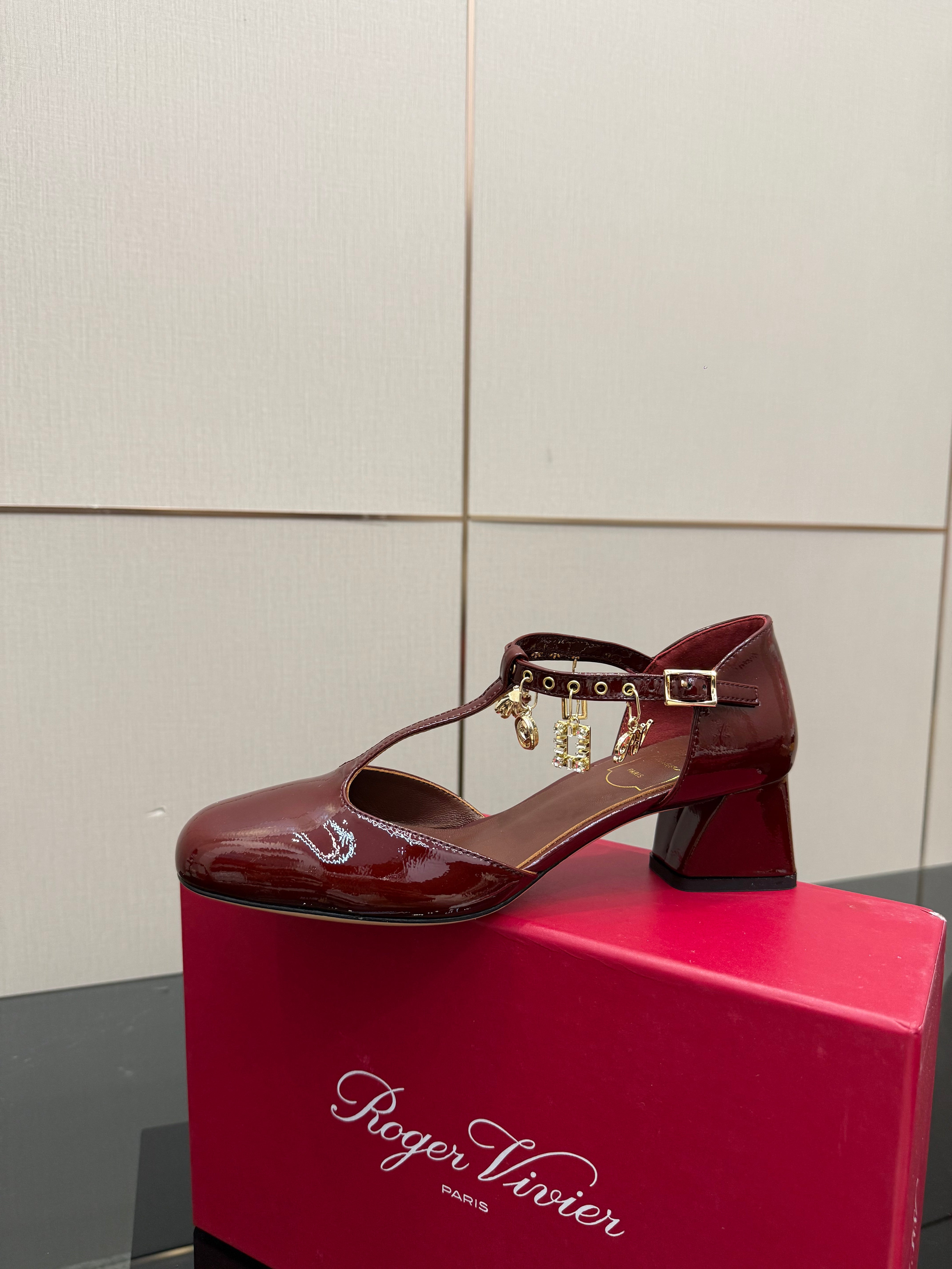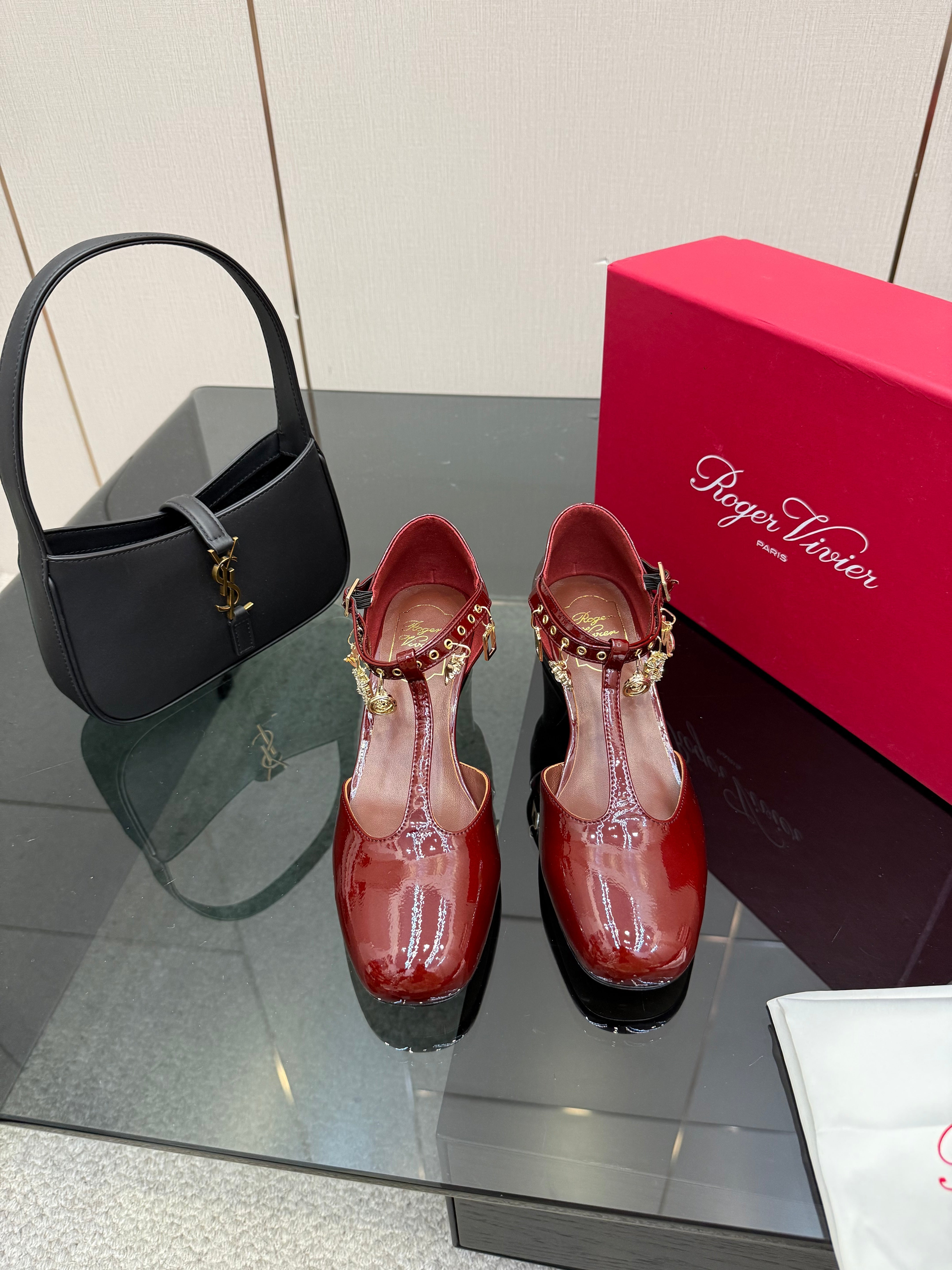 RV 26WF New T-Strap Rhinestone Strap Sandals 7cm Burgundy Patent Leather 629889