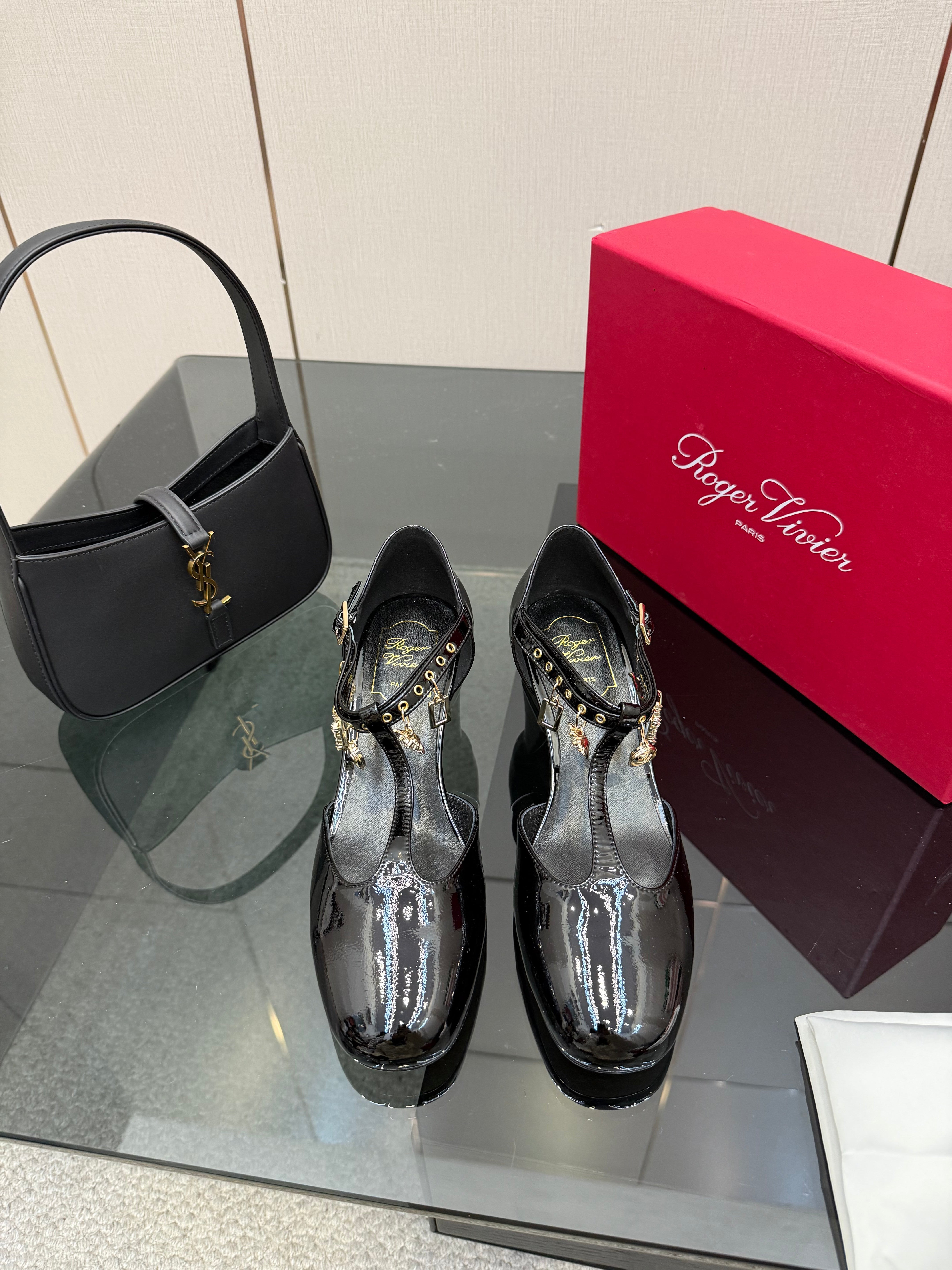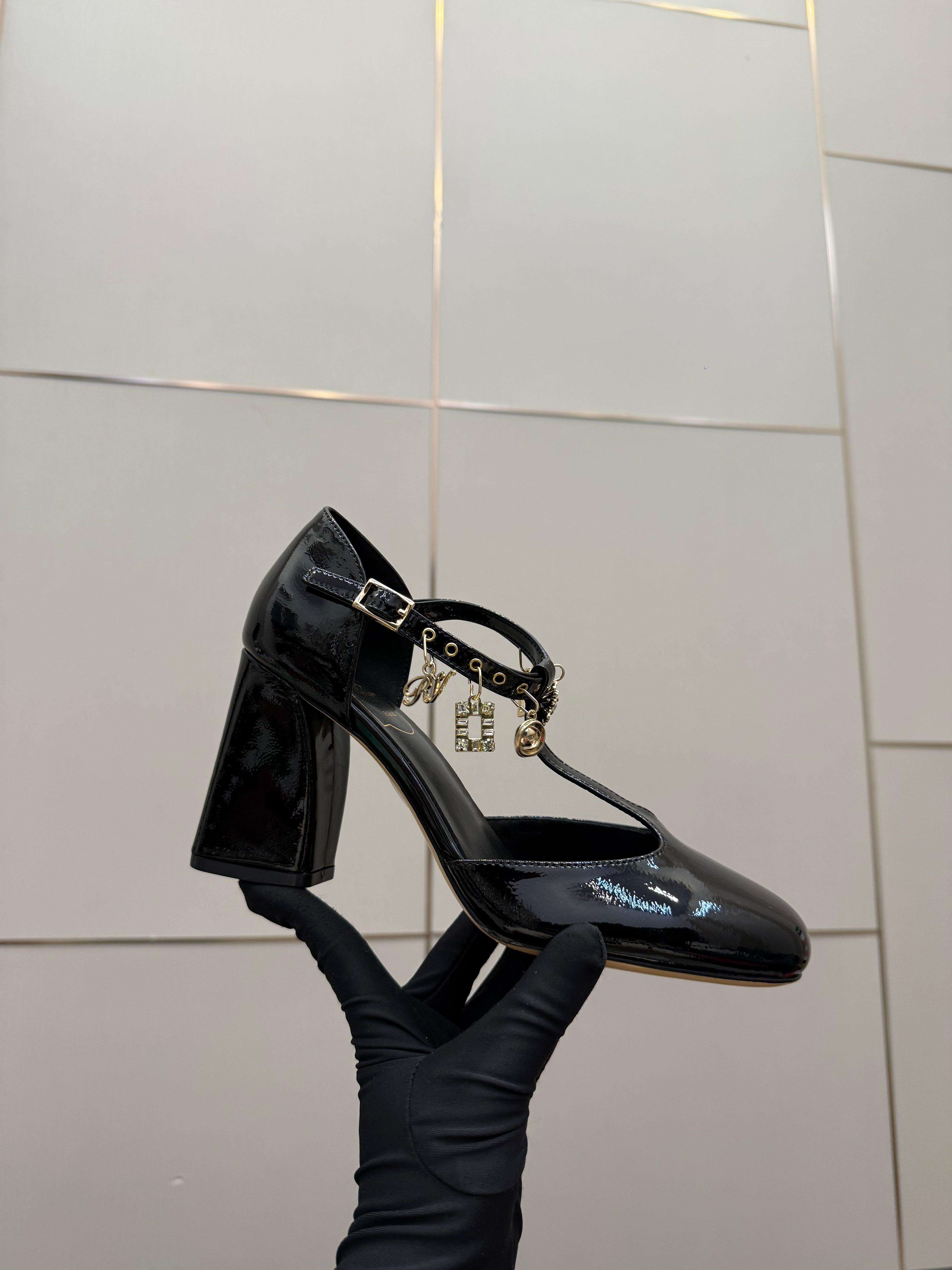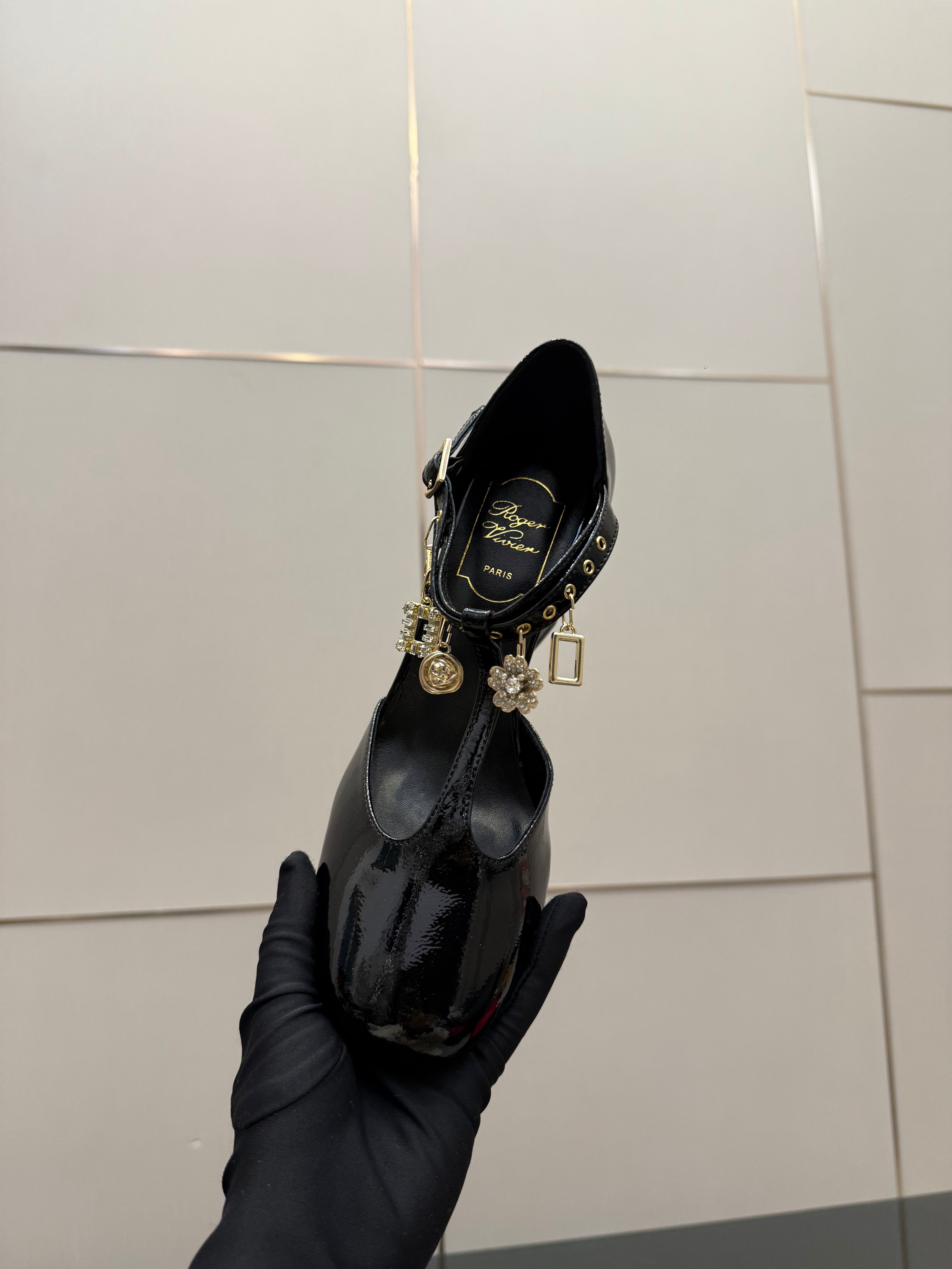 RV 26WF New T-Strap Rhinestone Strap Sandals 7cm Black Patent Leather 629891