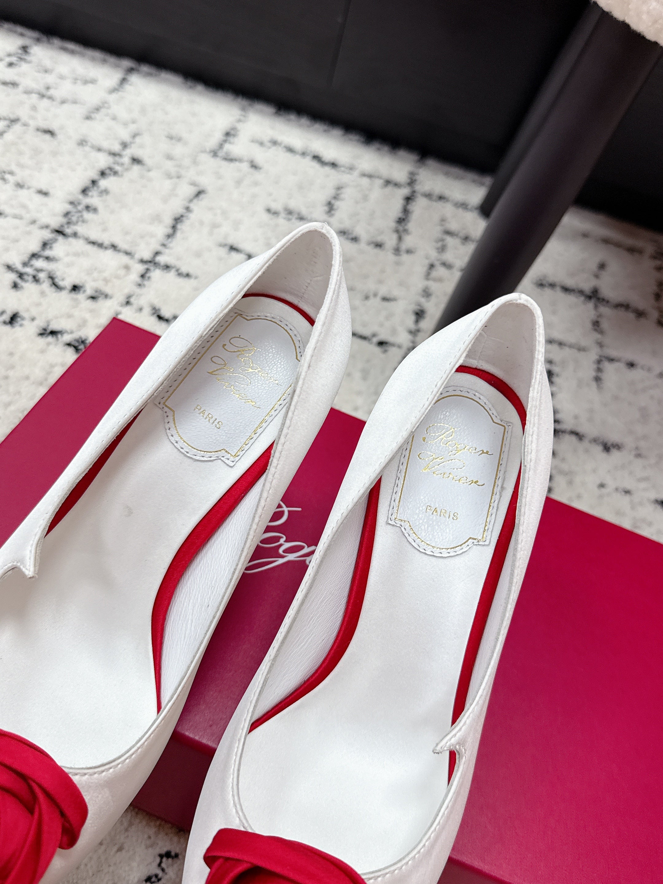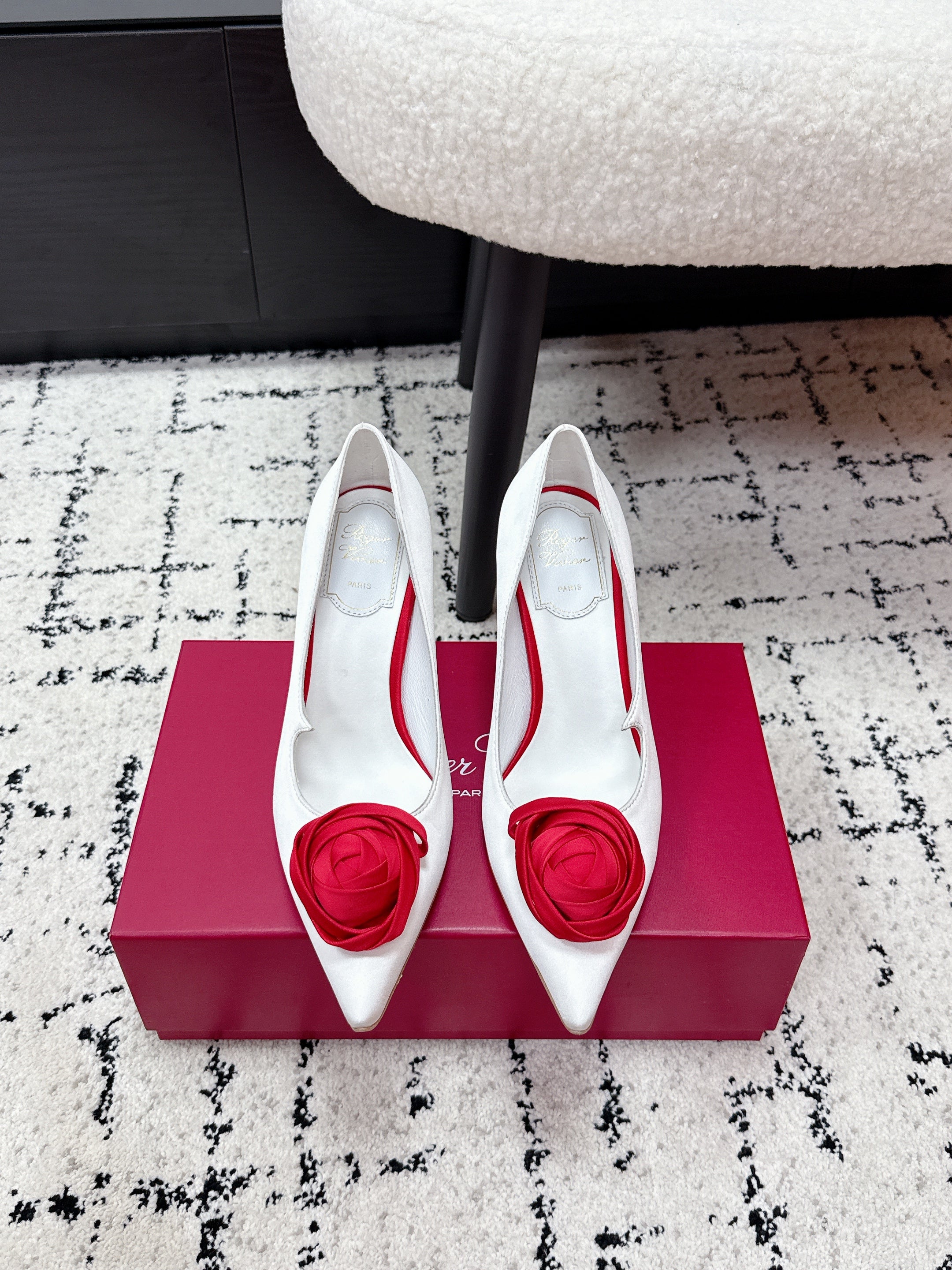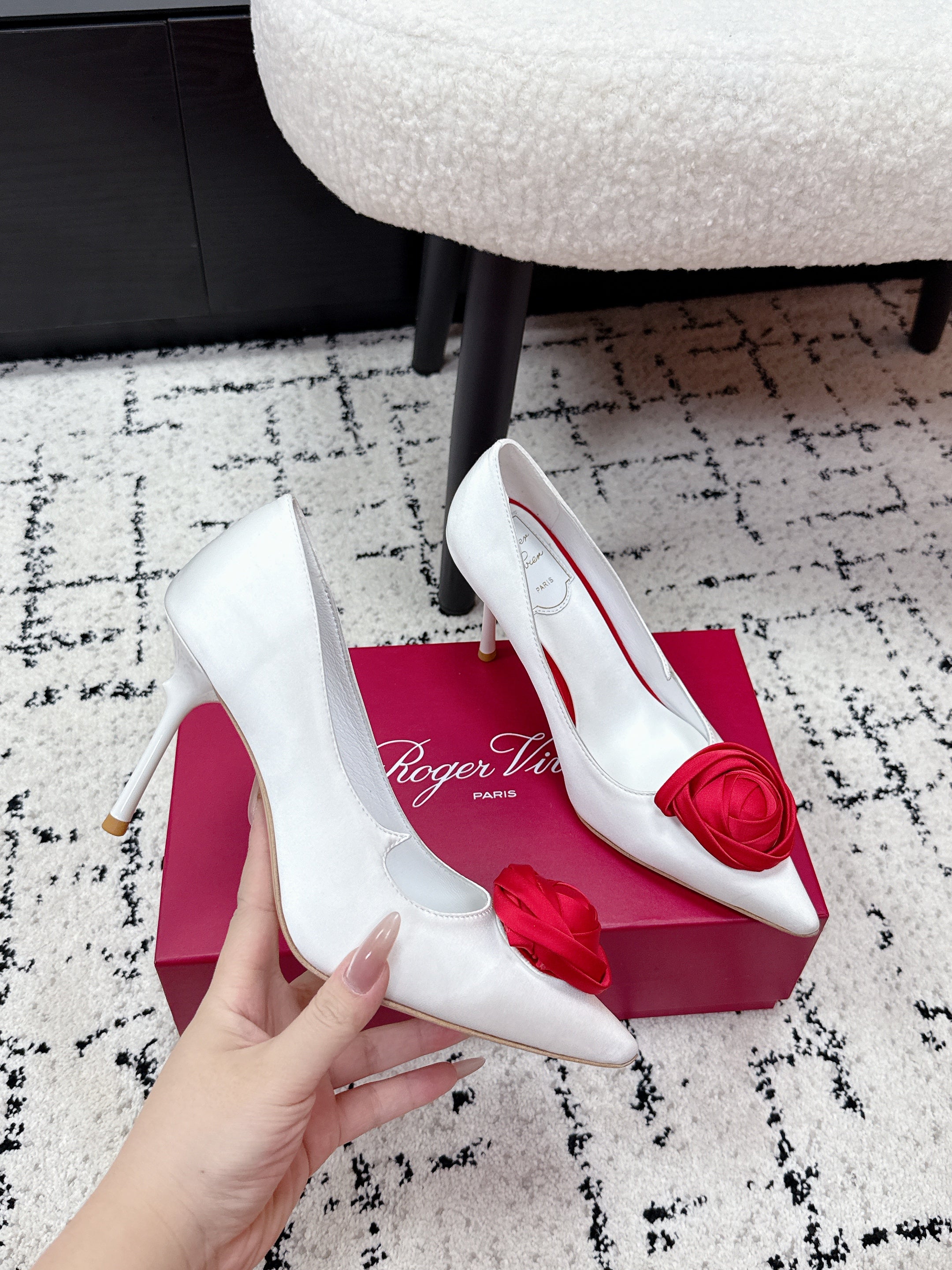 RV Rose Vivier Flower Pumps 10cm White Red Satin 617293