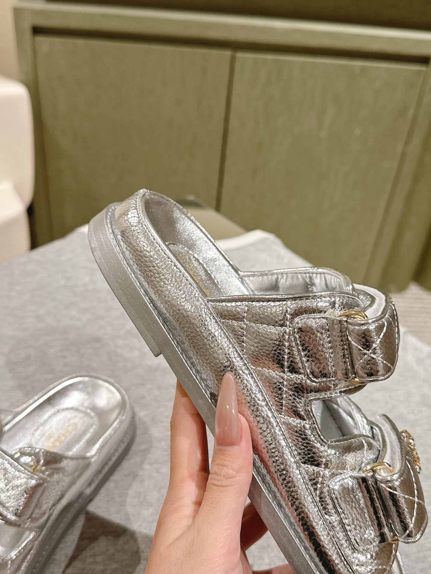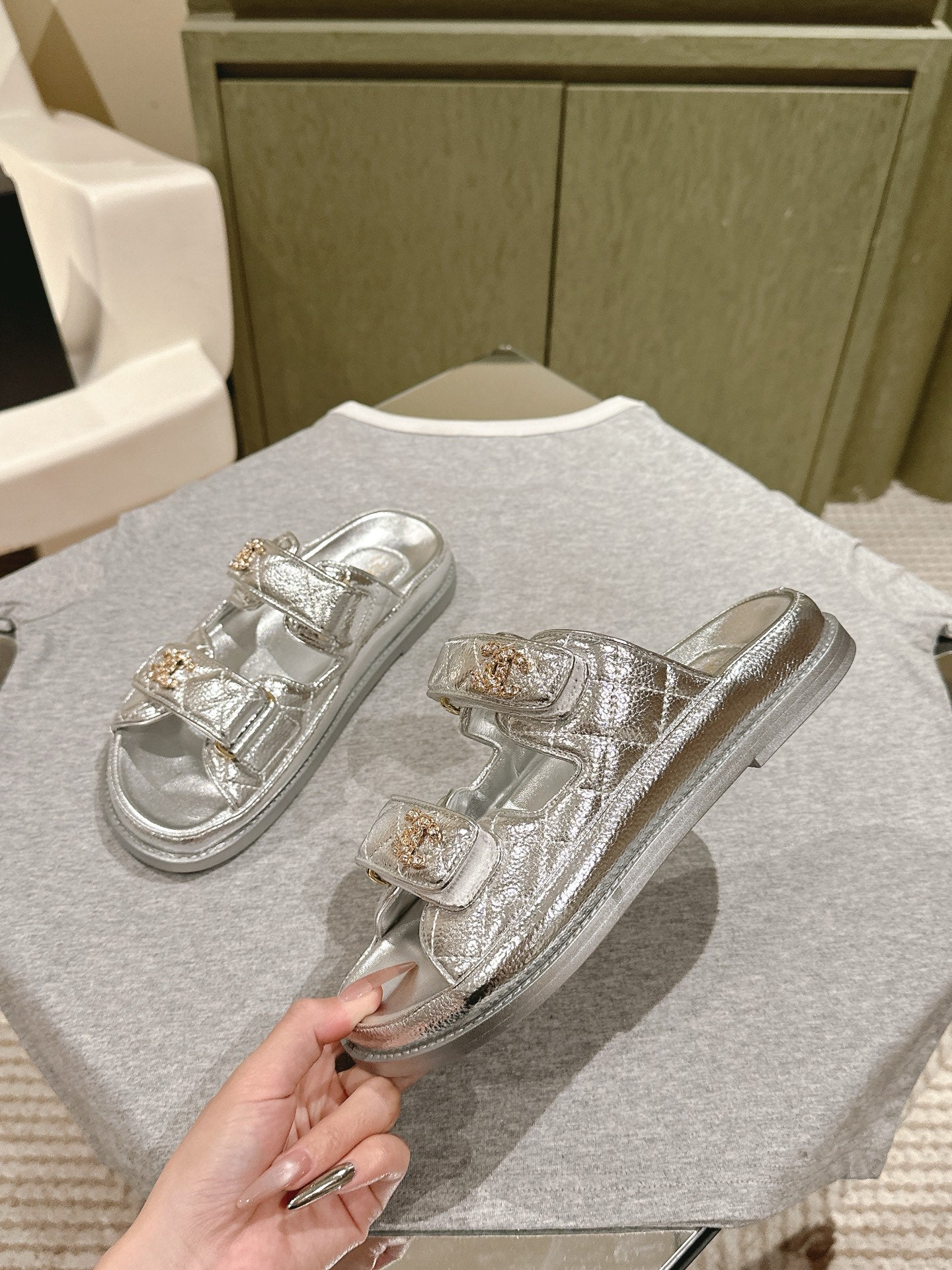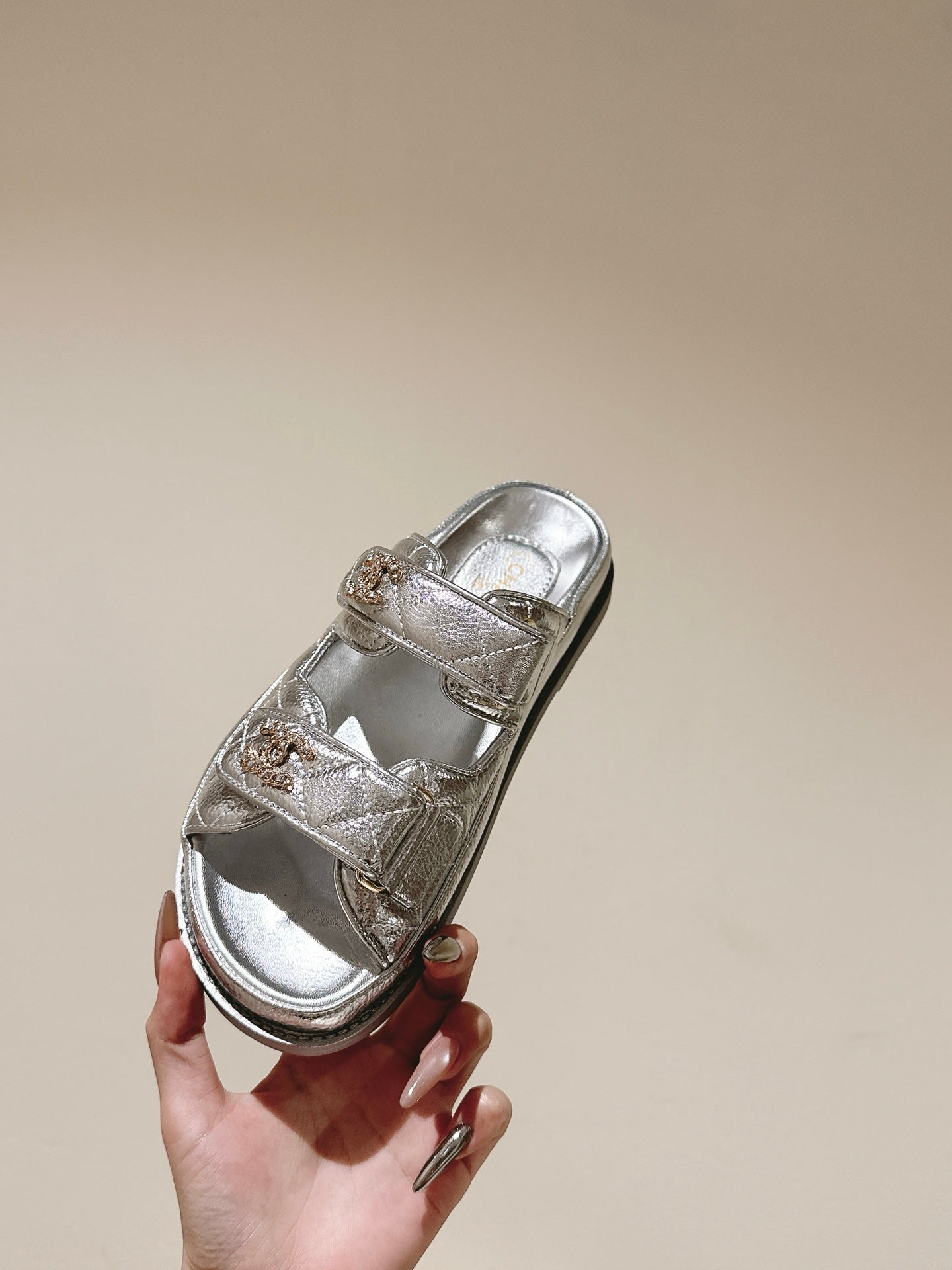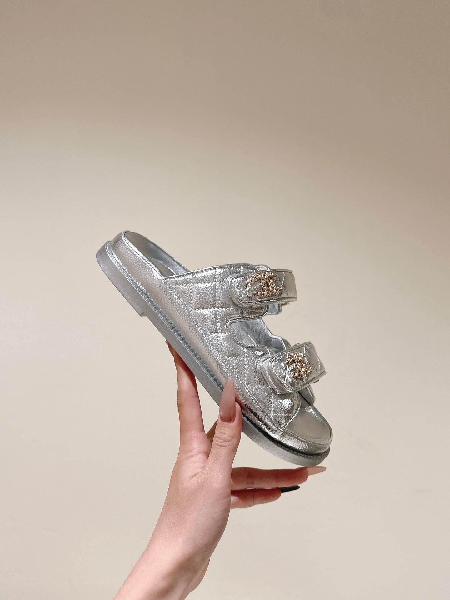 CC 25C Dad Sandals Mule Sliver Metalic Grained Calfskin 462216