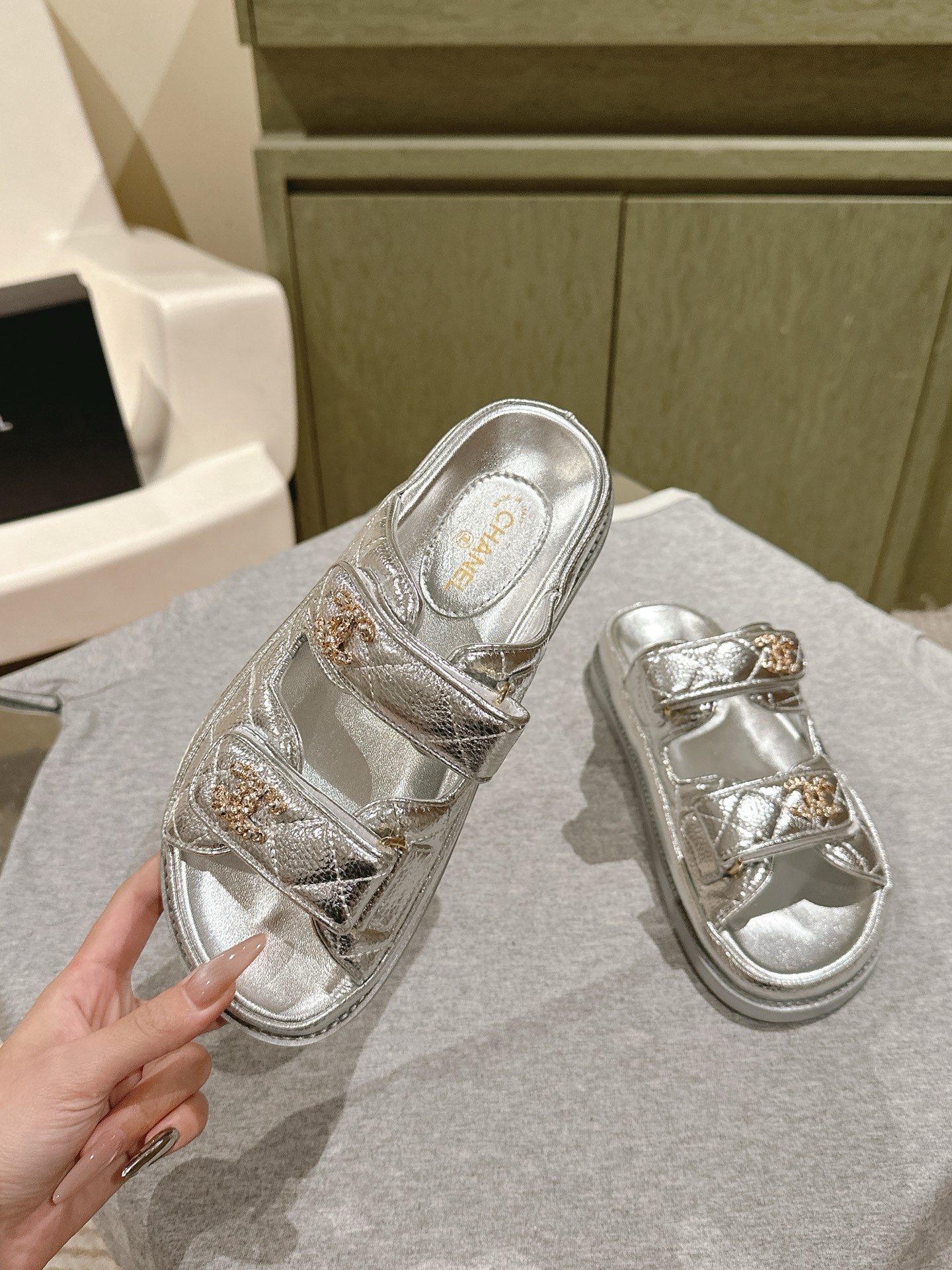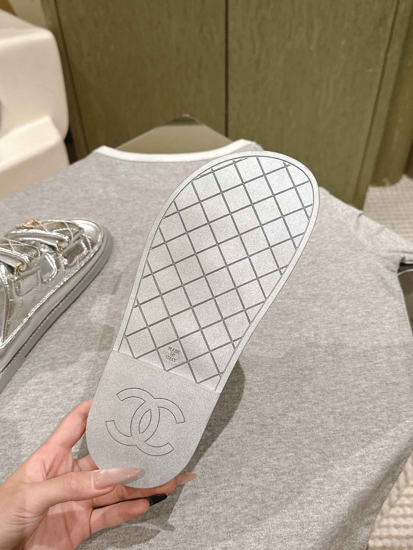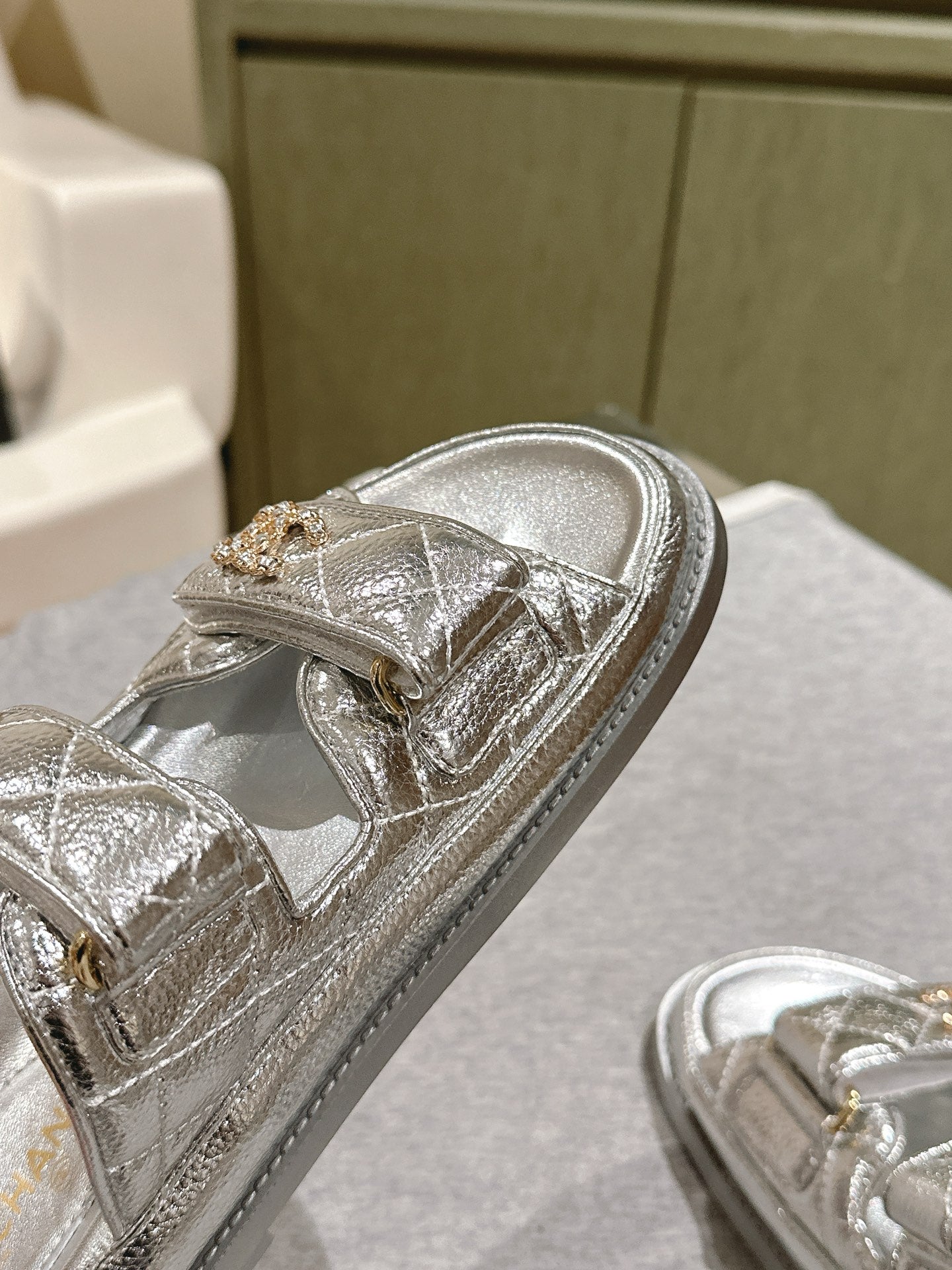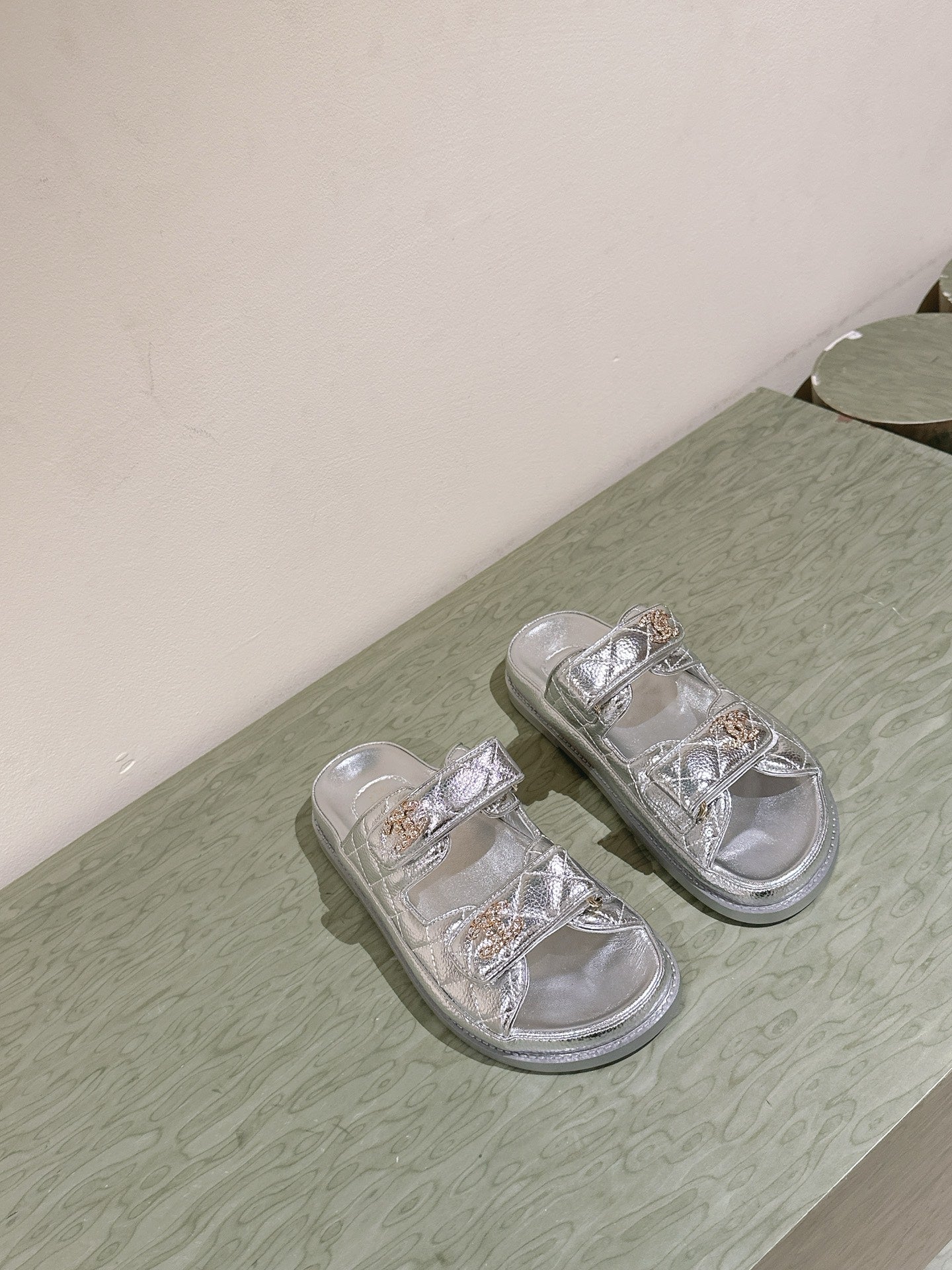 CC 25C Dad Sandals Mule Sliver Metalic Grained Calfskin 462216
