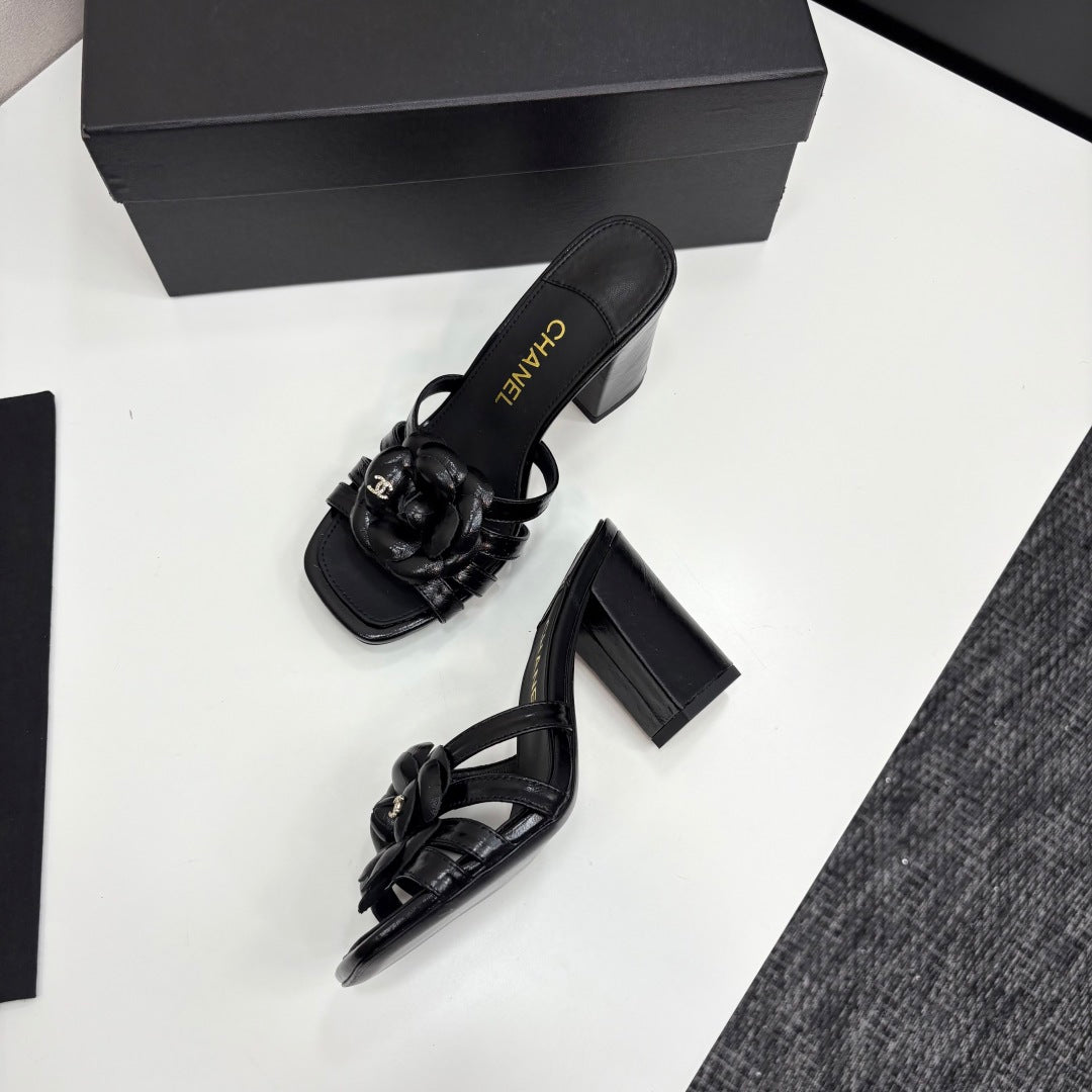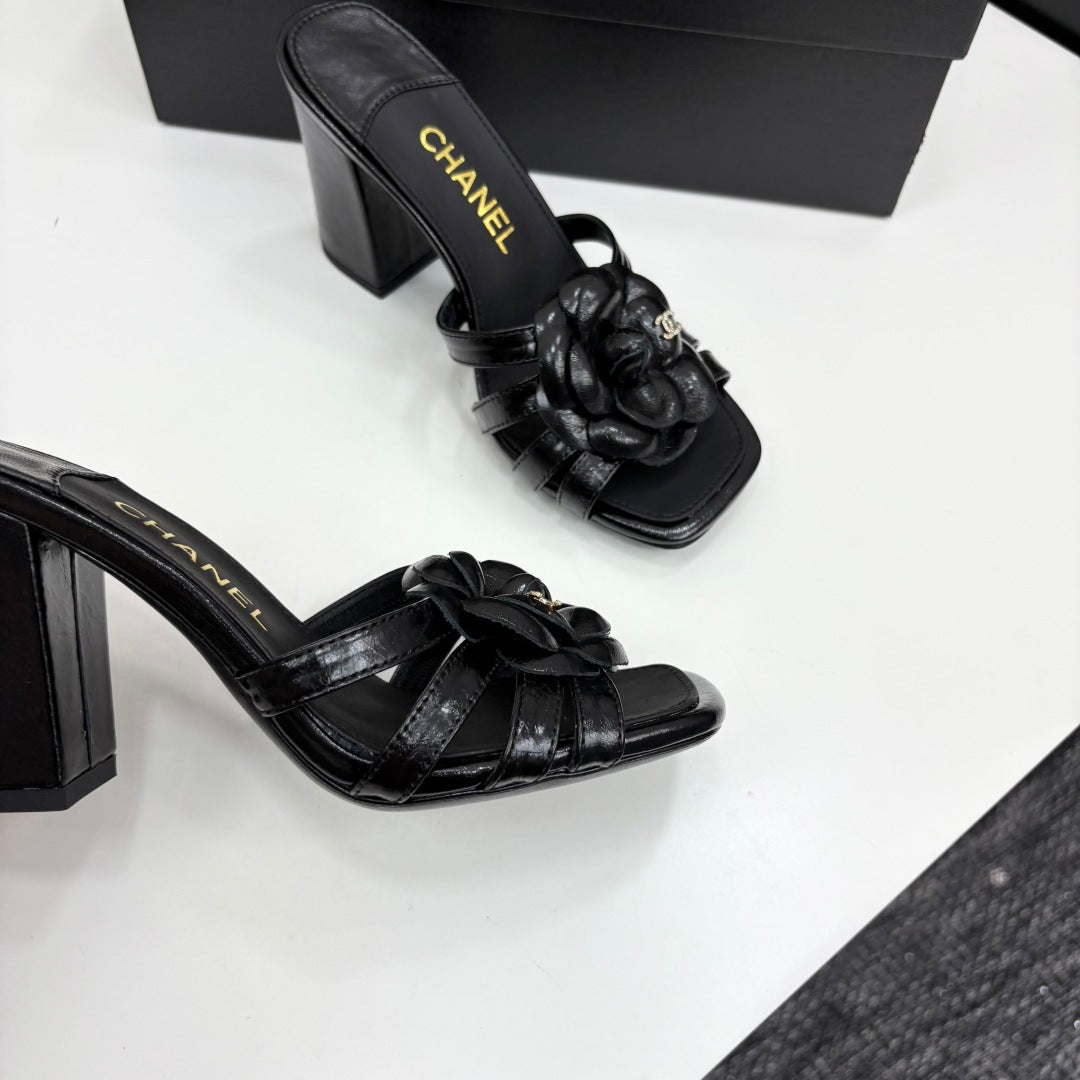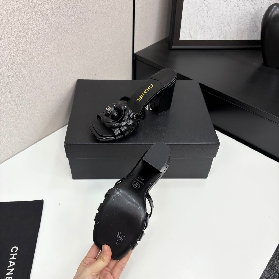 CC 25 Camellia Open Heel Mule Sandals 90mm Black Sheepskin 368843