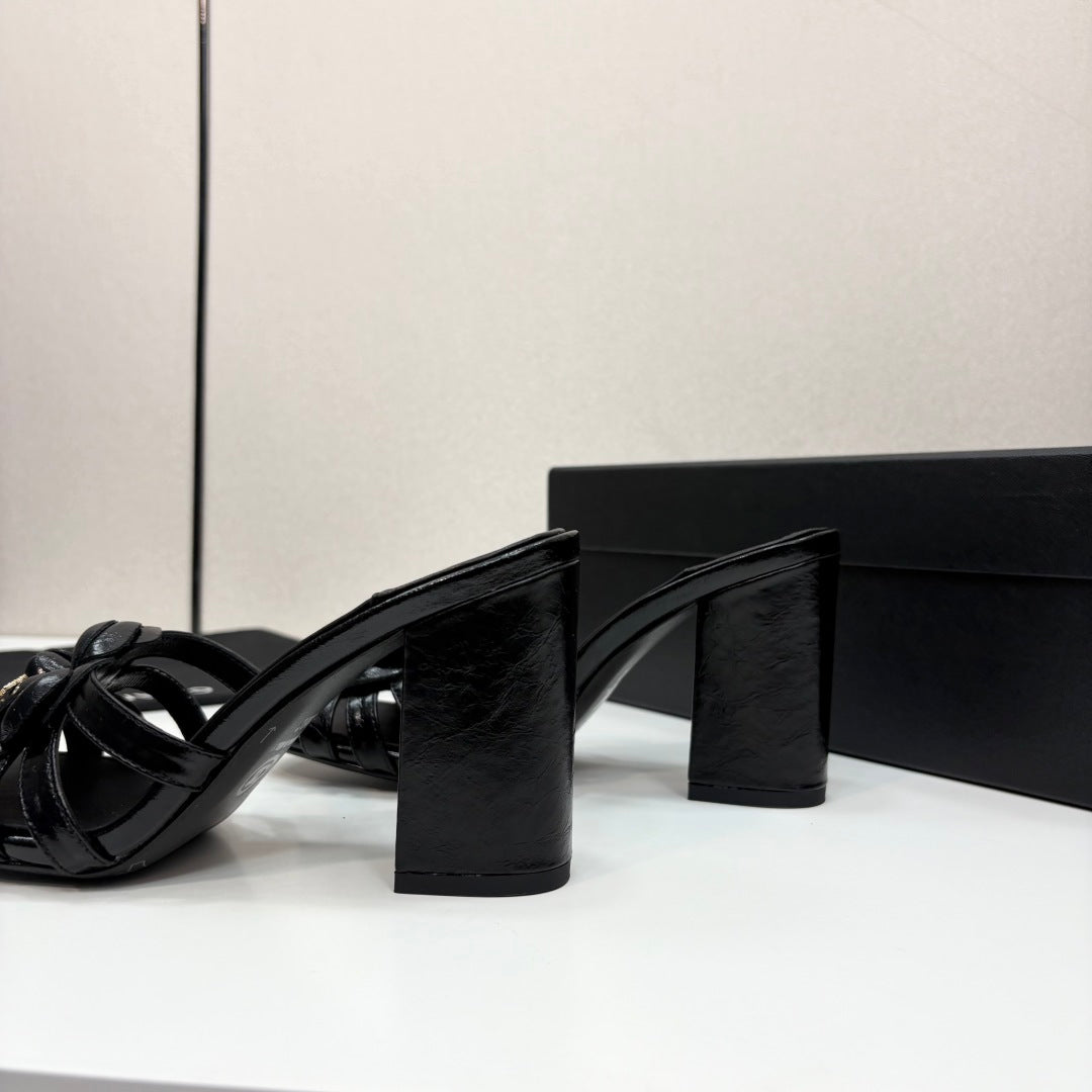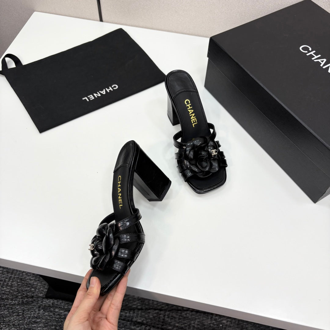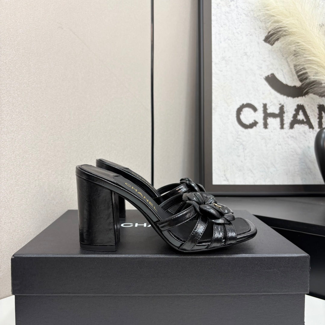 CC 25 Camellia Open Heel Mule Sandals 90mm Black Sheepskin 368843