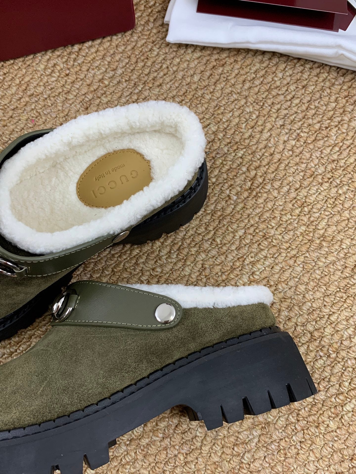 Gucci FW 25 Horsebit Suede Clog Dark Green Suede with Shearling 506446