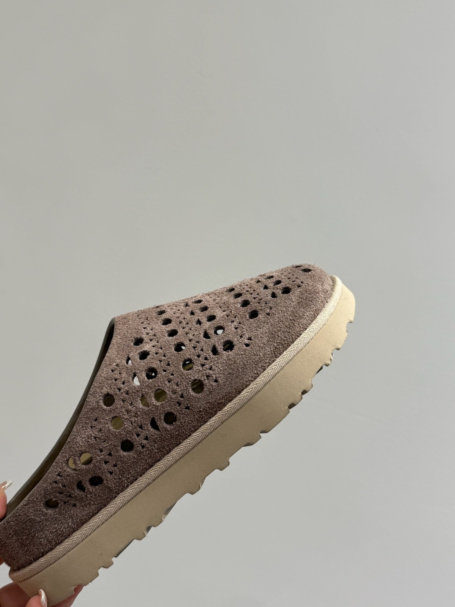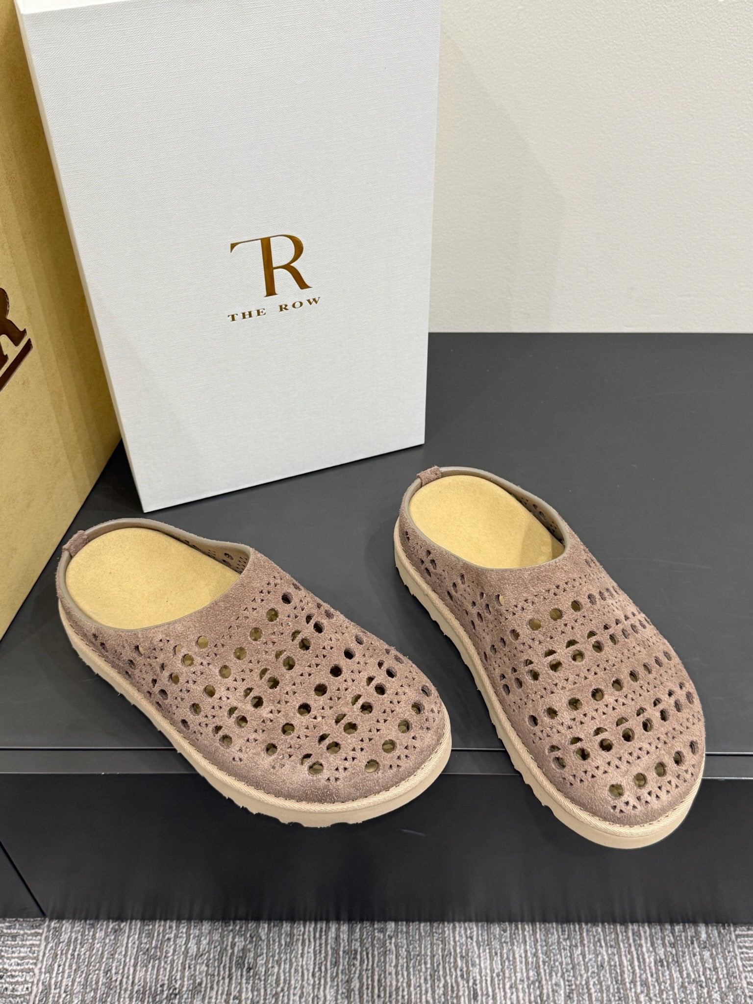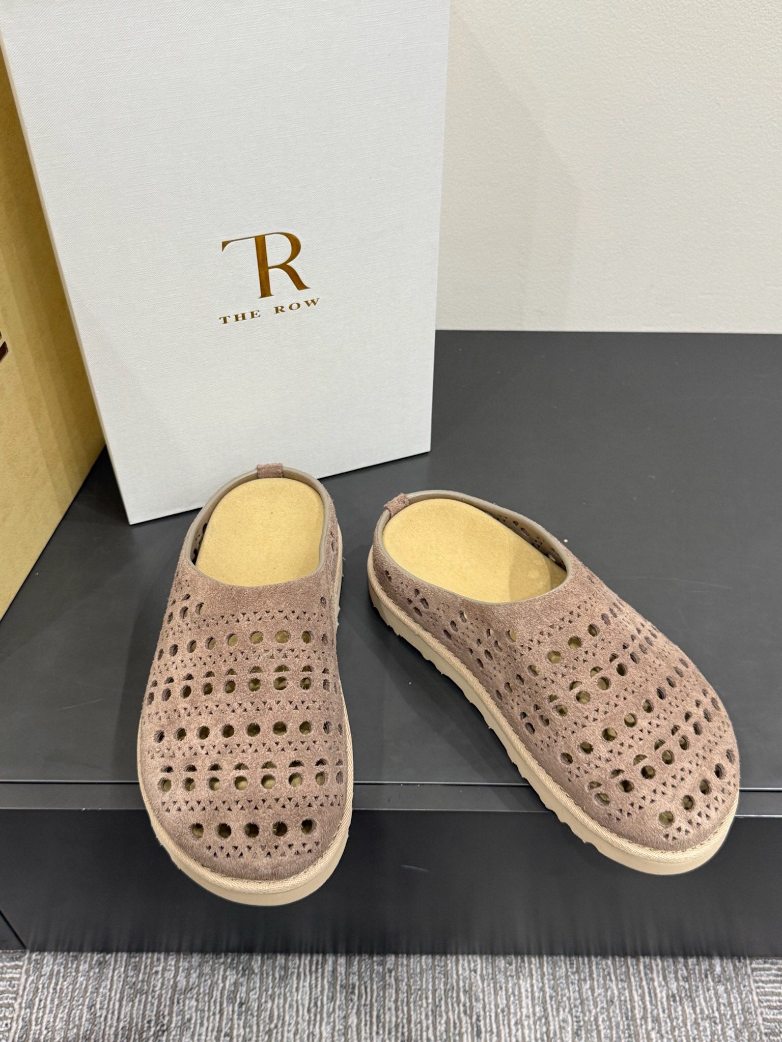 The Row Laser-cut Toe Slippers Taupe Cow Suede 337485