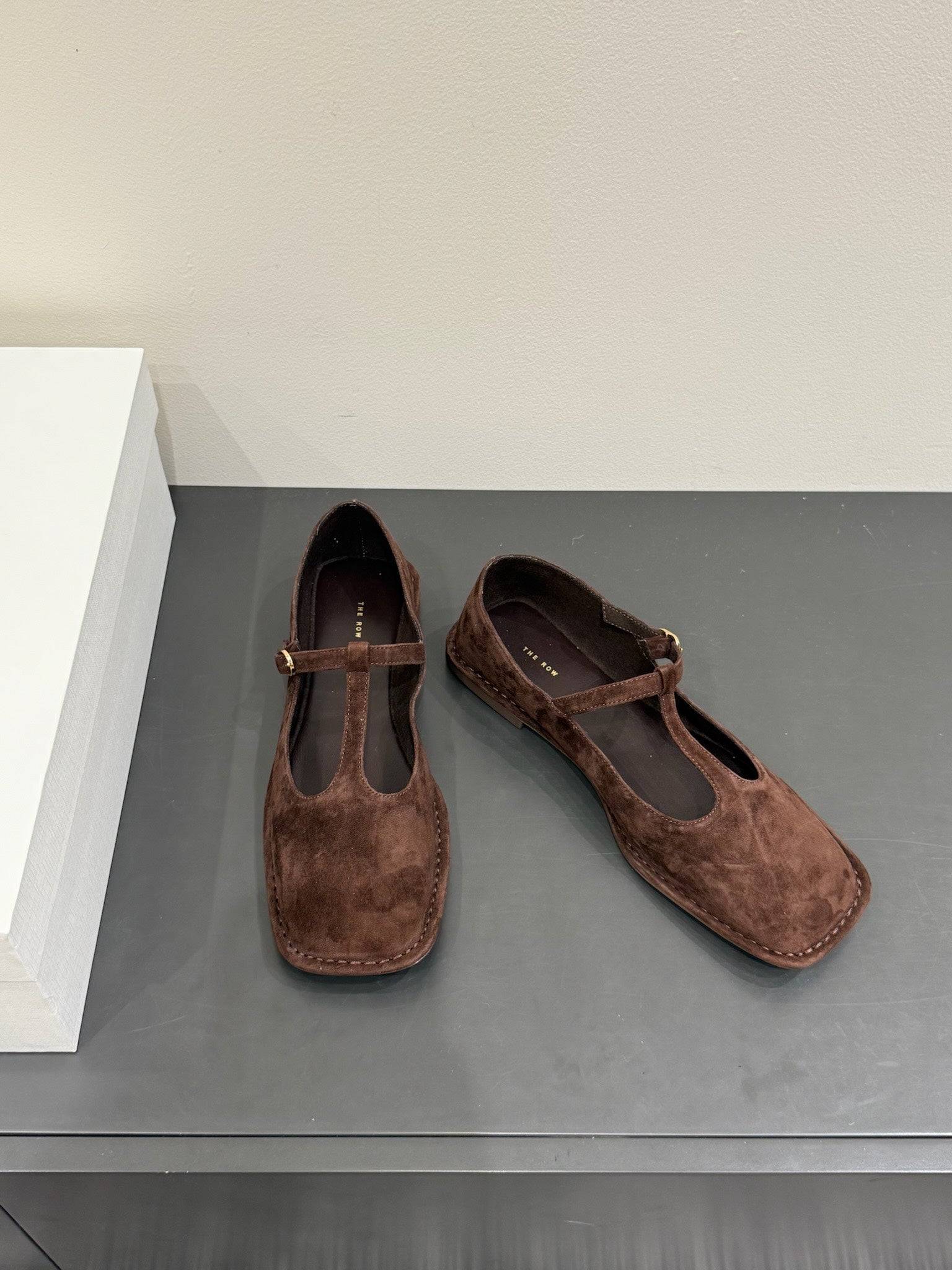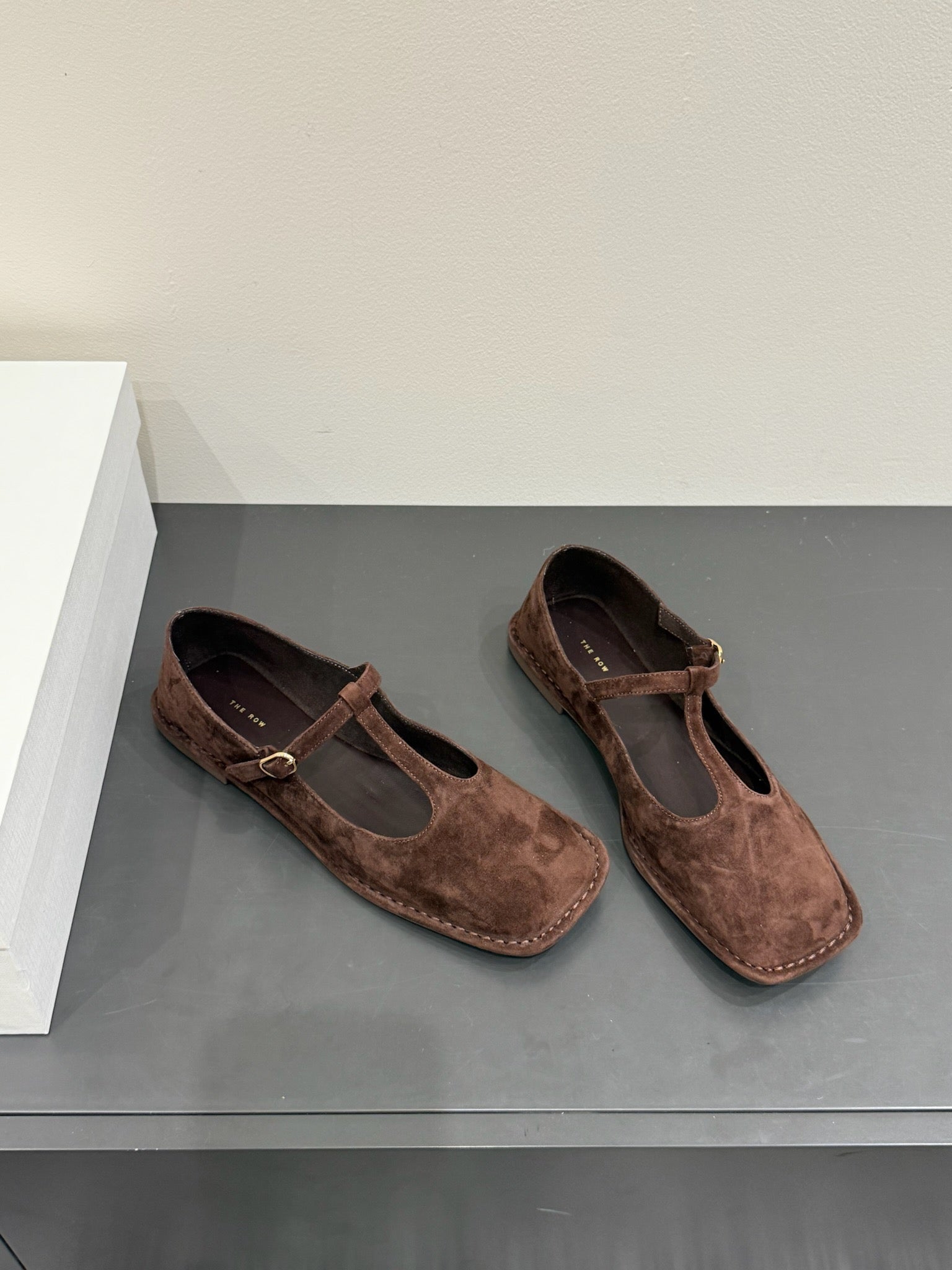 The Row Square T-Strap Flat Dark Brown Suede 337499