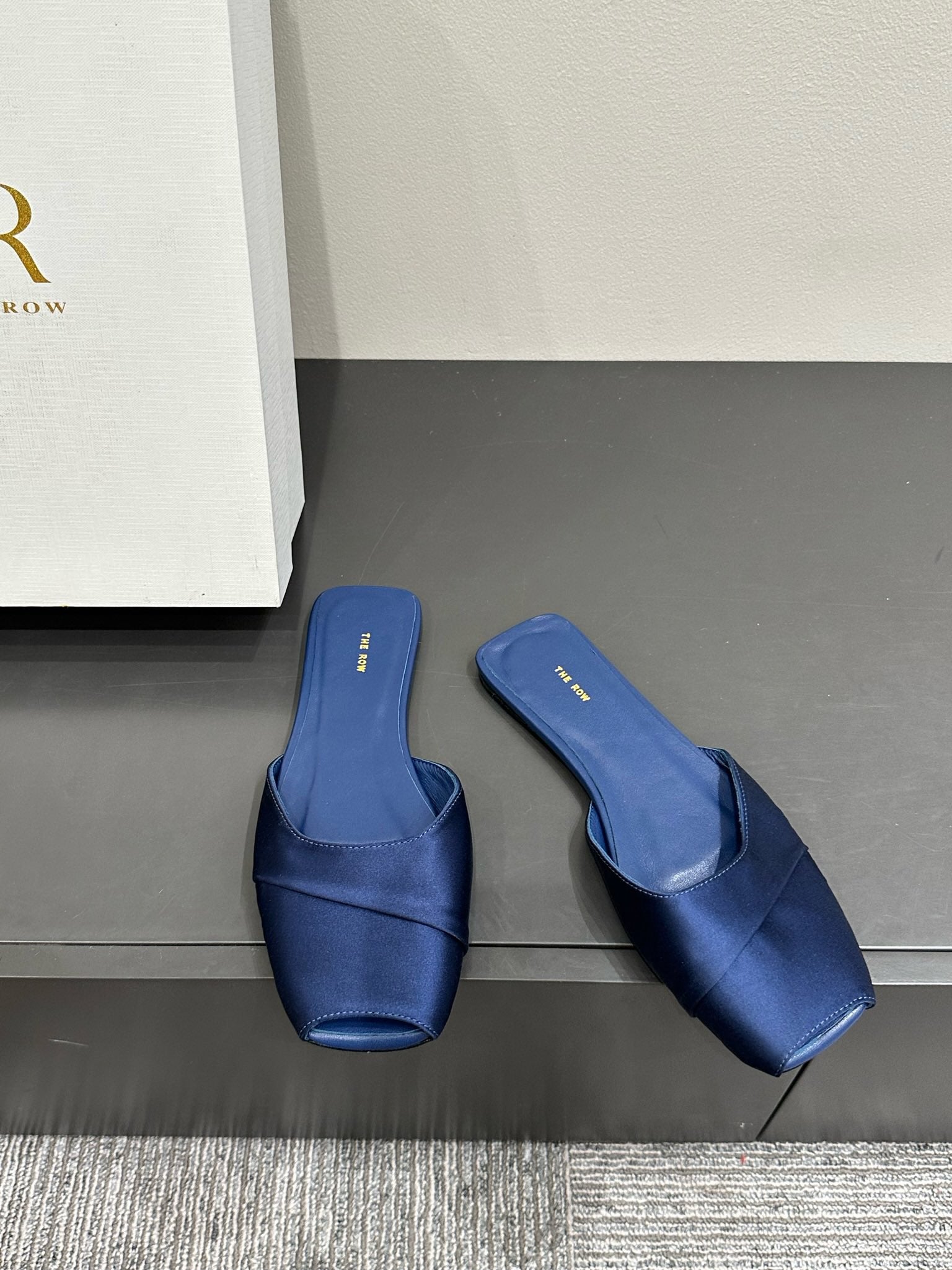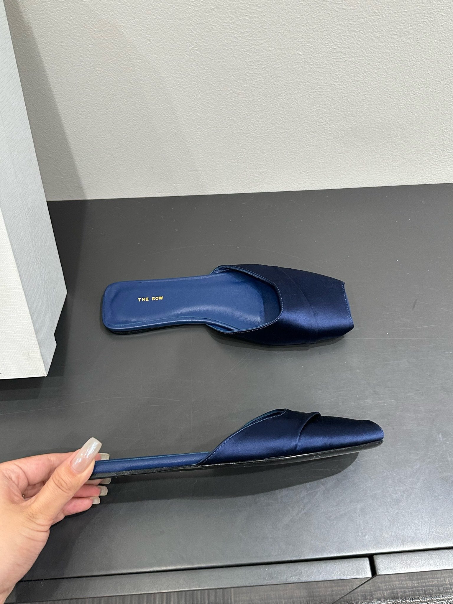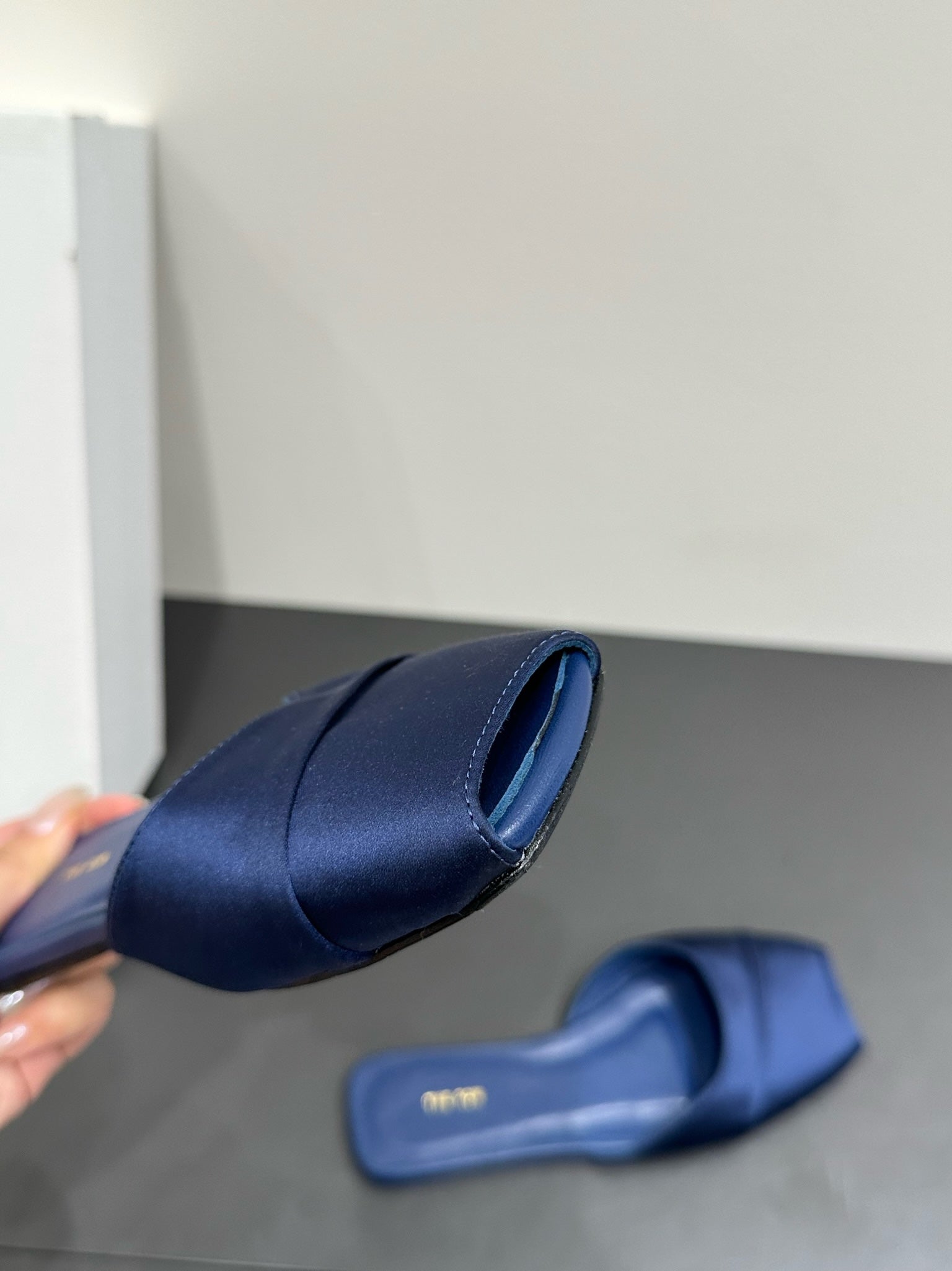The Row Mule Sandal Navy Blue Satin And Sheepskin Lining 337504