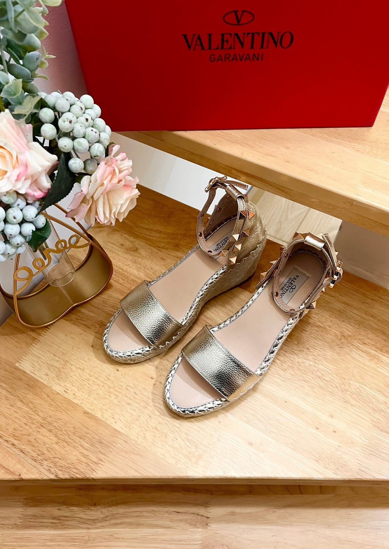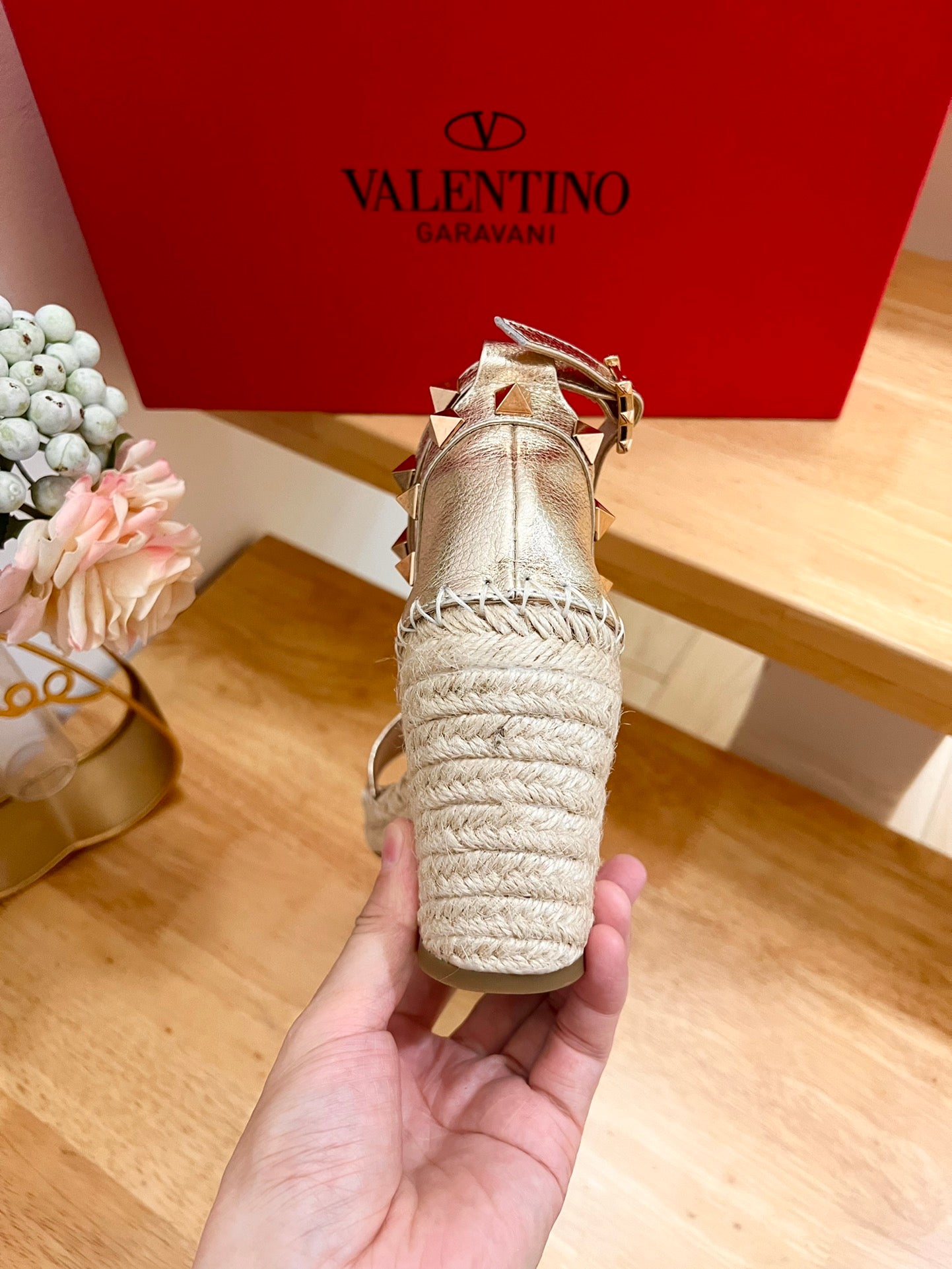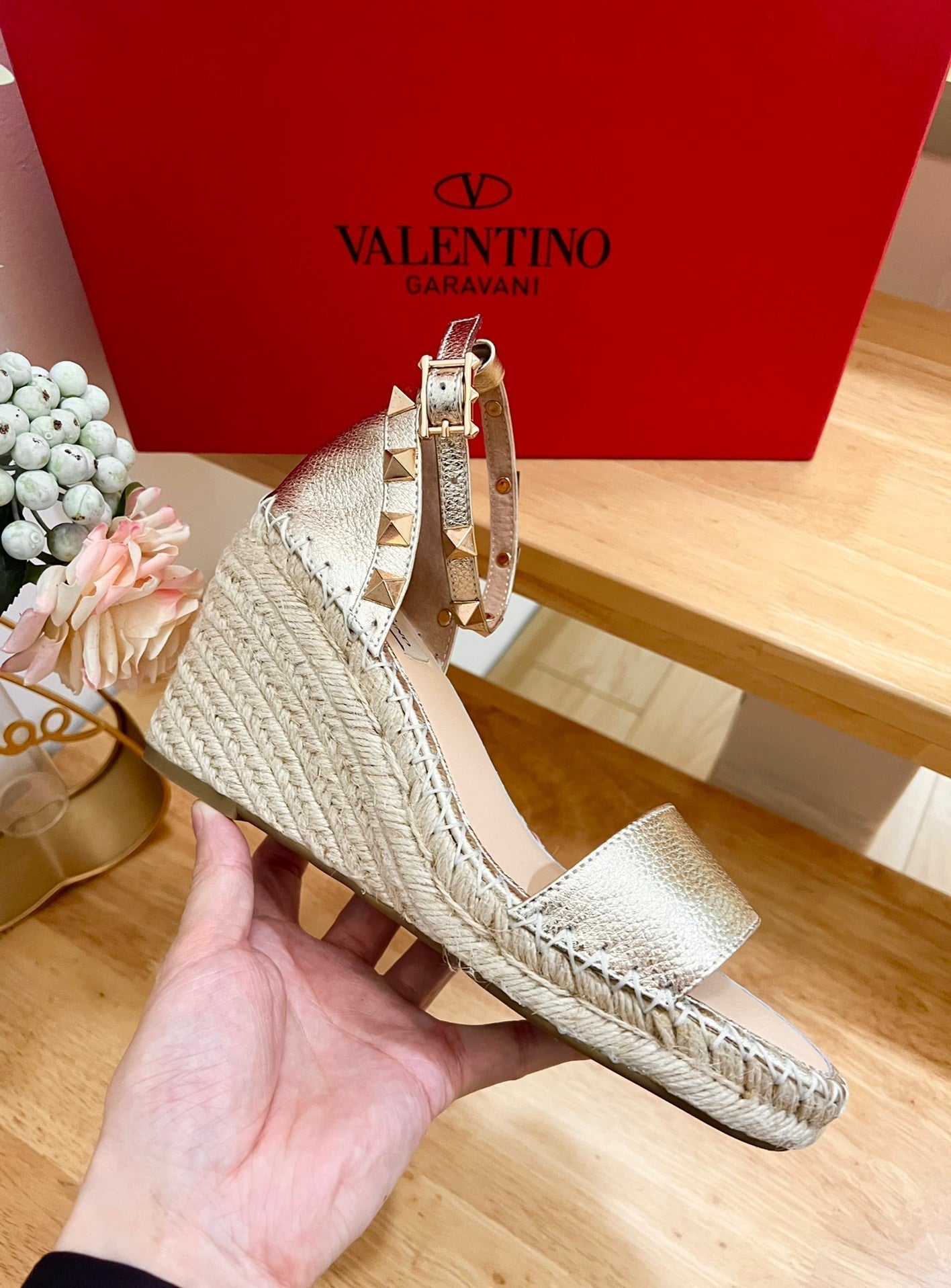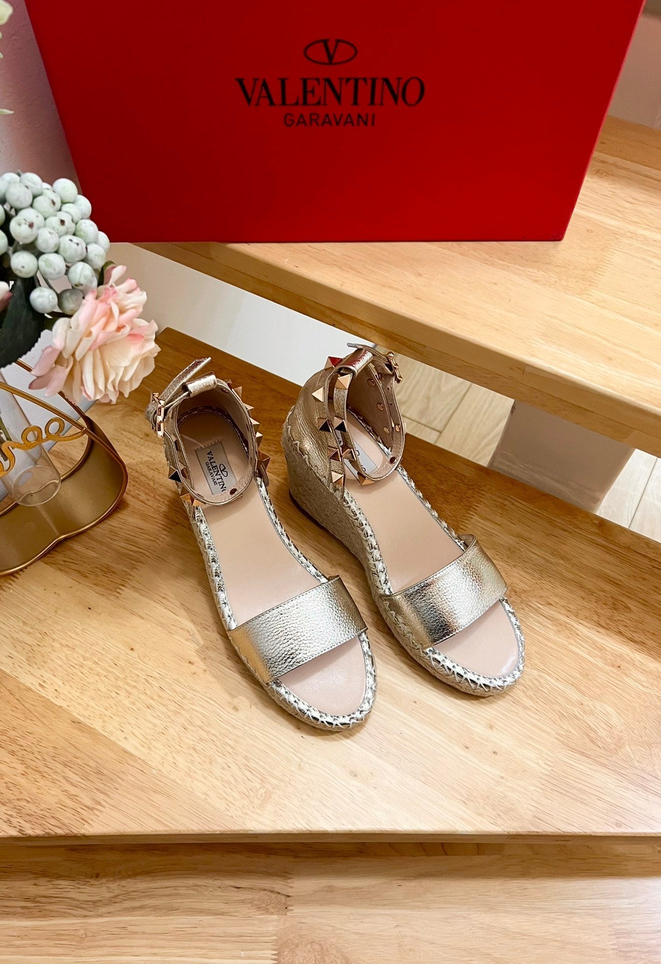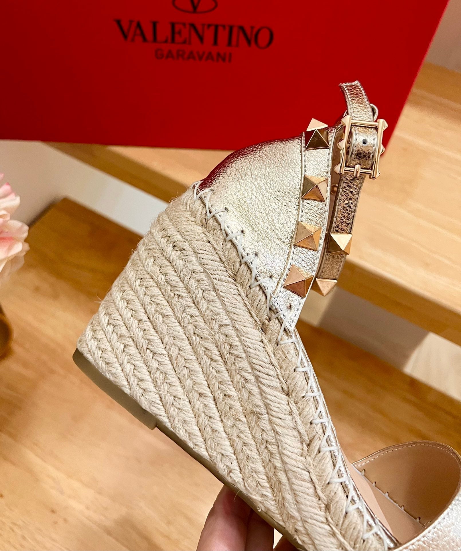 Double Rockstud Grainy Calfskin Wedge Sandal In Light Yellow Metallic Cowhide And Raffia 852839