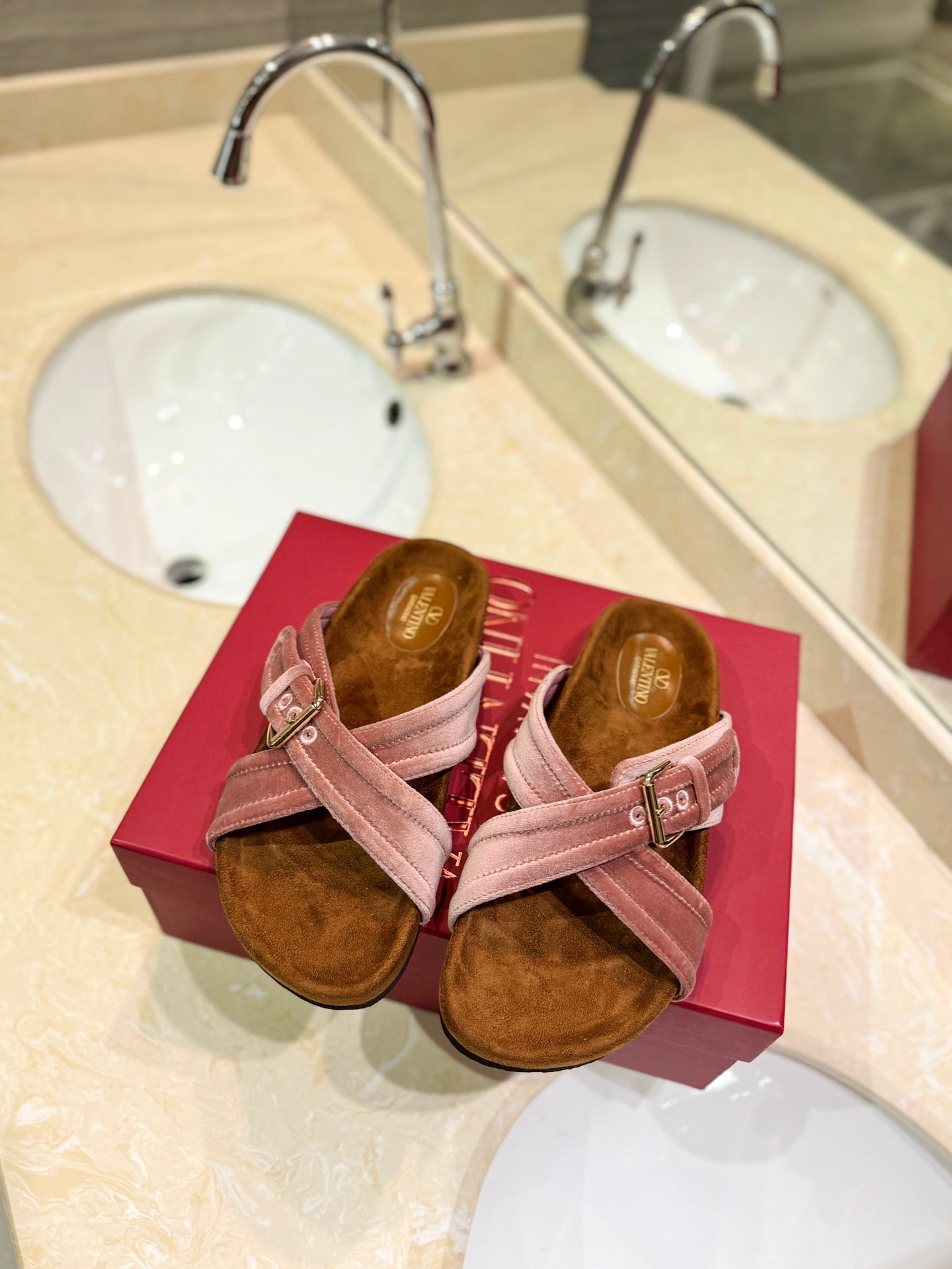 FUSSFRIEND CREPE PINK SILK VELVET SLIDE SANDALS
