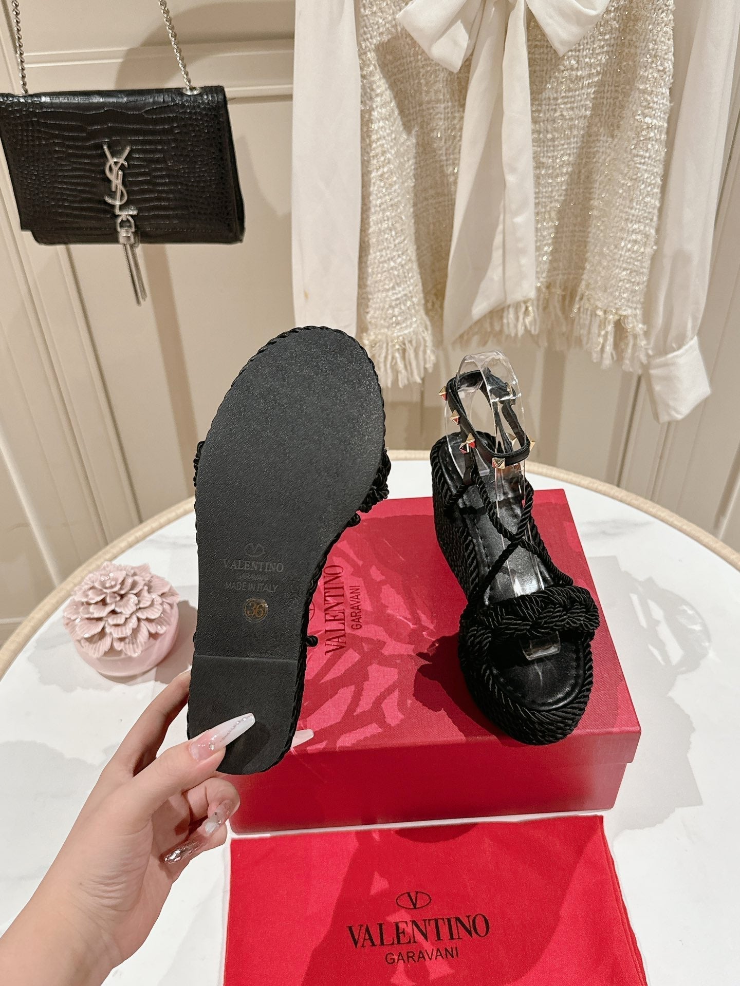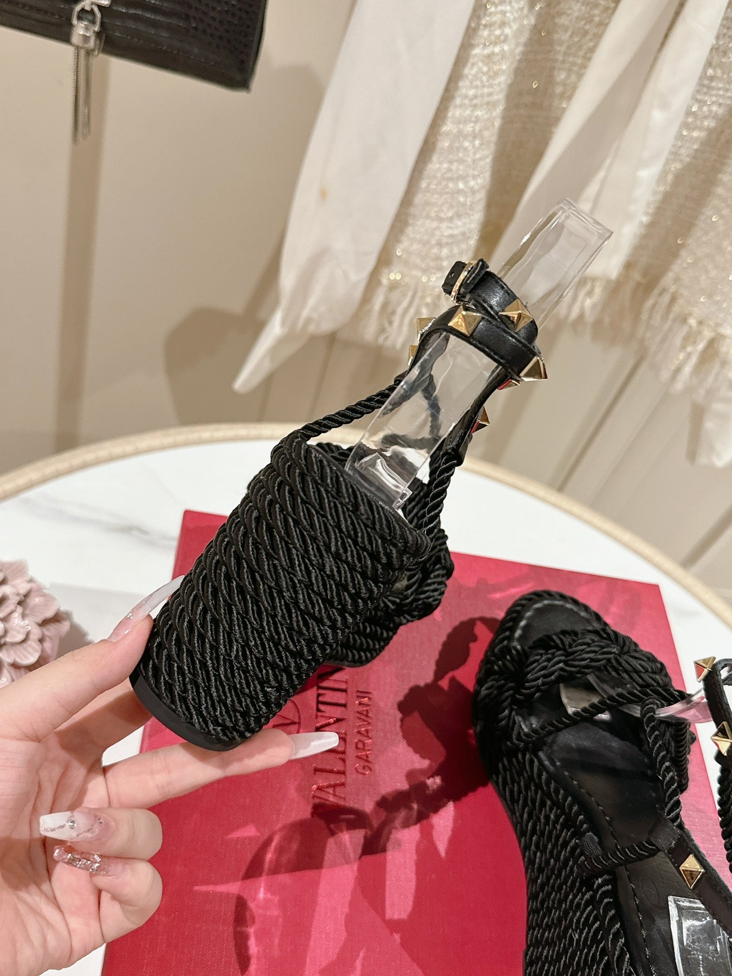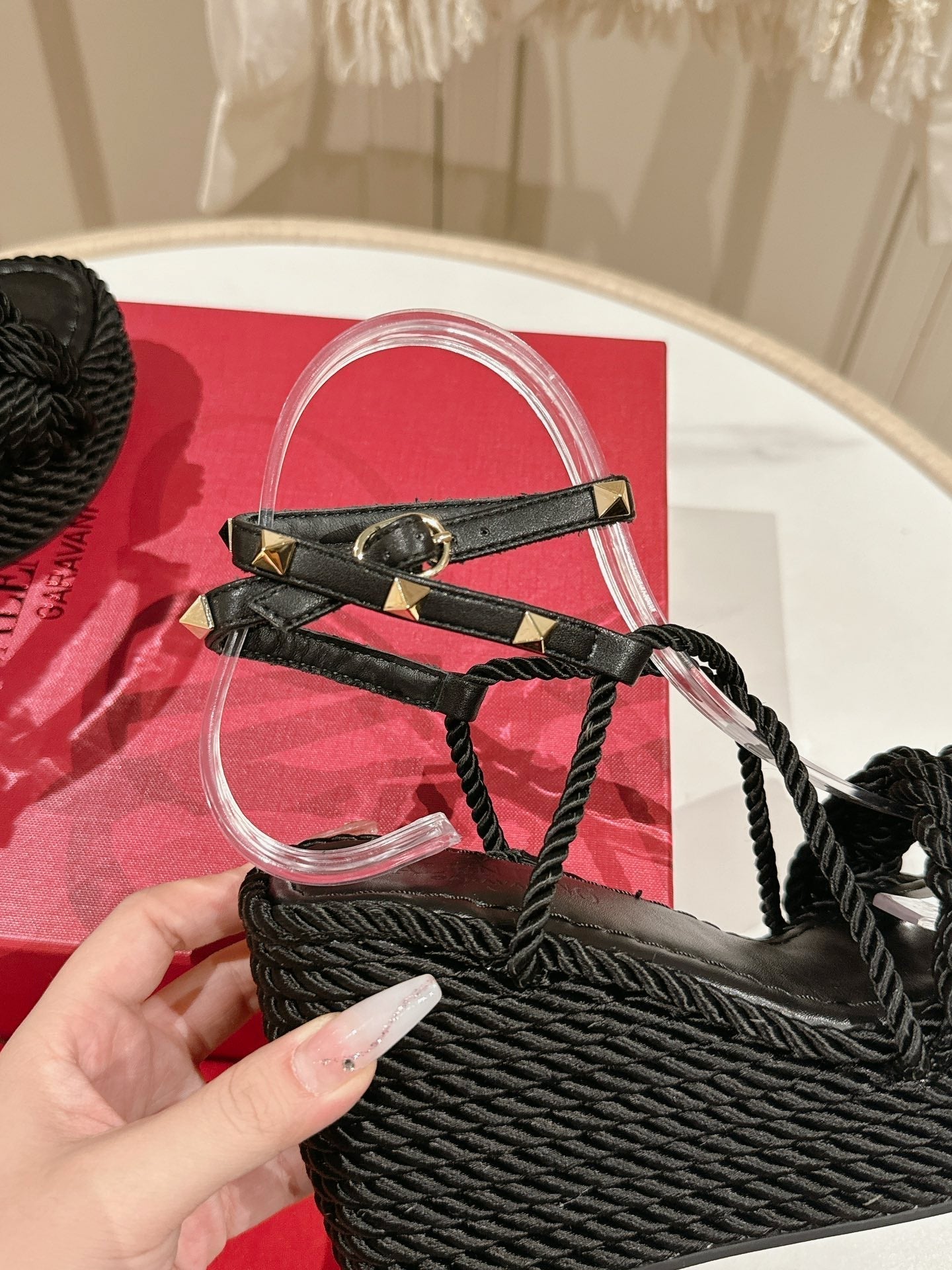Garavani Rockstud Wedge Sandals 100mm In Black Calfskin And Nylon Rope 829395