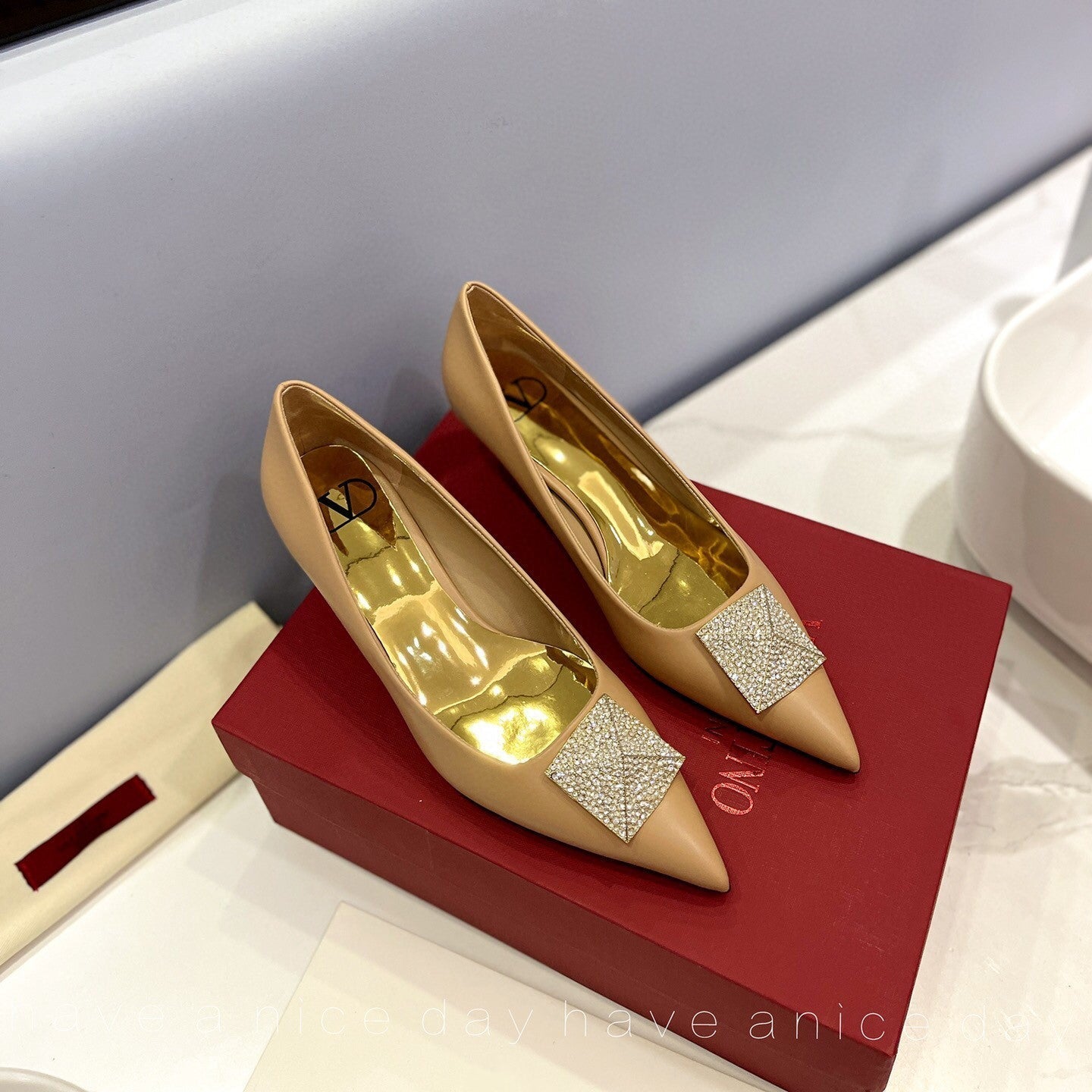 One Stud Diamond Patent Beige Leather Pump