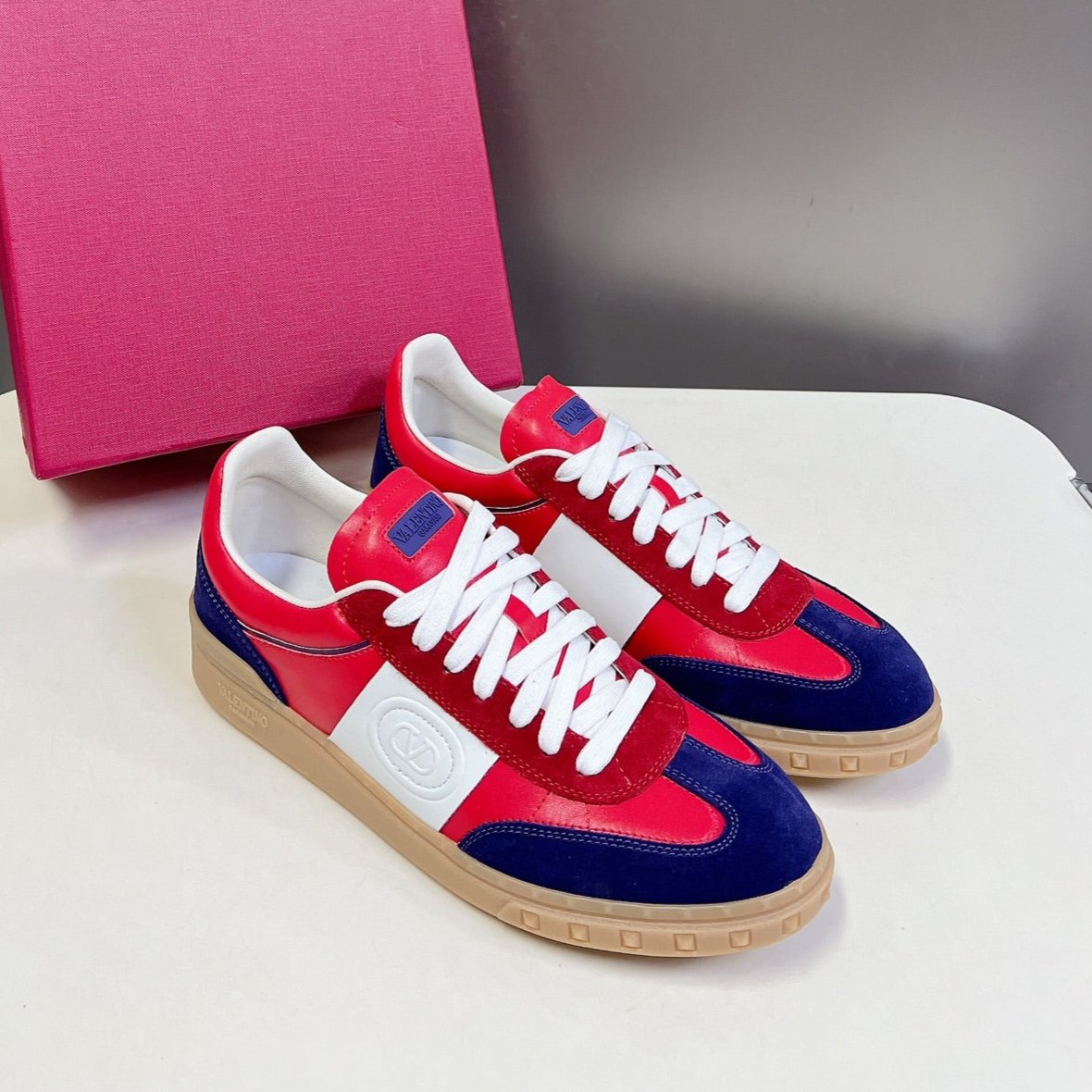 Upvillage Trainer In Red Mix Deep Blue Laminated Calfskin With Suede 989608