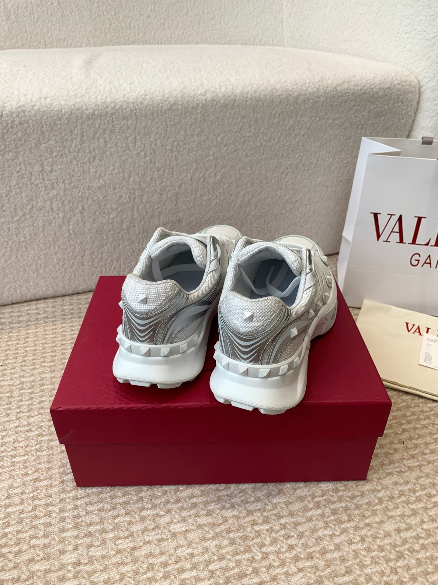 Valentino Sneaker 50mm In White Mix Grey Blue Mesh Fabric And Cowhide 814274
