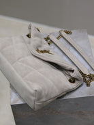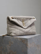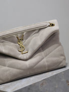 PUFFER BAG 29 IN OYSTER TAN SUEDE GOLD HARDWARE