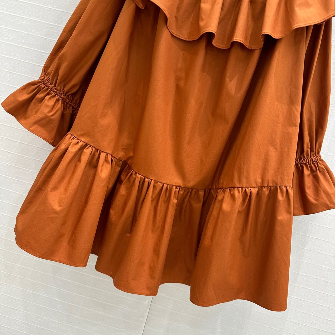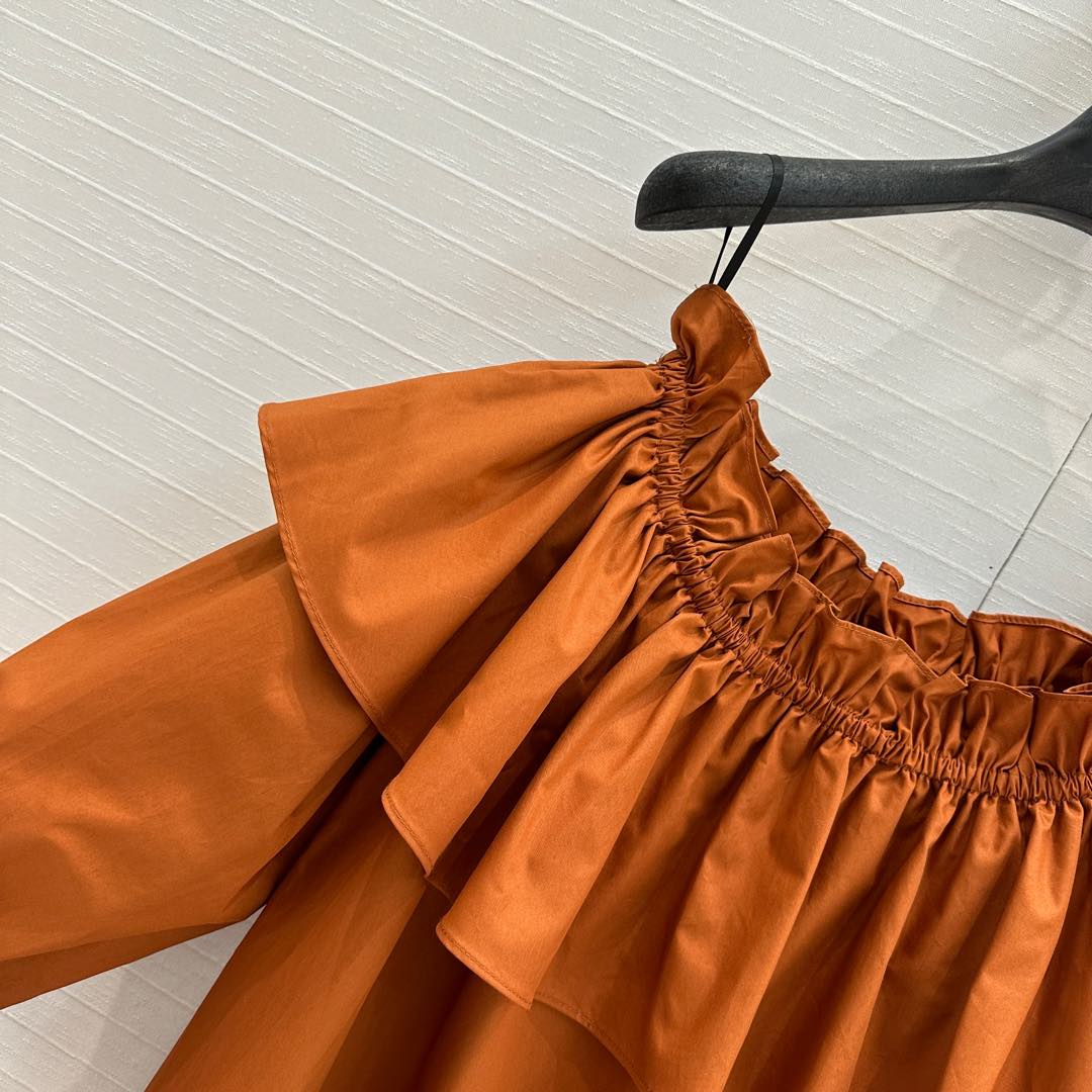 YSL One-shoulder Drawstring Puff Sleeve Dress Caramel Cotton