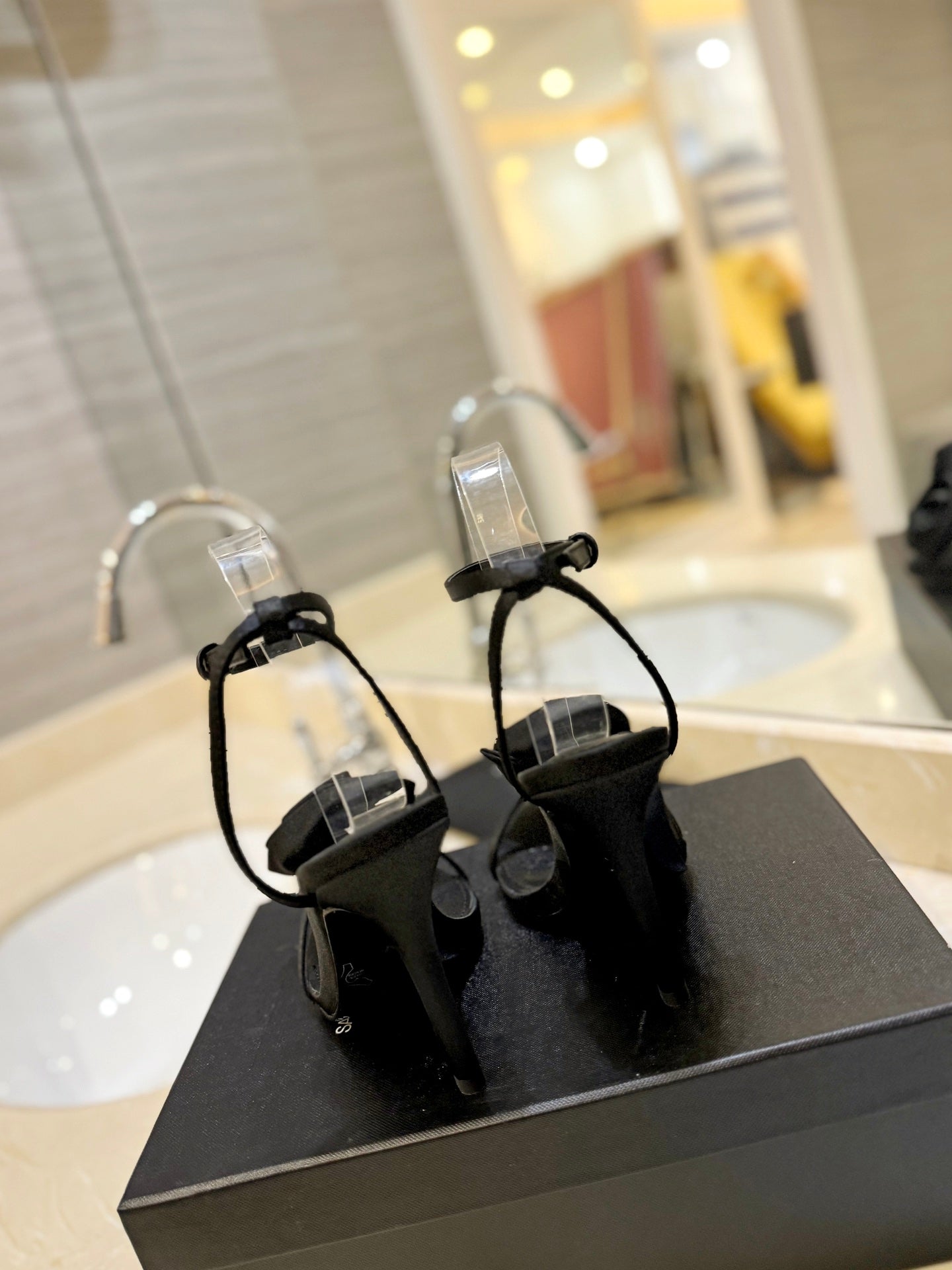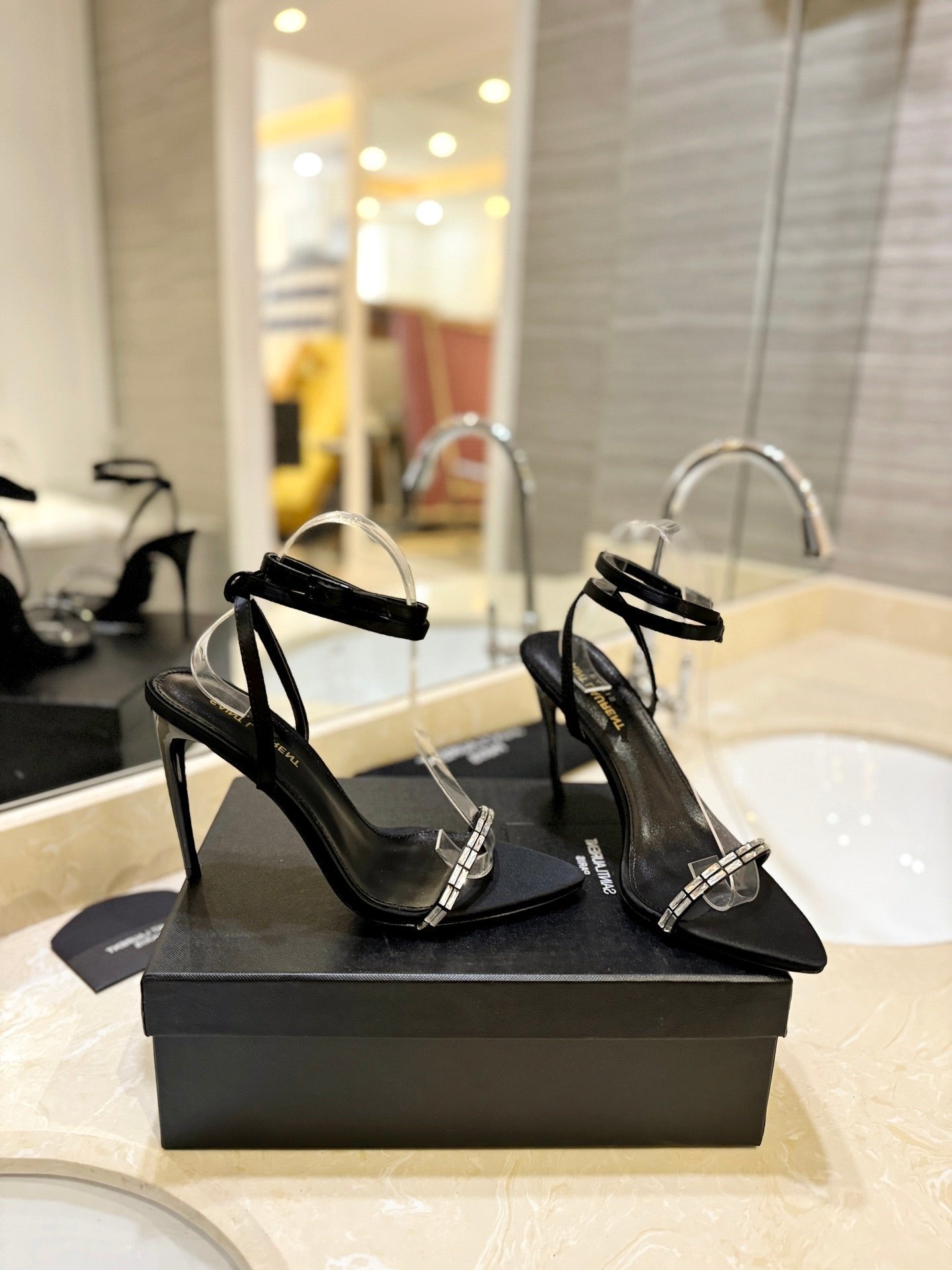 SL RHINESTONE HEELED SANDALS BLACK SATIN