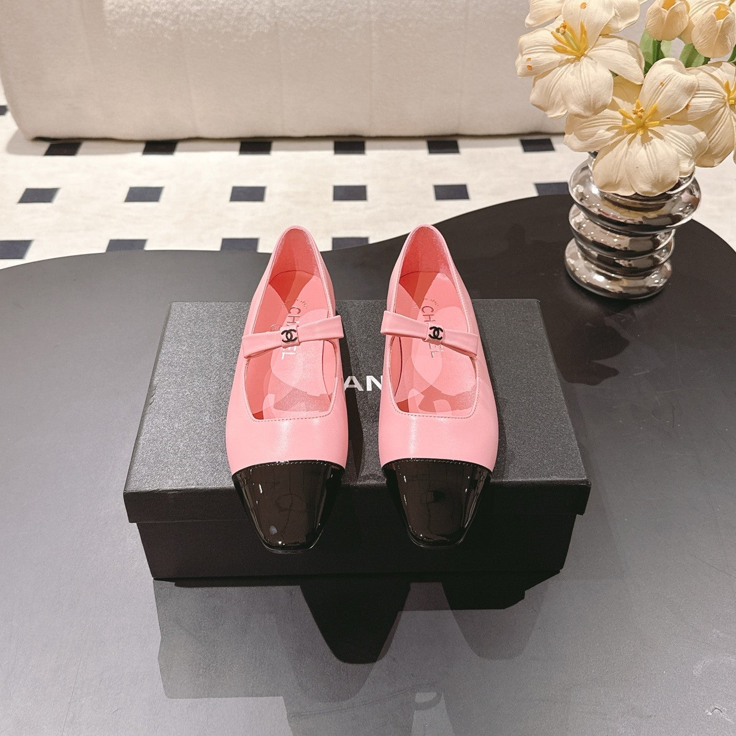 CC 25B Small Bow Buckle Ballet Flats 10mm Black Pink Sheepskin Patent Leather 415746