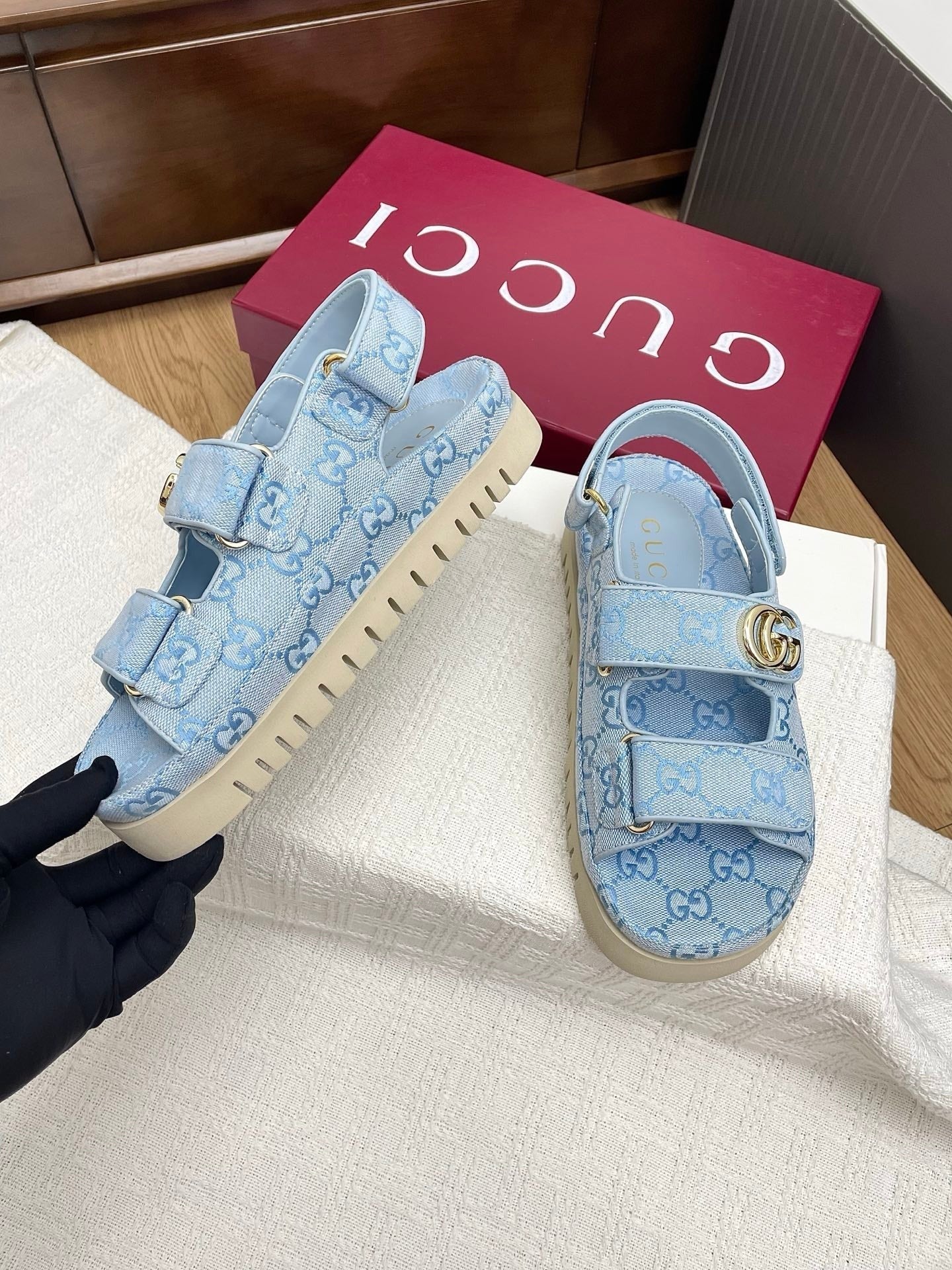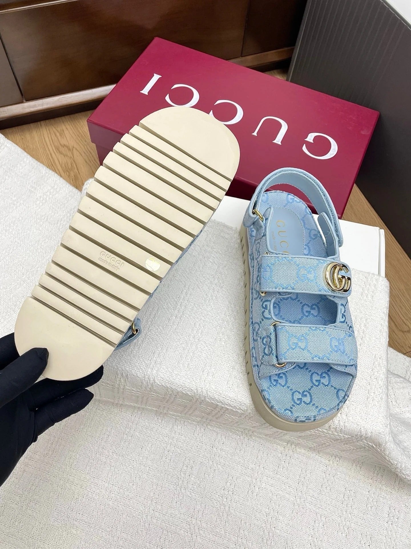 GG CLASSIC SANDALS 25S IN SKY BLUE FABRIC WITH GOLD HARDWARE