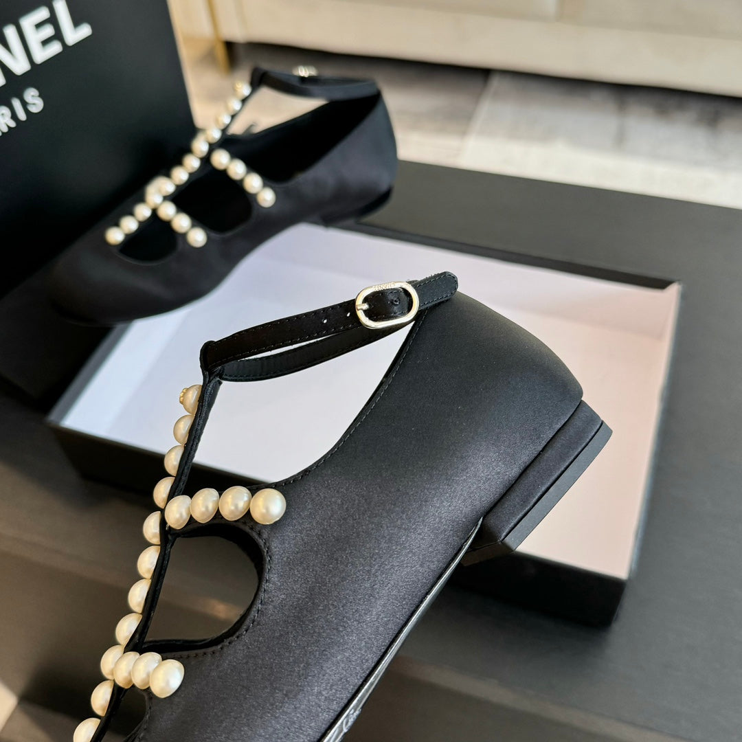 MARY JANES SHOES BLACK GOATSKIN WITH FAUX PEARL